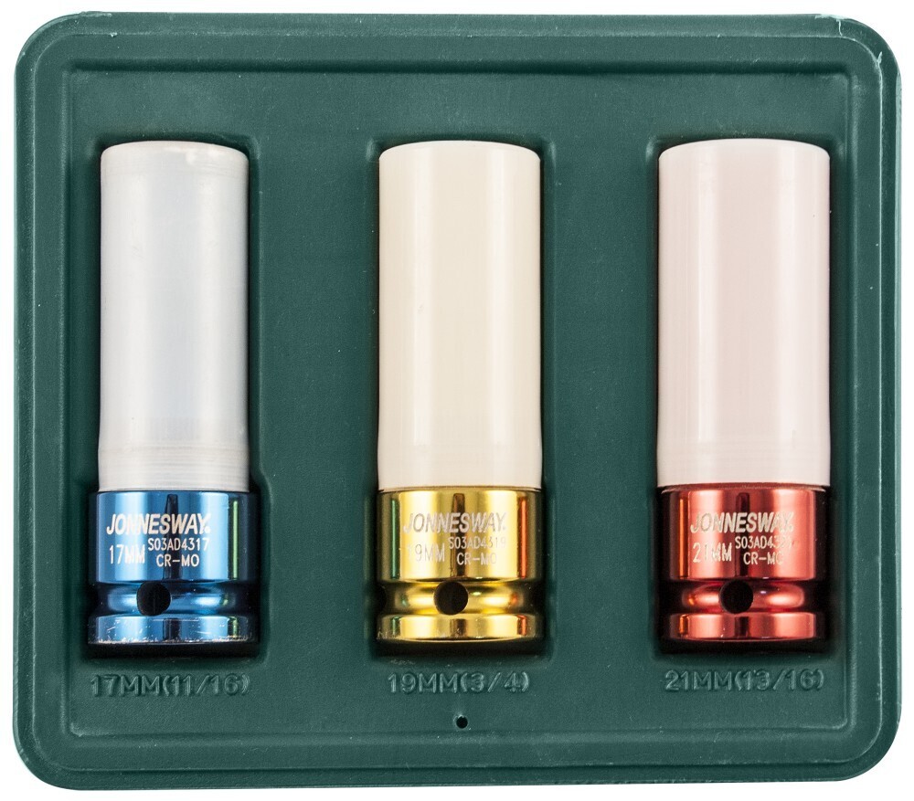 Содержание: - 1/2"DR: Головки торцевые ударные глубокие, 3 шт.: 17, 19, 21 мм.; - Пластиковый кейс.