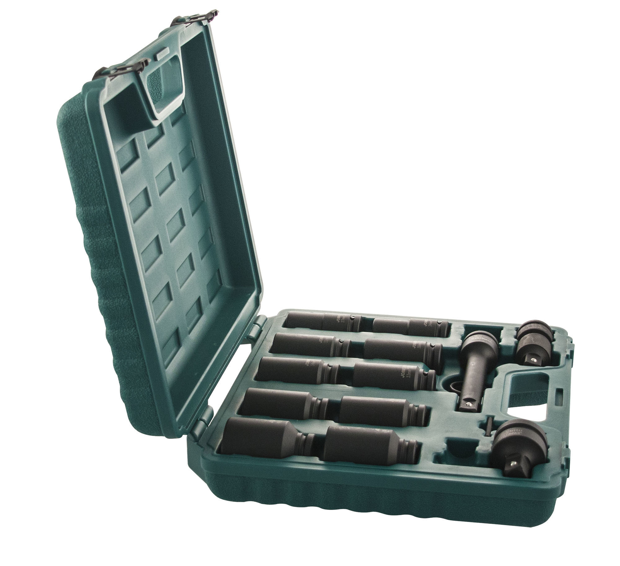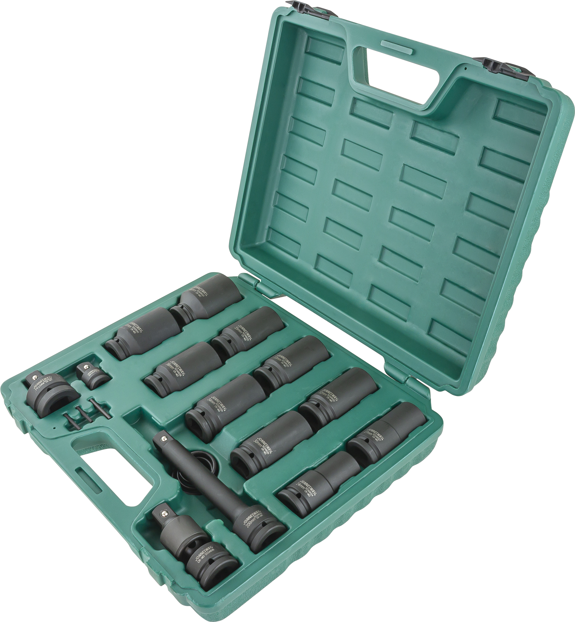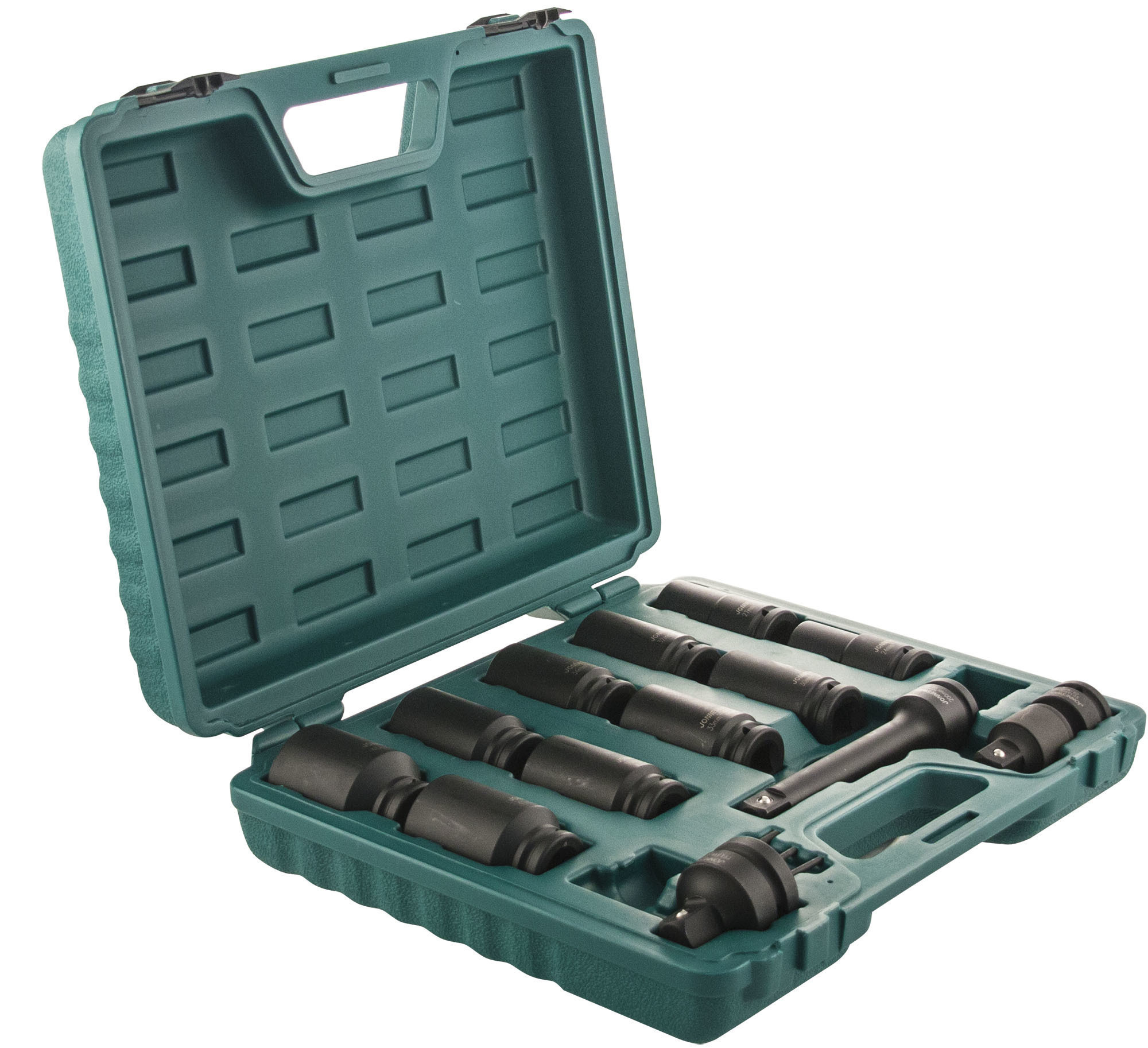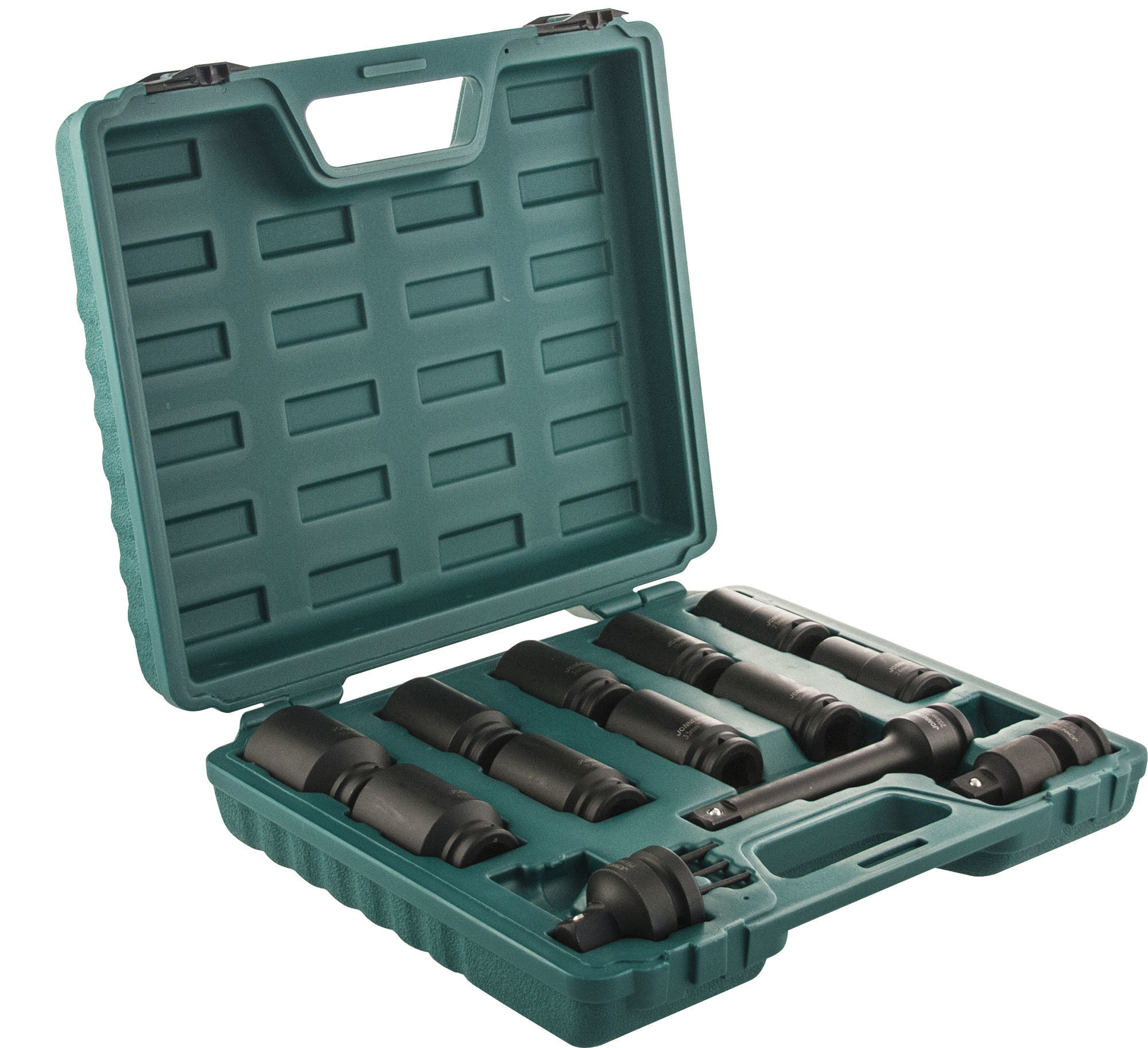 Содержание: 3/4''DR: Головки торцевые ударные глубокие 10 шт.: 24, 27, 30, 32, 33, 34, 35, 36, 41, 46 мм.; Удлинитель 200 мм.; Шарнир карданный 1 шт.; Адаптеры 2 шт.: 1''DR х 3/4''DR и 1/2''DR х 3/4''DR; Кольца 3 шт.; Штифты 3 шт.; Пластиковый кейс.