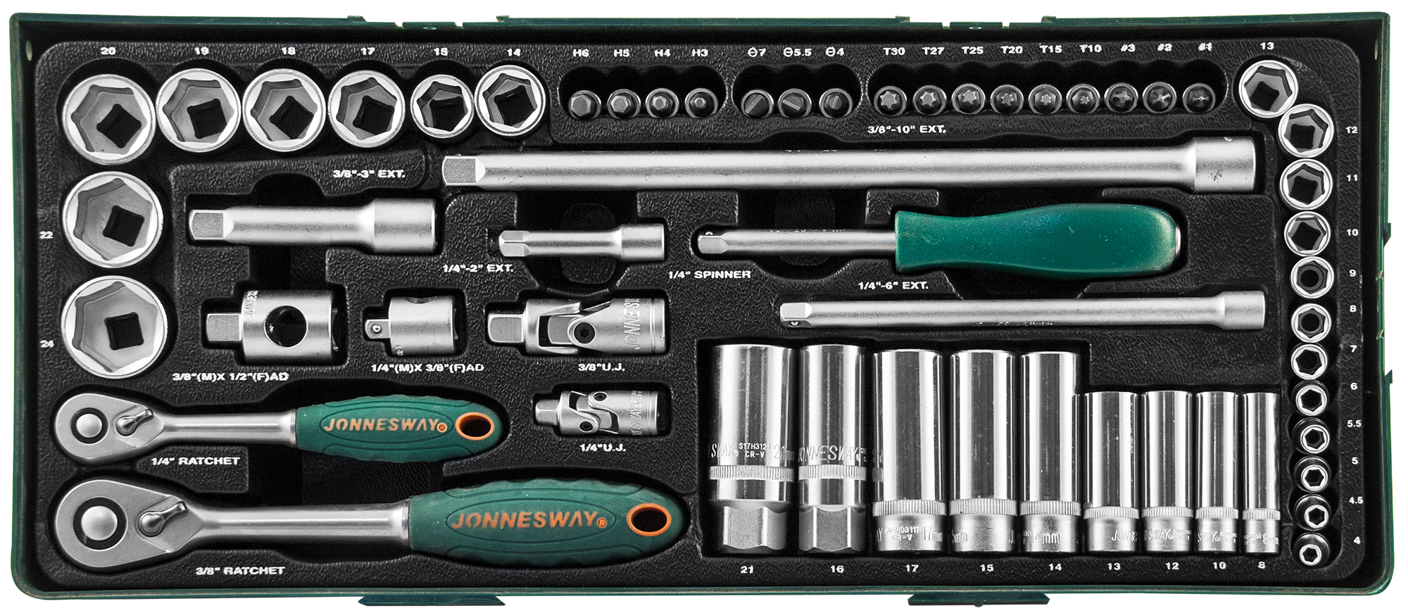 Содержание: 1/4’’DR: Головки торцевые: 4, 4.5, 5, 6, 7, 8, 9, 10, 11, 12, 13 мм; Трещоточная рукоятка; Шарнир карданный; Удлинители 50 и 150 мм; Головки торцевые удлиненные: 8, 10, 12, 13 мм; Адаптер 3/8’’(F)х1/4’’(M); Отверточная рукоятка; Головки с вставками: Нex 3-6 мм, Тorx® Т10-Т30, SL 4, 5.5, 7 мм, PH 1-3. 3/8’’DR: Головки торцевые: 14, 15, 17, 18, 19, 20, 22, 24 мм; Трещоточная рукоятка; Шарнир карданный; Головки торцевые свечные 16, 21 мм; Удлинители 75 и 250 мм; Головки торцевые удлиненные: 14, 15, 17 мм; Переходник трех сторонний 3/8’’(М)х1/2’’(F).
