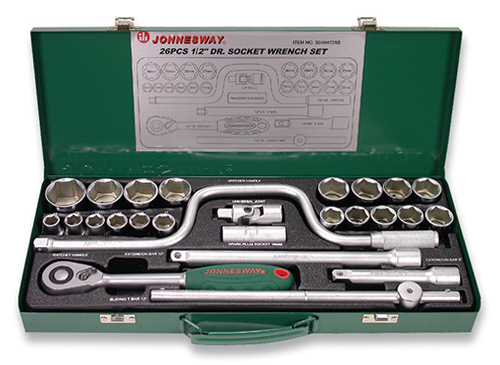Содержание: 1/2"DR: Головки торцевые, 19 шт.: 12, 13, 14, 15, 16, 17, 18, 19, 20, 21, 22, 23, 24, 25, 26, 27, 28, 30, 34 мм.; Головка торцевая свечная 16 мм.; Рукоятка трещоточная, 278 мм. ; Вороток Т-образный, 300 мм. ; Вороток коленчатый, 412 мм. ; Удлинитель, 2 шт.: 125, 250 мм.; Шарнир карданный; Металлический кейс.