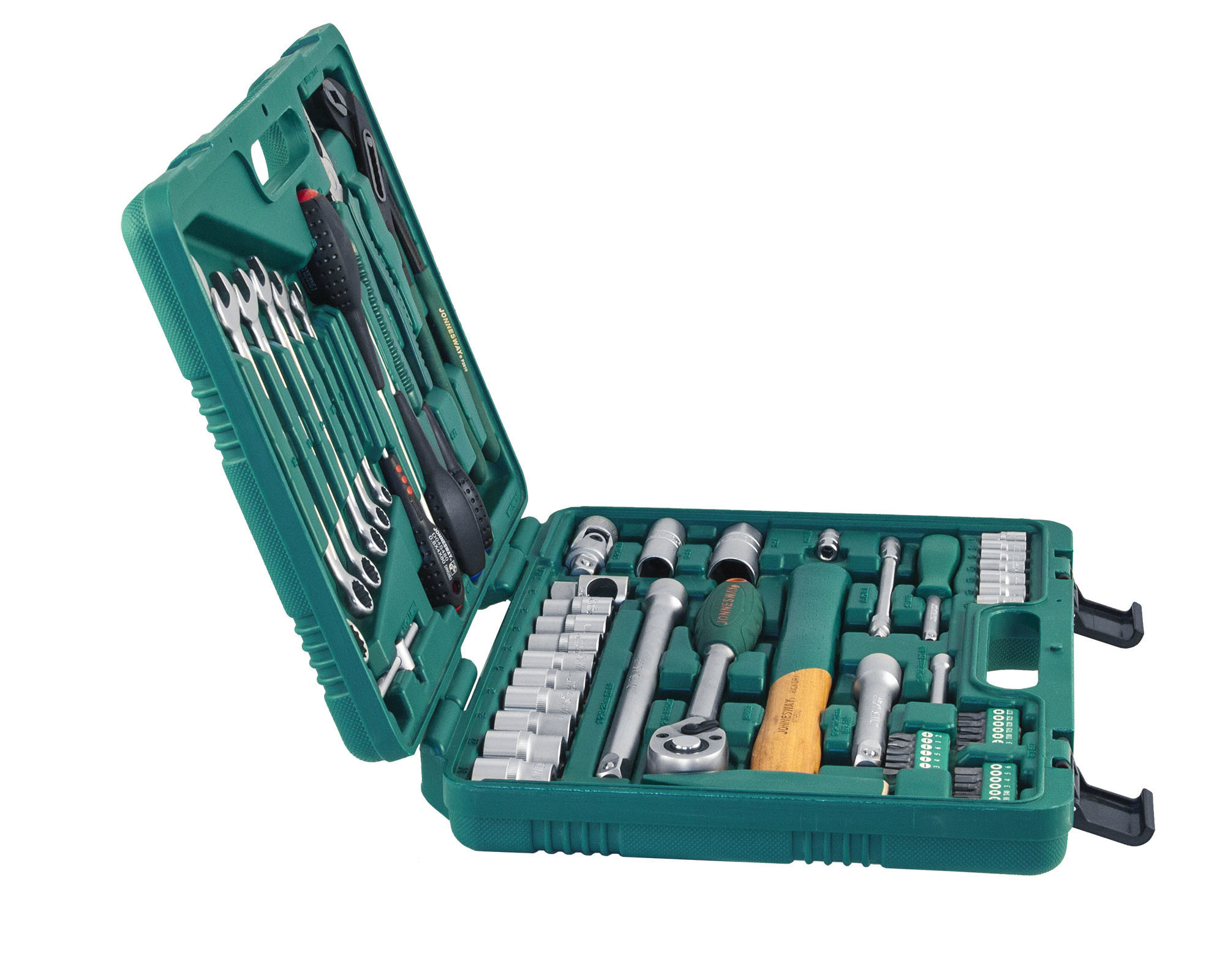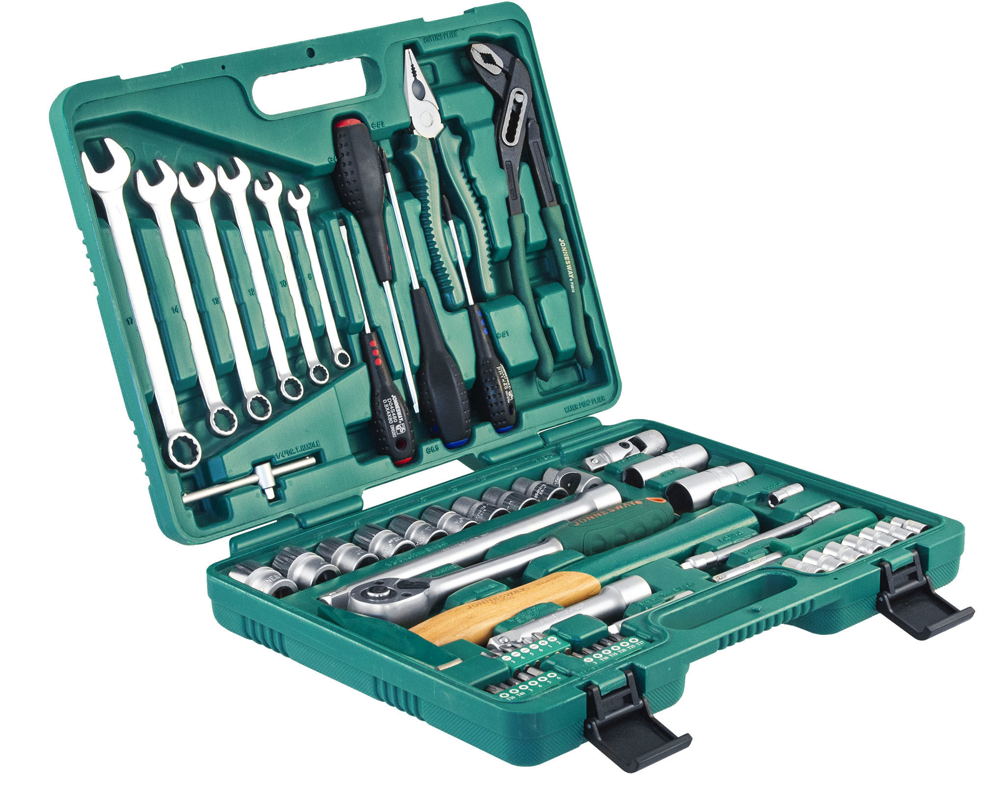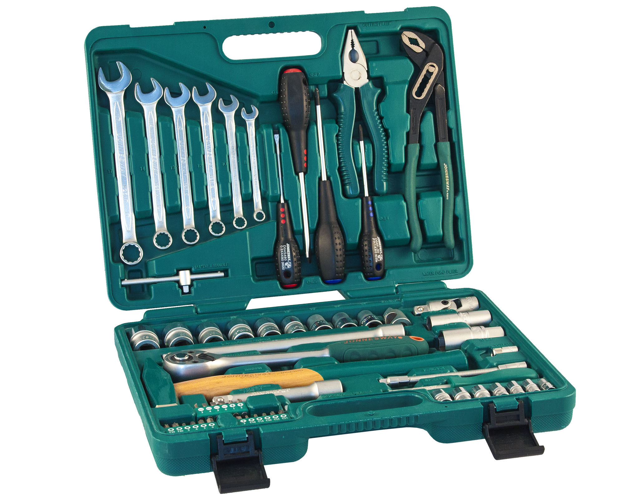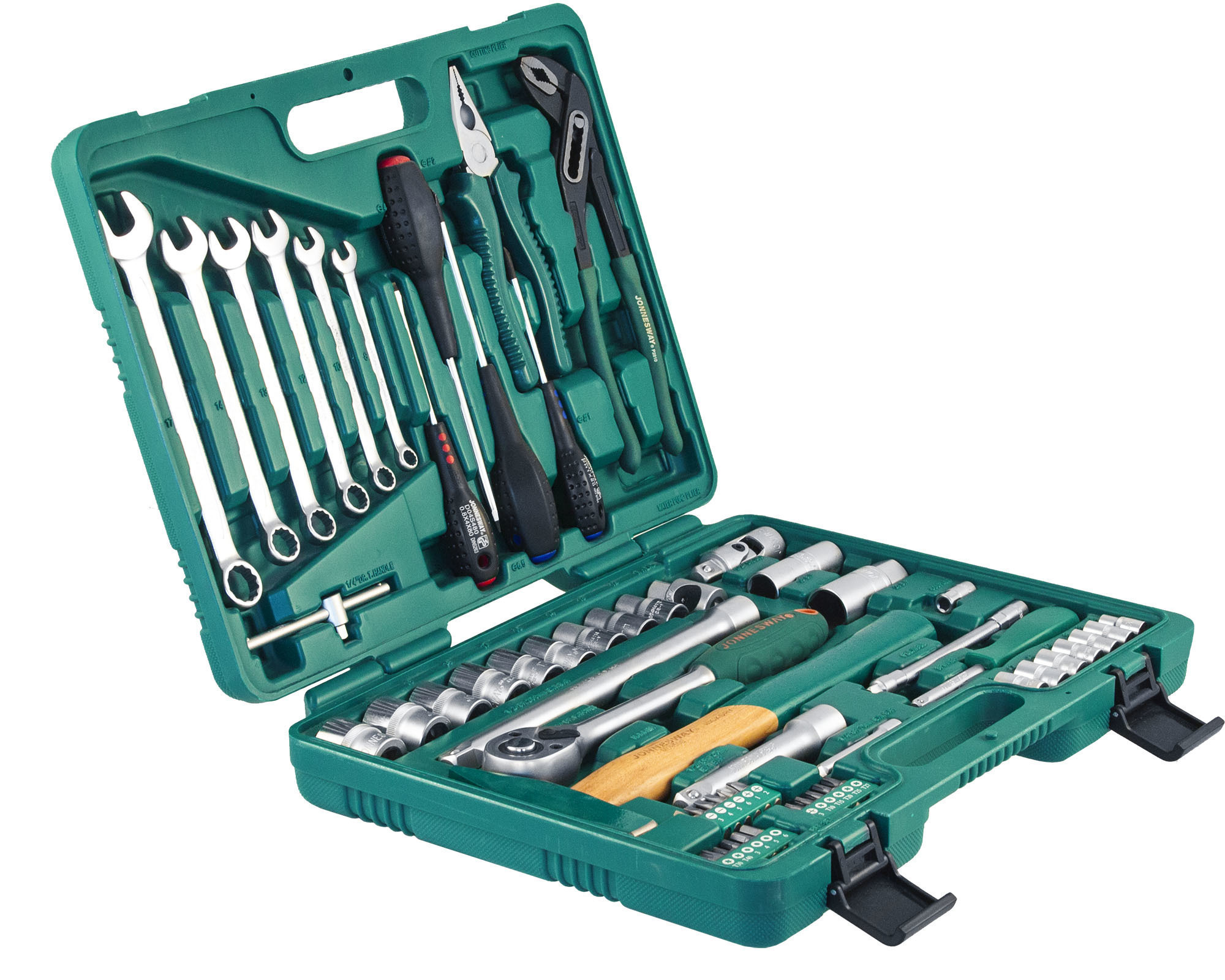 Содержание: 1/2’’ DR: Торцевые головки, 9 шт.: 12, 13, 14, 15, 17, 18, 19, 22, 24 мм; Трещотка с быстрым сбросом, 36 зубцов; Удлинители, 2 шт.: 125 и 250 мм; Торцевые головки свечные, 2 шт.: 16 и 21 мм; Адаптер для удлинителя под вороток 3/8’’(F) x 1/2’’(M); Шарнир карданный; 1/4’’ DR: Торцевые головки, 7 шт.: 6, 8, 9, 10, 11, 12, 13 мм; Удлинитель 75 мм; Гибкий удлинитель 145 мм; Вороток Т-образный 130 мм; Отвертка вороток 150 мм; Адаптер для вставок; Вставки (биты), 18 шт.: Шлиц, 4 шт.: 3, 4, 5, 6 мм; Шестигранные Нех, 4 шт.: 3, 4, 5, 6, мм; Torx, 7 шт.: Т10, Т15, Т20, Т25, Т27, Т30, Т40; Phillips, 3 шт.: 1, 2, 3; Ключи комбинированные, 6 шт.: 8, 10, 12, 13, 14, 17 мм; Клещи переставные 250 мм; Пассатижи 7" (175 мм); Молоток 0,5 кг, GS-стандарт; Отвертки, 4 шт.: (+) РН 1х80 мм, (+) РН 2х100 мм, (-) SL 0,8х4х80 мм, (-) SL 1,2х6,5х100 мм; Пластиковый кейс.