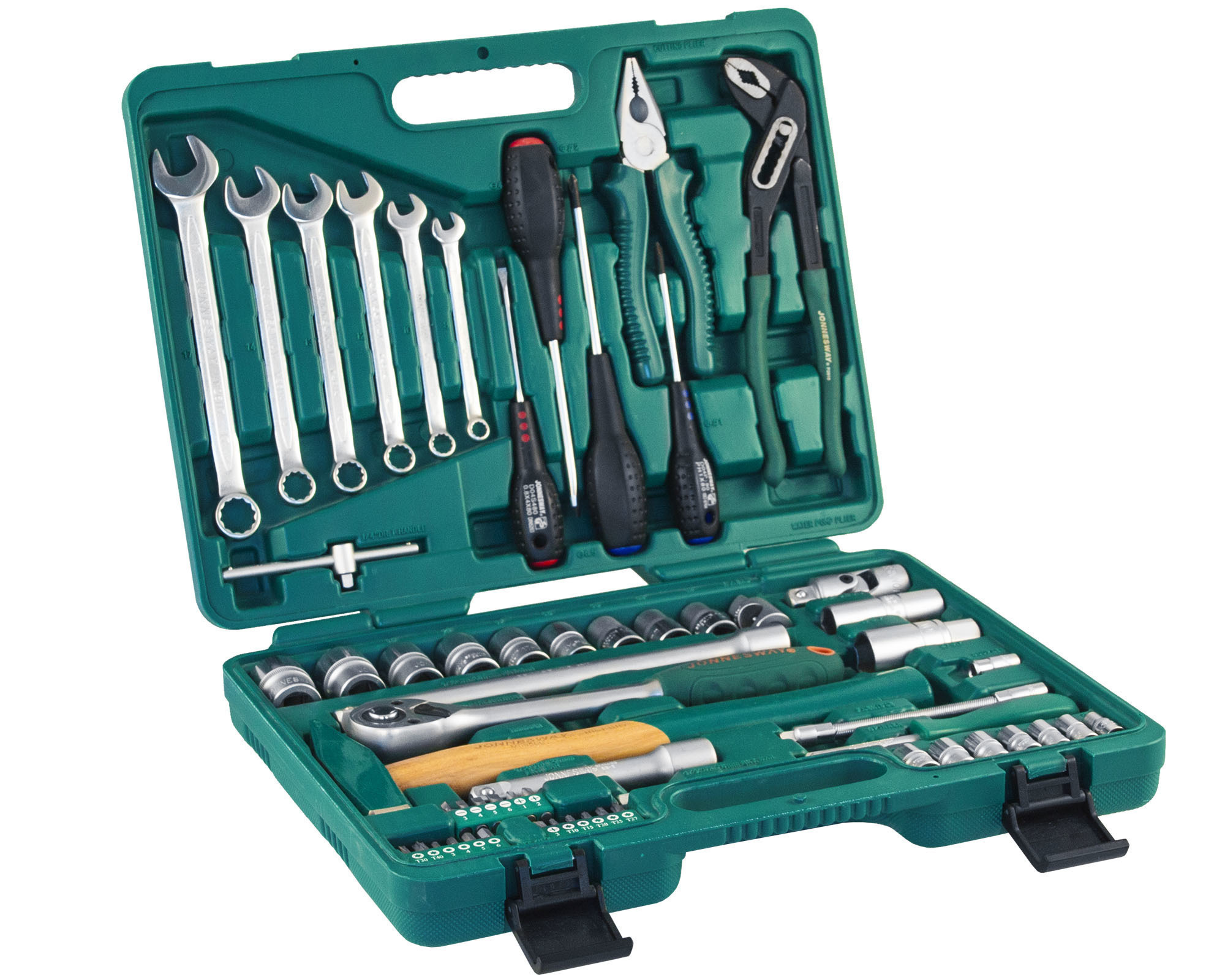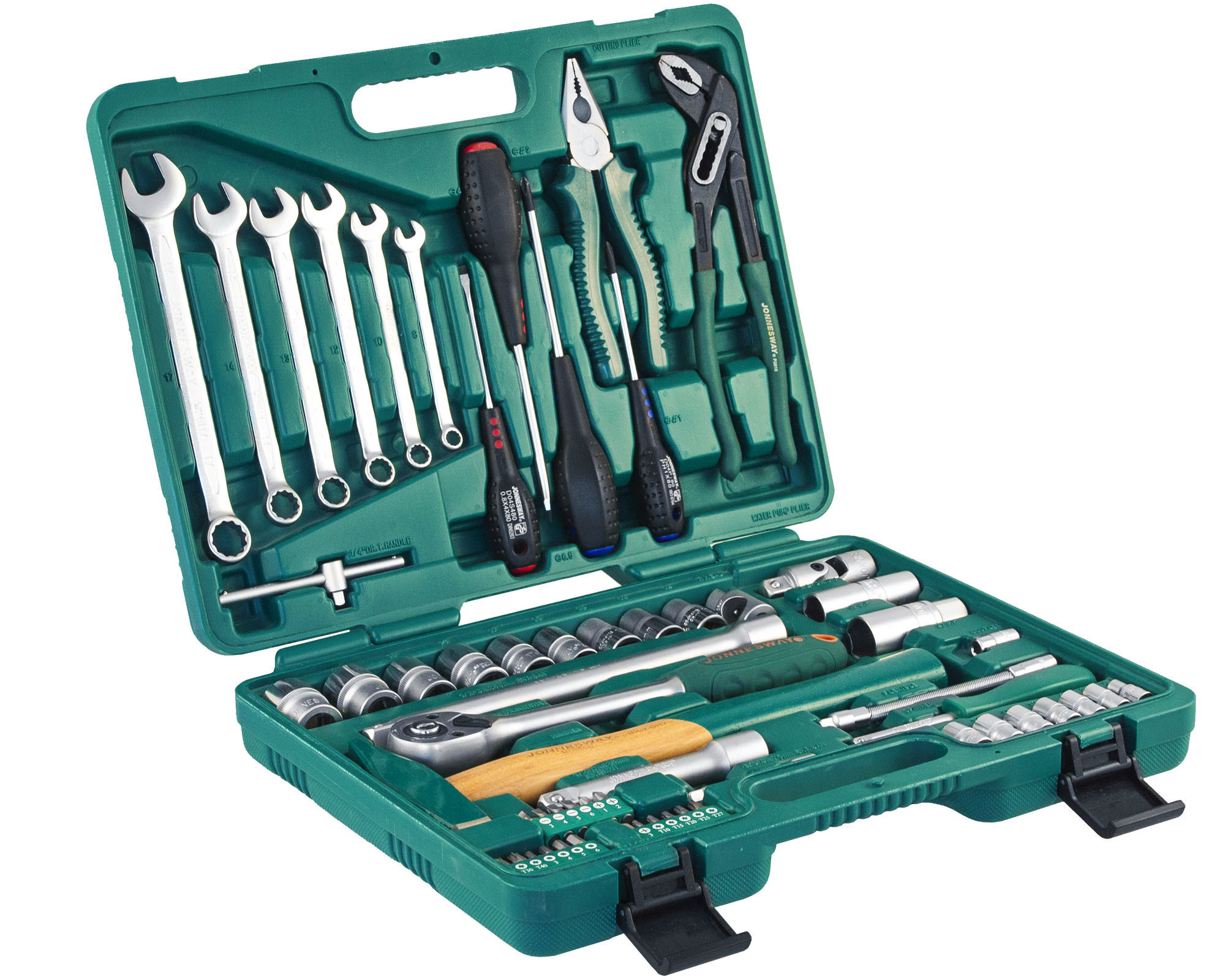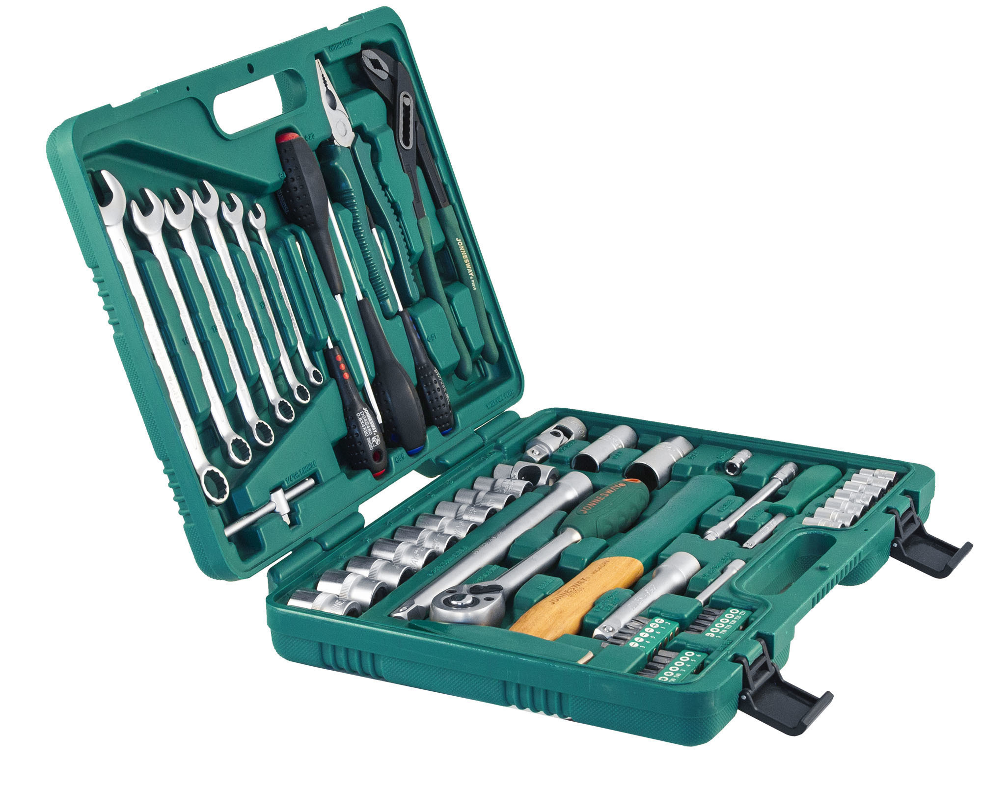 Содержание: 1/2’’ DR: Торцевые головки, 9 шт.: 12, 13, 14, 15, 17, 18, 19, 22, 24 мм; Трещотка с быстрым сбросом, 36 зубцов; Удлинители, 2 шт.: 125 и 250 мм; Торцевые головки свечные, 2 шт.: 16 и 21 мм; Адаптер для удлинителя под вороток 3/8’’(F) x 1/2’’(M); Шарнир карданный; 1/4’’ DR: Торцевые головки, 7 шт.: 6, 8, 9, 10, 11, 12, 13 мм; Удлинитель 75 мм; Гибкий удлинитель 145 мм; Вороток Т-образный 130 мм; Отвертка вороток 150 мм; Адаптер для вставок; Вставки (биты), 18 шт.: Шлиц, 4 шт.: 3, 4, 5, 6 мм; Шестигранные Нех, 4 шт.: 3, 4, 5, 6, мм; Torx, 7 шт.: Т10, Т15, Т20, Т25, Т27, Т30, Т40; Phillips, 3 шт.: 1, 2, 3; Ключи комбинированные, 6 шт.: 8, 10, 12, 13, 14, 17 мм; Клещи переставные 250 мм; Пассатижи 7" (175 мм); Молоток 0,5 кг, GS-стандарт; Отвертки, 4 шт.: (+) РН 1х80 мм, (+) РН 2х100 мм, (-) SL 0,8х4х80 мм, (-) SL 1,2х6,5х100 мм; Пластиковый кейс.