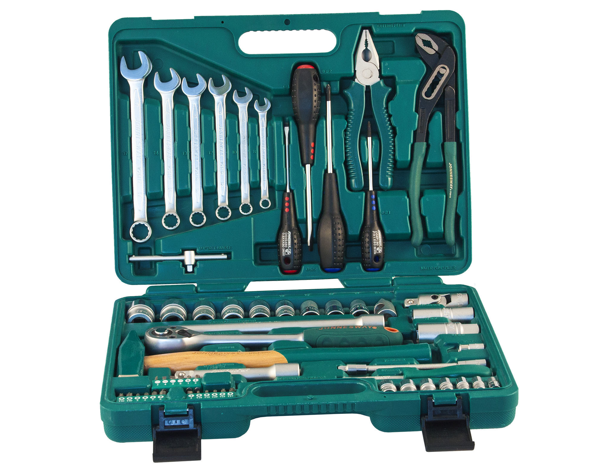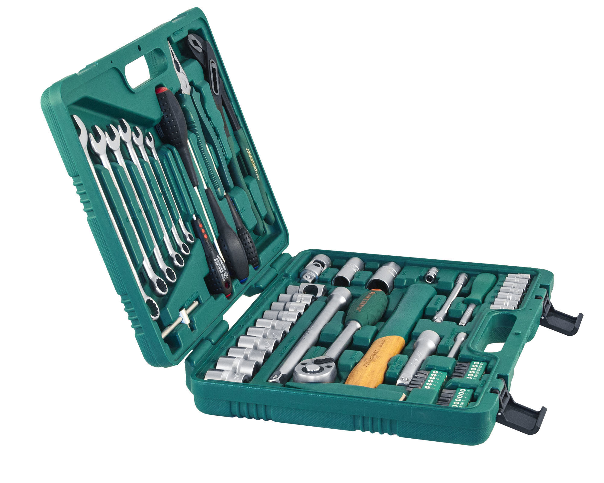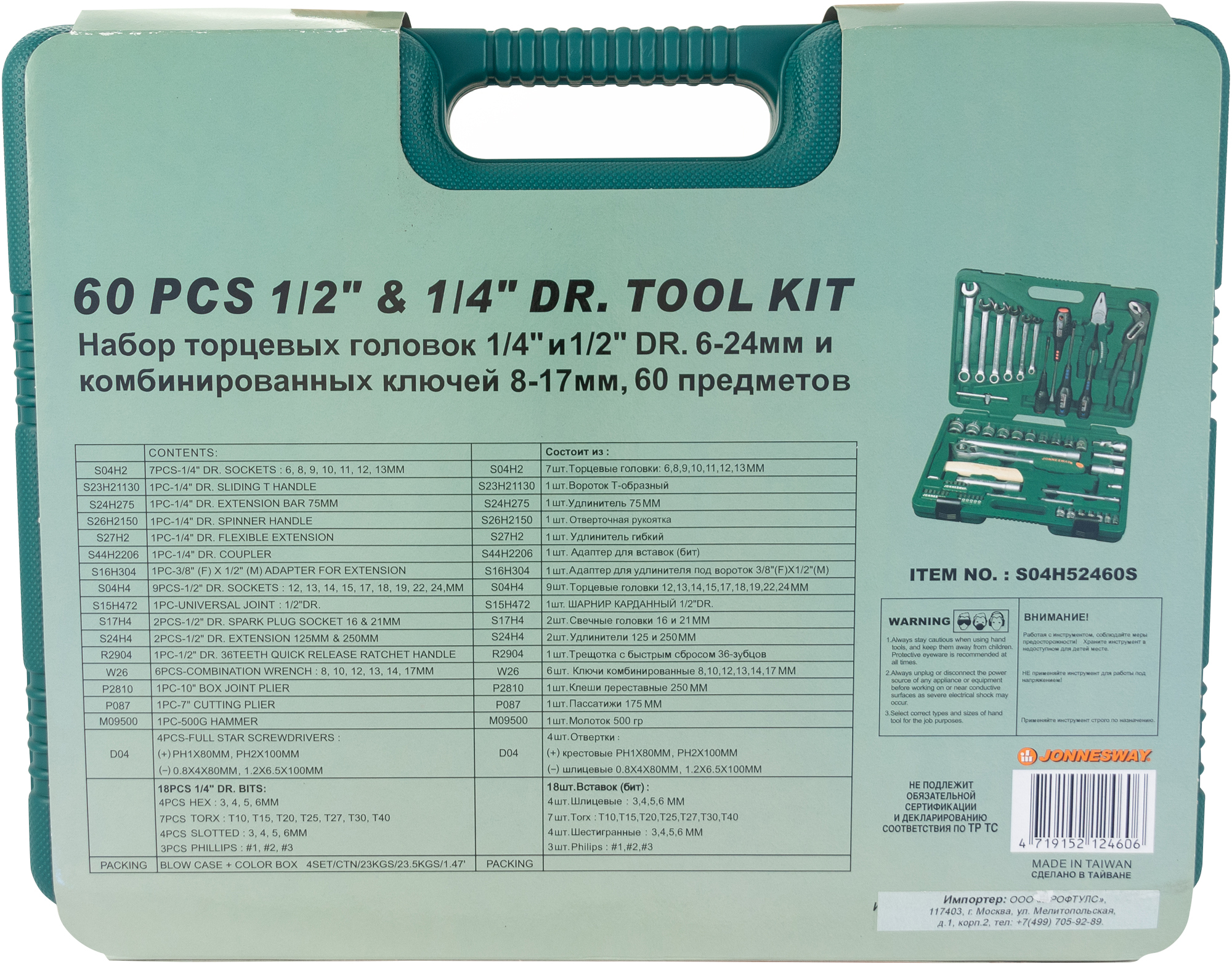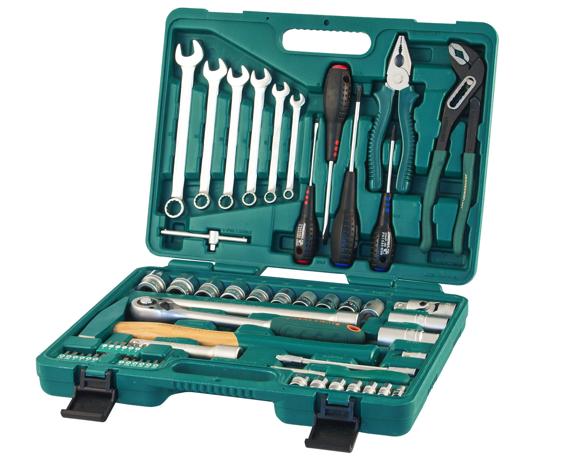 Содержание: 1/2’’ DR: Торцевые головки, 9 шт.: 12, 13, 14, 15, 17, 18, 19, 22, 24 мм; Трещотка с быстрым сбросом, 36 зубцов; Удлинители, 2 шт.: 125 и 250 мм; Торцевые головки свечные, 2 шт.: 16 и 21 мм; Адаптер для удлинителя под вороток 3/8’’(F) x 1/2’’(M); Шарнир карданный; 1/4’’ DR: Торцевые головки, 7 шт.: 6, 8, 9, 10, 11, 12, 13 мм; Удлинитель 75 мм; Гибкий удлинитель 145 мм; Вороток Т-образный 130 мм; Отвертка вороток 150 мм; Адаптер для вставок; Вставки (биты), 18 шт.: Шлиц, 4 шт.: 3, 4, 5, 6 мм; Шестигранные Нех, 4 шт.: 3, 4, 5, 6, мм; Torx, 7 шт.: Т10, Т15, Т20, Т25, Т27, Т30, Т40; Phillips, 3 шт.: 1, 2, 3; Ключи комбинированные, 6 шт.: 8, 10, 12, 13, 14, 17 мм; Клещи переставные 250 мм; Пассатижи 7" (175 мм); Молоток 0,5 кг, GS-стандарт; Отвертки, 4 шт.: (+) РН 1х80 мм, (+) РН 2х100 мм, (-) SL 0,8х4х80 мм, (-) SL 1,2х6,5х100 мм; Пластиковый кейс.