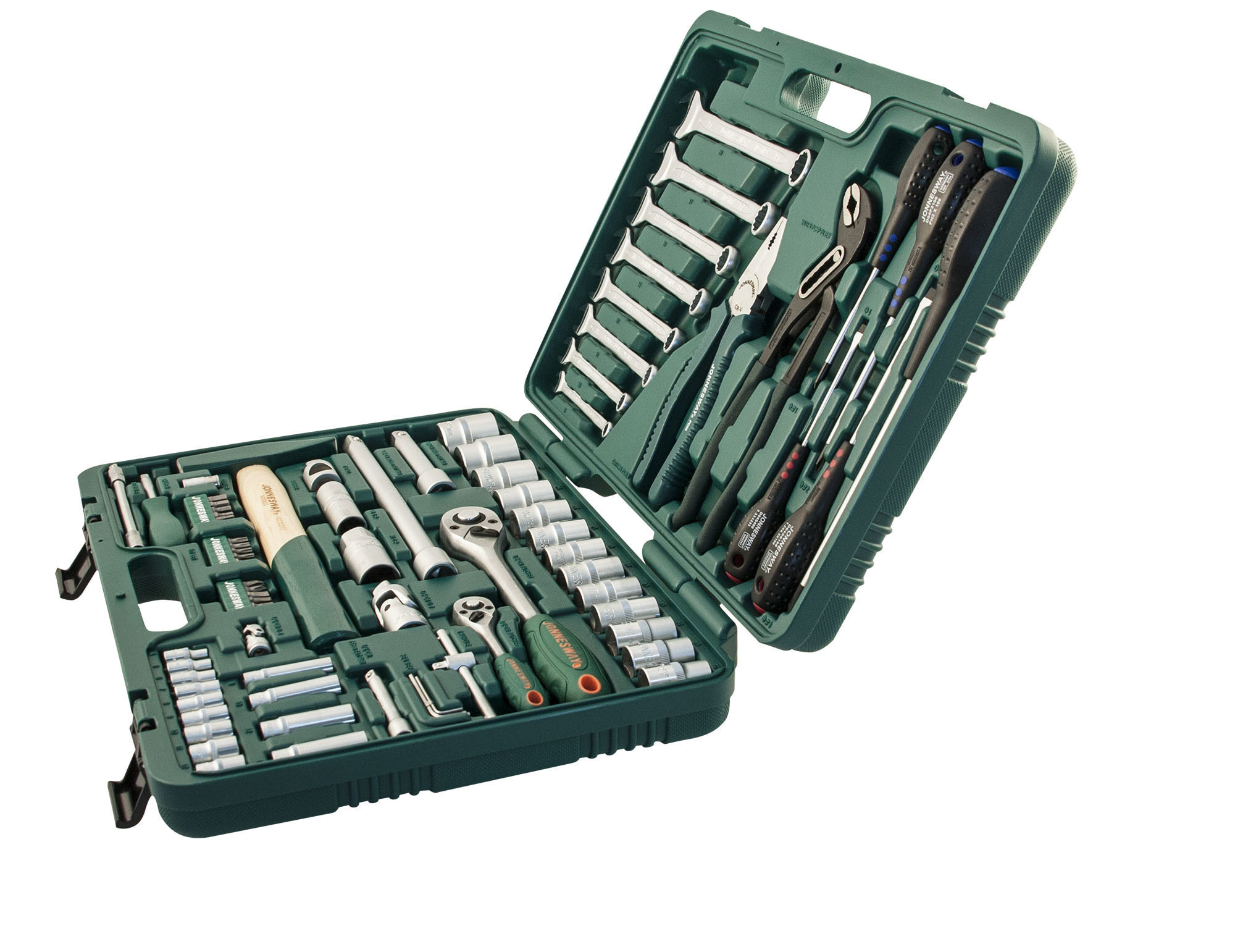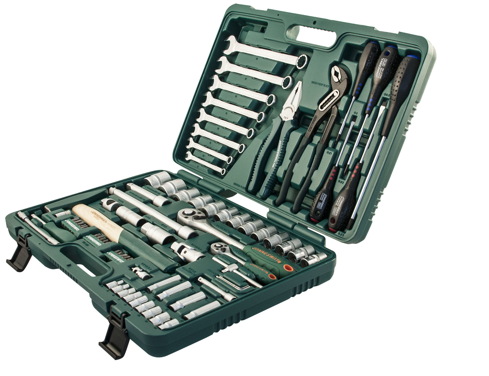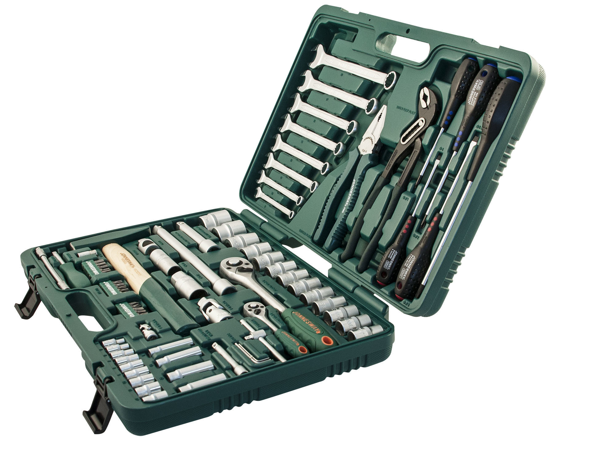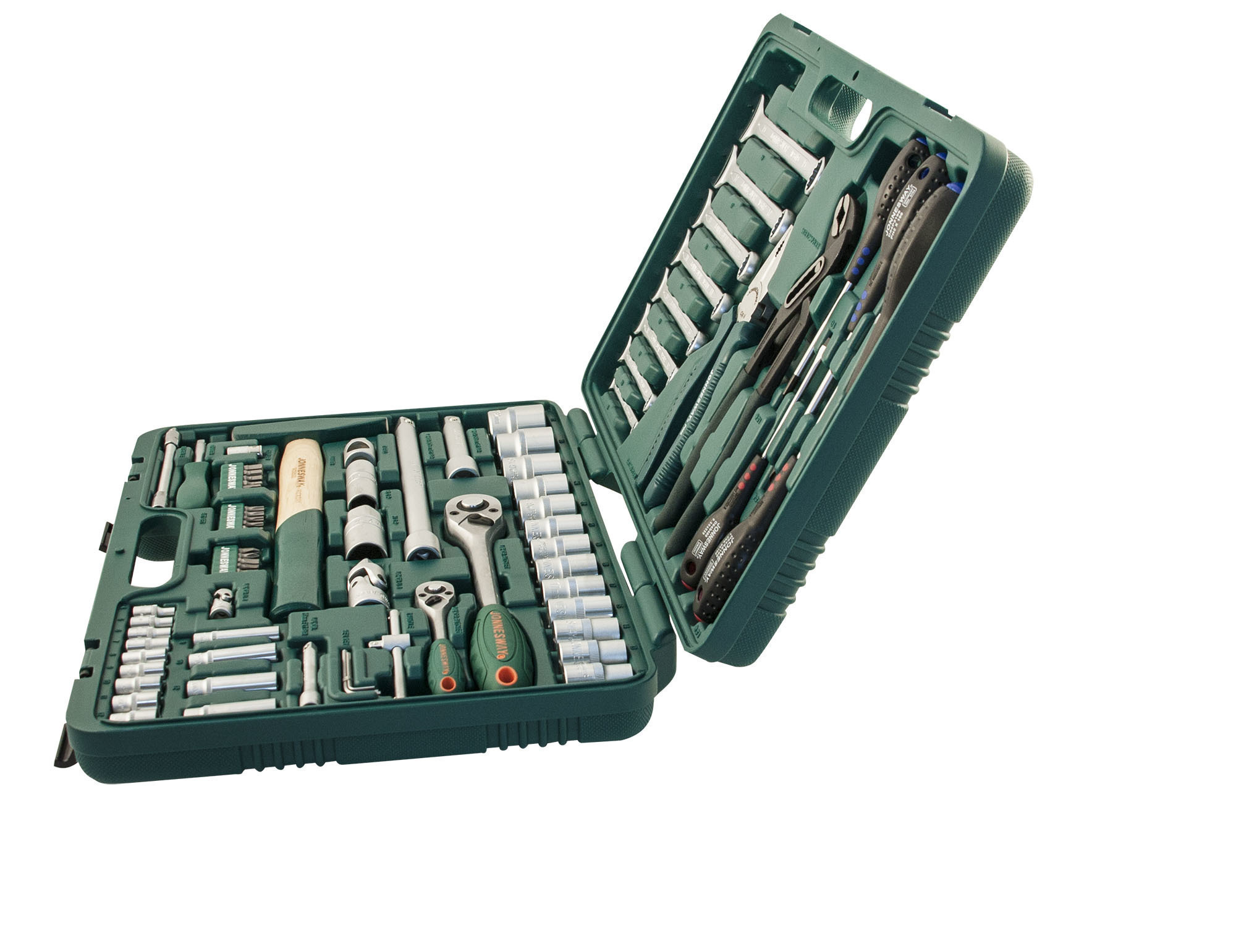 Содержание: 1/2’’ DR: Торцевые головки, 13 шт.: 12, 13, 14, 15, 17, 18, 19, 21, 22, 24, 27, 30, 32 мм; Трещоточная рукоятка, 36 зубцов; Удлинители, 2 шт.: 125 и 250 мм; Торцевые головки свечные, 2 шт.: 16 и 21 мм; Адаптер для удлинителя под вороток 3/8’’(F) x 1/2’’(M); Шарнир карданный; 1/4’’ DR: Торцевые головки, 9 шт.: 4, 5, 6, 7, 8, 9, 10, 11, 12 мм; Трещотка с быстрым сбросом, 36 зубцов; Удлинитель 75 мм; Торцевые головки глубокие, 4 шт.: 8, 10, 12, 13 мм; Гибкий удлинитель 145 мм; Вороток Т-образный 130 мм; Отвертка вороток 150 мм; Карданный шарнир; Адаптер для вставок; Вставки (биты), 18 шт.: Шлиц, 4 шт.: 3, 4, 5, 6 мм; Шестигранные Нех, 4 шт.: 3, 4, 5, 6 мм; Torx, 7 шт.: Т10, Т15, Т20, Т25, Т27, Т30, Т40; Phillips, 3 шт.: 1, 2, 3. Ключи комбинированные, 8 шт.: 8, 10, 12, 13, 14, 15, 17, 19 мм; Клещи переставные 250 мм; Пассатижи 8" (200 мм); Ключи Г-образные шестигранные, 3 шт.: 1.5, 2, 3 мм; Молоток 0,5 кг, GS-стандарт; Отвертки, 5 шт.: (+) PH 1х80 мм, (+) PH 2х100 мм, (+) PH 3х150 мм, (-) SL 0,8х4х80 мм, (-) SL 1,2х6,5х100 мм; Пластиковый кейс.
