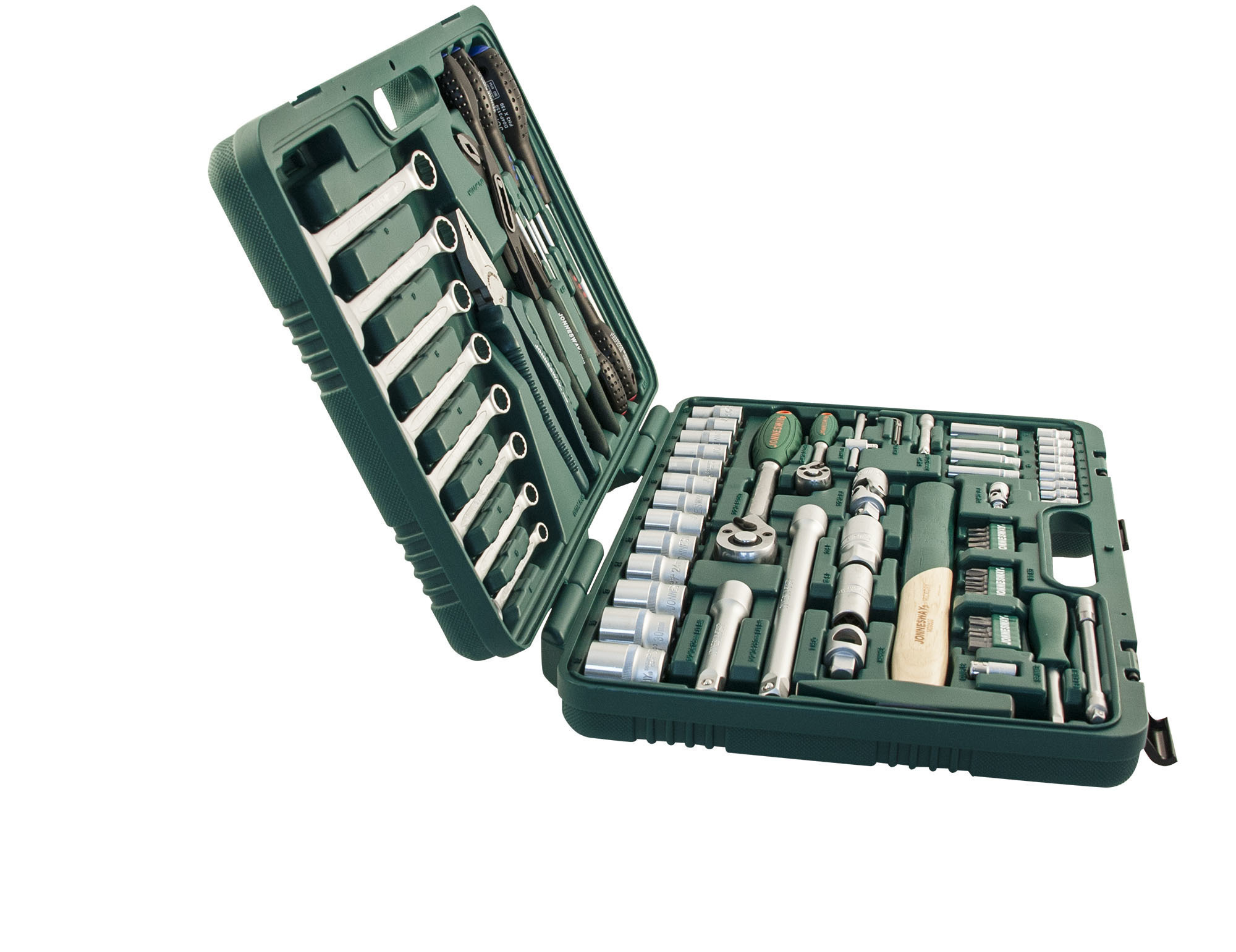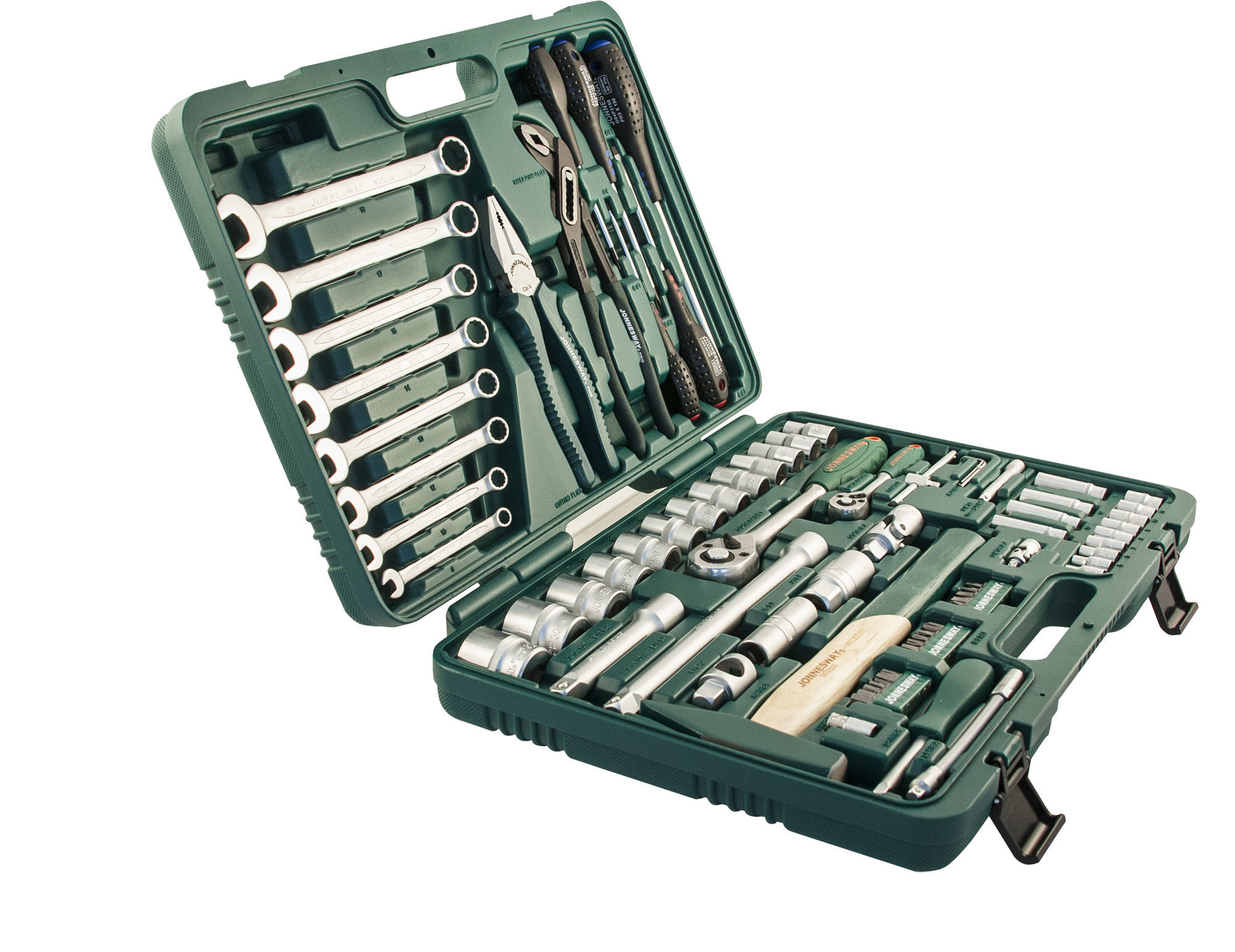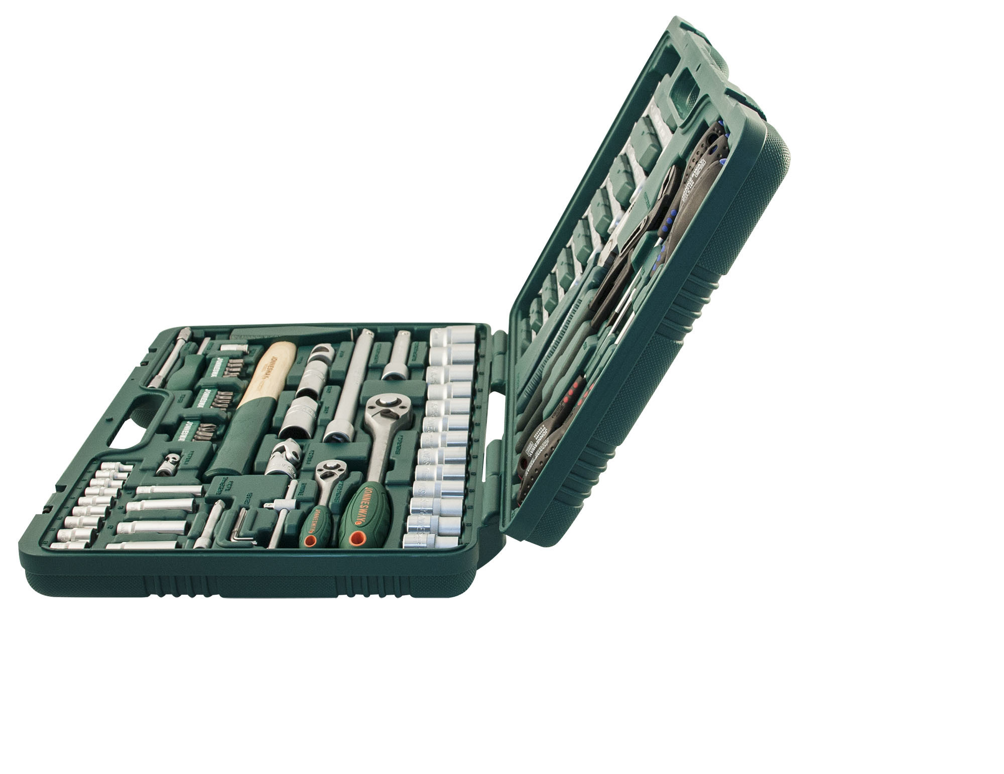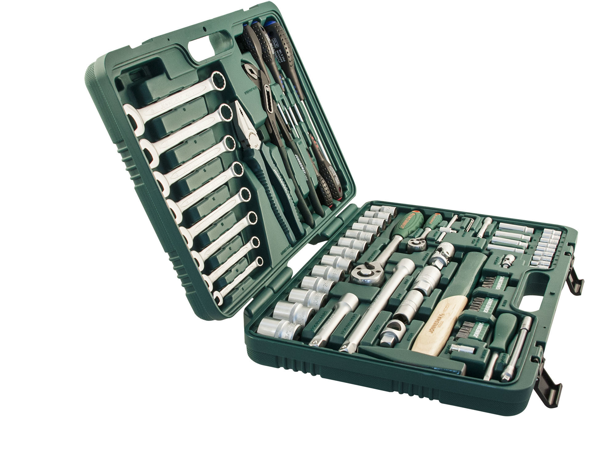Содержание: 1/2’’ DR: Торцевые головки, 13 шт.: 12, 13, 14, 15, 17, 18, 19, 21, 22, 24, 27, 30, 32 мм; Трещоточная рукоятка, 36 зубцов; Удлинители, 2 шт.: 125 и 250 мм; Торцевые головки свечные, 2 шт.: 16 и 21 мм; Адаптер для удлинителя под вороток 3/8’’(F) x 1/2’’(M); Шарнир карданный; 1/4’’ DR: Торцевые головки, 9 шт.: 4, 5, 6, 7, 8, 9, 10, 11, 12 мм; Трещотка с быстрым сбросом, 36 зубцов; Удлинитель 75 мм; Торцевые головки глубокие, 4 шт.: 8, 10, 12, 13 мм; Гибкий удлинитель 145 мм; Вороток Т-образный 130 мм; Отвертка вороток 150 мм; Карданный шарнир; Адаптер для вставок; Вставки (биты), 18 шт.: Шлиц, 4 шт.: 3, 4, 5, 6 мм; Шестигранные Нех, 4 шт.: 3, 4, 5, 6 мм; Torx, 7 шт.: Т10, Т15, Т20, Т25, Т27, Т30, Т40; Phillips, 3 шт.: 1, 2, 3. Ключи комбинированные, 8 шт.: 8, 10, 12, 13, 14, 15, 17, 19 мм; Клещи переставные 250 мм; Пассатижи 8" (200 мм); Ключи Г-образные шестигранные, 3 шт.: 1.5, 2, 3 мм; Молоток 0,5 кг, GS-стандарт; Отвертки, 5 шт.: (+) PH 1х80 мм, (+) PH 2х100 мм, (+) PH 3х150 мм, (-) SL 0,8х4х80 мм, (-) SL 1,2х6,5х100 мм; Пластиковый кейс.