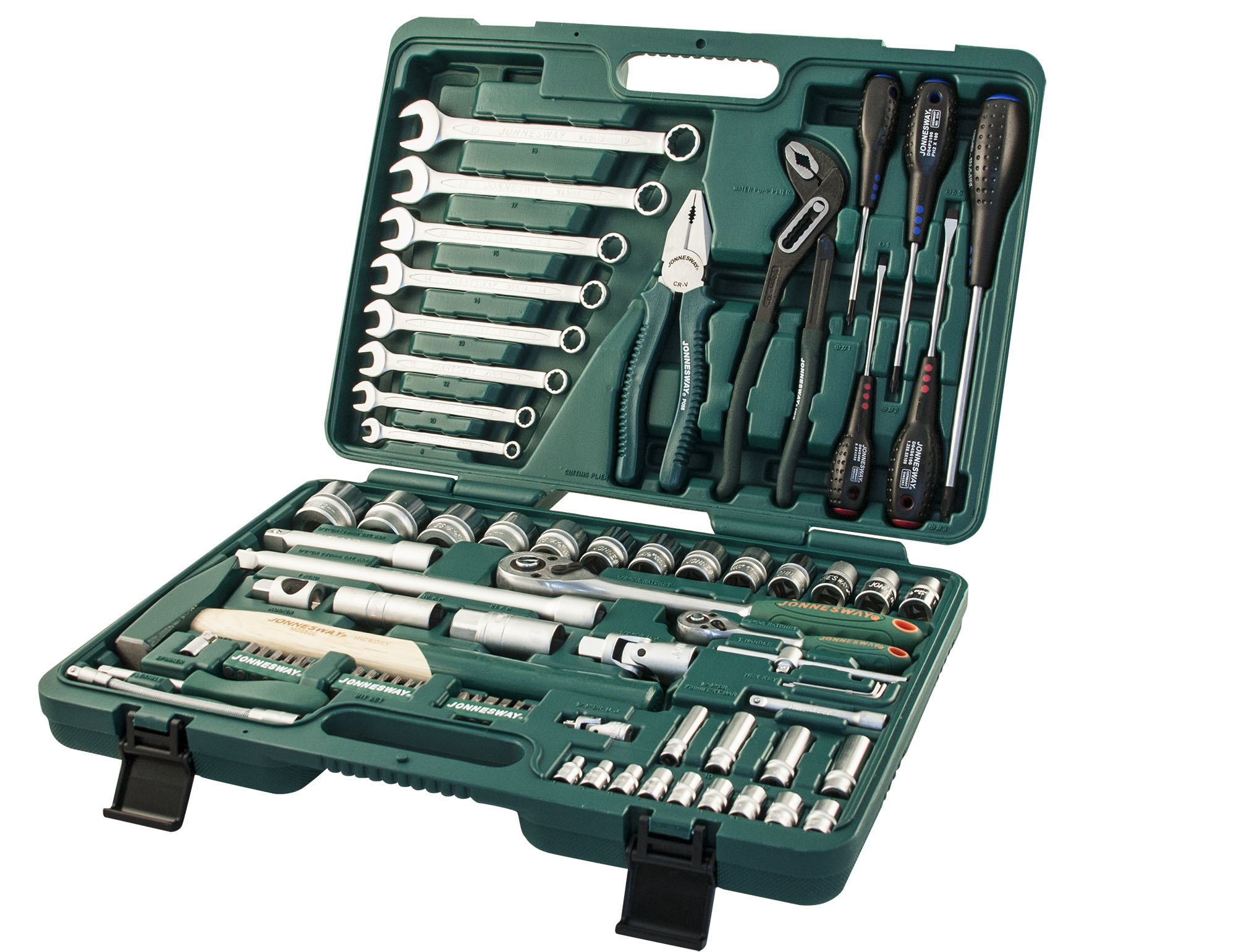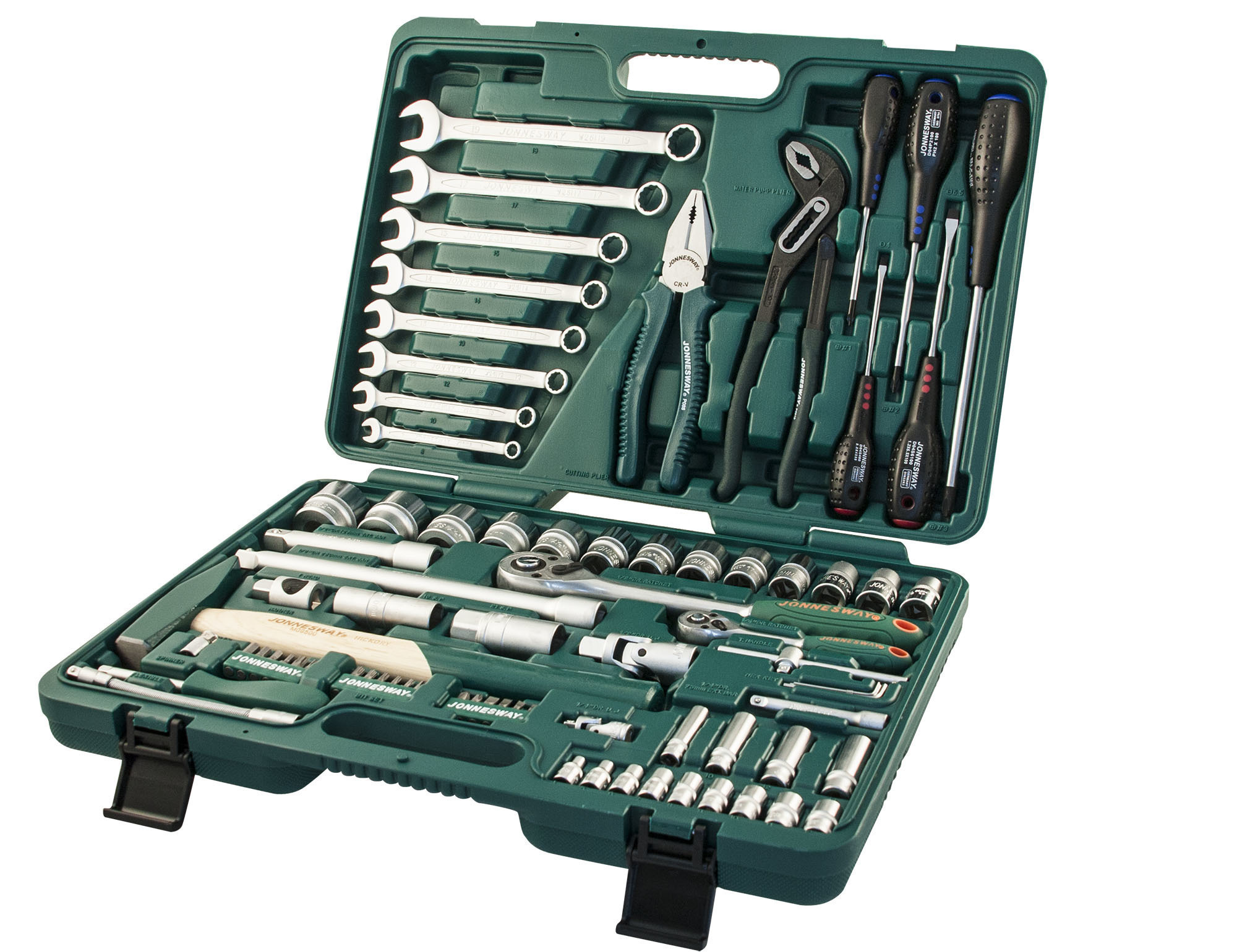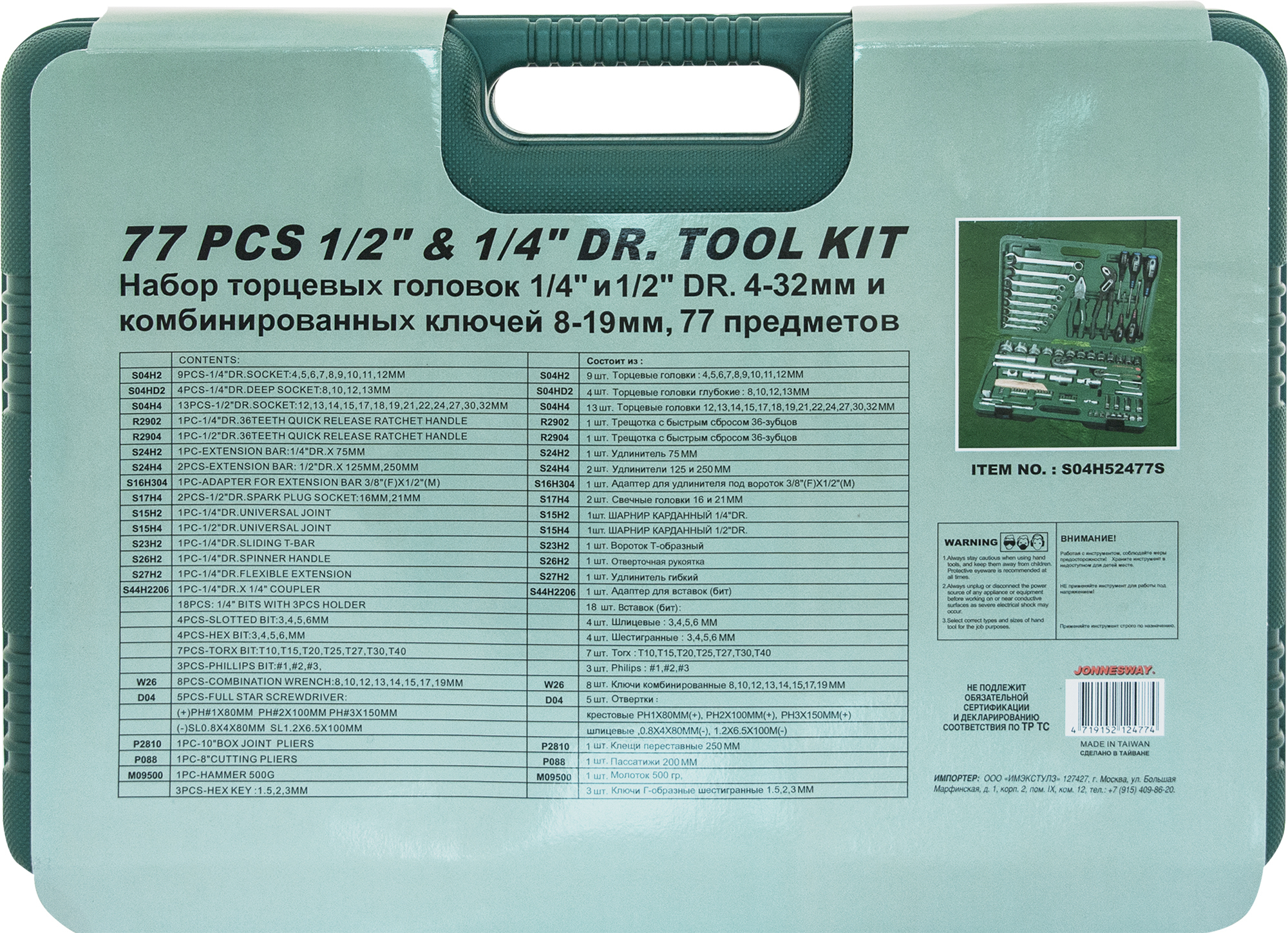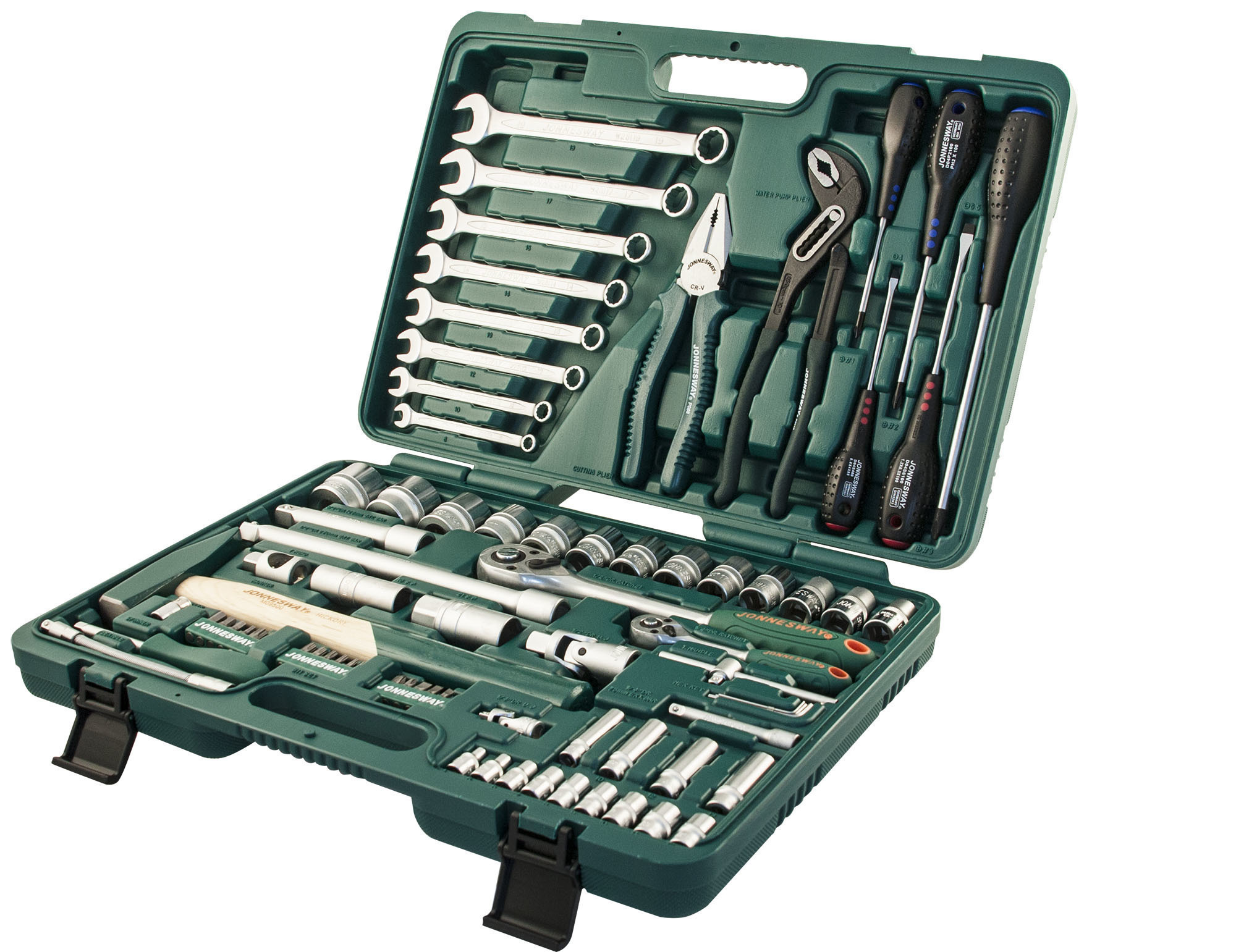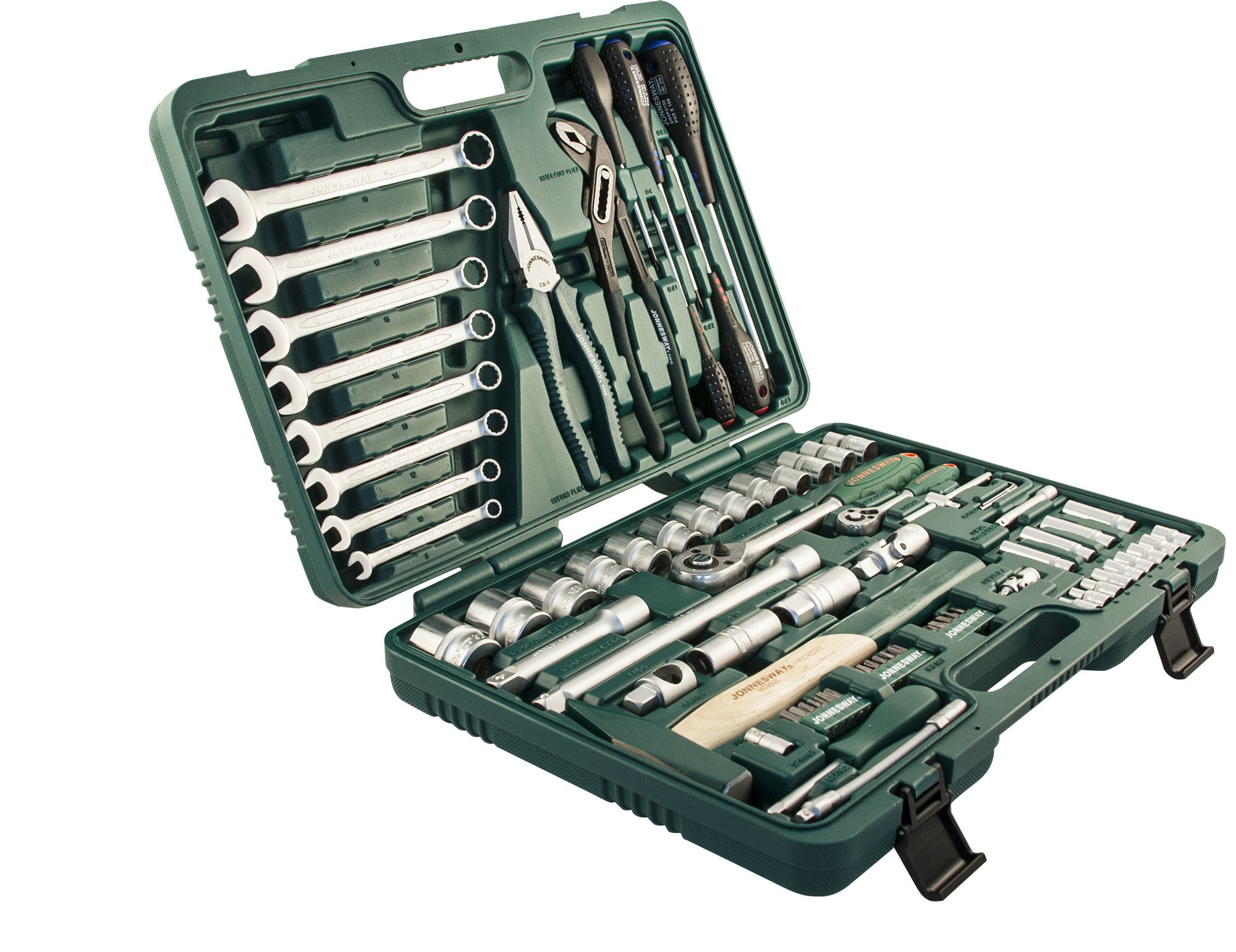 Содержание: 1/2’’ DR: Торцевые головки, 13 шт.: 12, 13, 14, 15, 17, 18, 19, 21, 22, 24, 27, 30, 32 мм; Трещоточная рукоятка, 36 зубцов; Удлинители, 2 шт.: 125 и 250 мм; Торцевые головки свечные, 2 шт.: 16 и 21 мм; Адаптер для удлинителя под вороток 3/8’’(F) x 1/2’’(M); Шарнир карданный; 1/4’’ DR: Торцевые головки, 9 шт.: 4, 5, 6, 7, 8, 9, 10, 11, 12 мм; Трещотка с быстрым сбросом, 36 зубцов; Удлинитель 75 мм; Торцевые головки глубокие, 4 шт.: 8, 10, 12, 13 мм; Гибкий удлинитель 145 мм; Вороток Т-образный 130 мм; Отвертка вороток 150 мм; Карданный шарнир; Адаптер для вставок; Вставки (биты), 18 шт.: Шлиц, 4 шт.: 3, 4, 5, 6 мм; Шестигранные Нех, 4 шт.: 3, 4, 5, 6 мм; Torx, 7 шт.: Т10, Т15, Т20, Т25, Т27, Т30, Т40; Phillips, 3 шт.: 1, 2, 3. Ключи комбинированные, 8 шт.: 8, 10, 12, 13, 14, 15, 17, 19 мм; Клещи переставные 250 мм; Пассатижи 8" (200 мм); Ключи Г-образные шестигранные, 3 шт.: 1.5, 2, 3 мм; Молоток 0,5 кг, GS-стандарт; Отвертки, 5 шт.: (+) PH 1х80 мм, (+) PH 2х100 мм, (+) PH 3х150 мм, (-) SL 0,8х4х80 мм, (-) SL 1,2х6,5х100 мм; Пластиковый кейс.