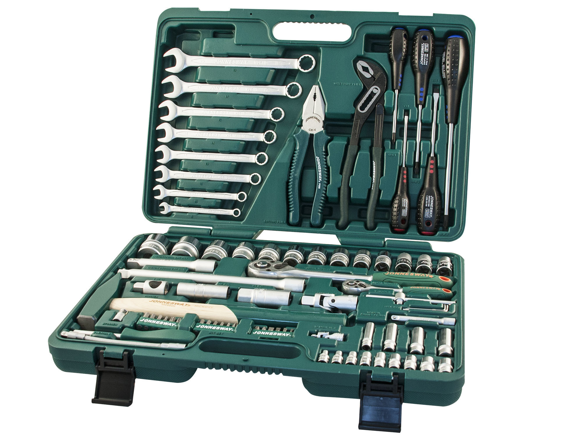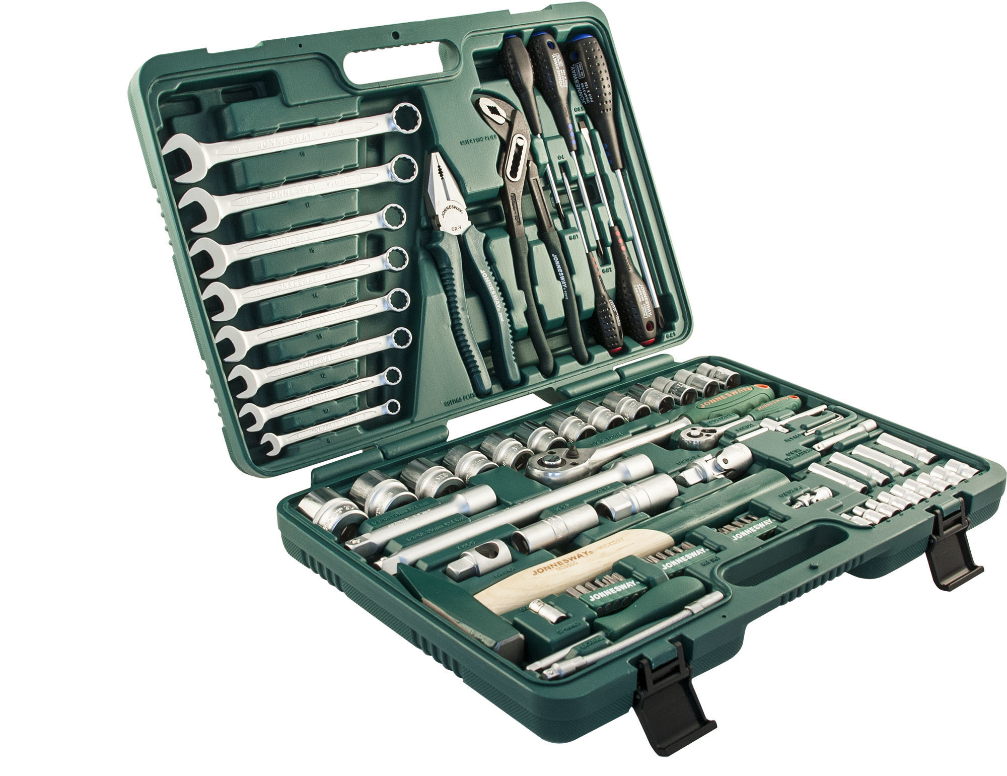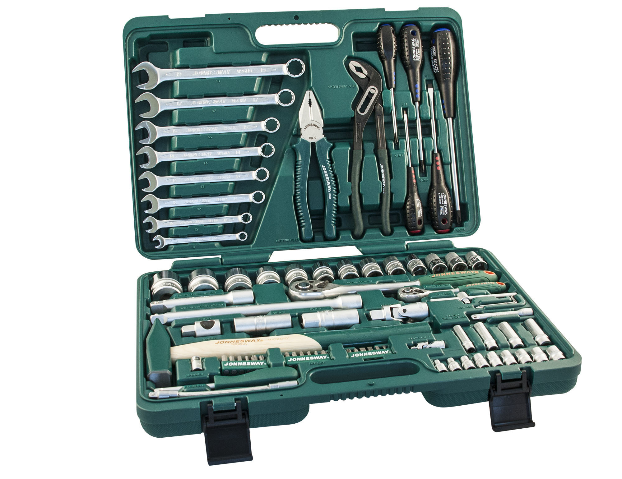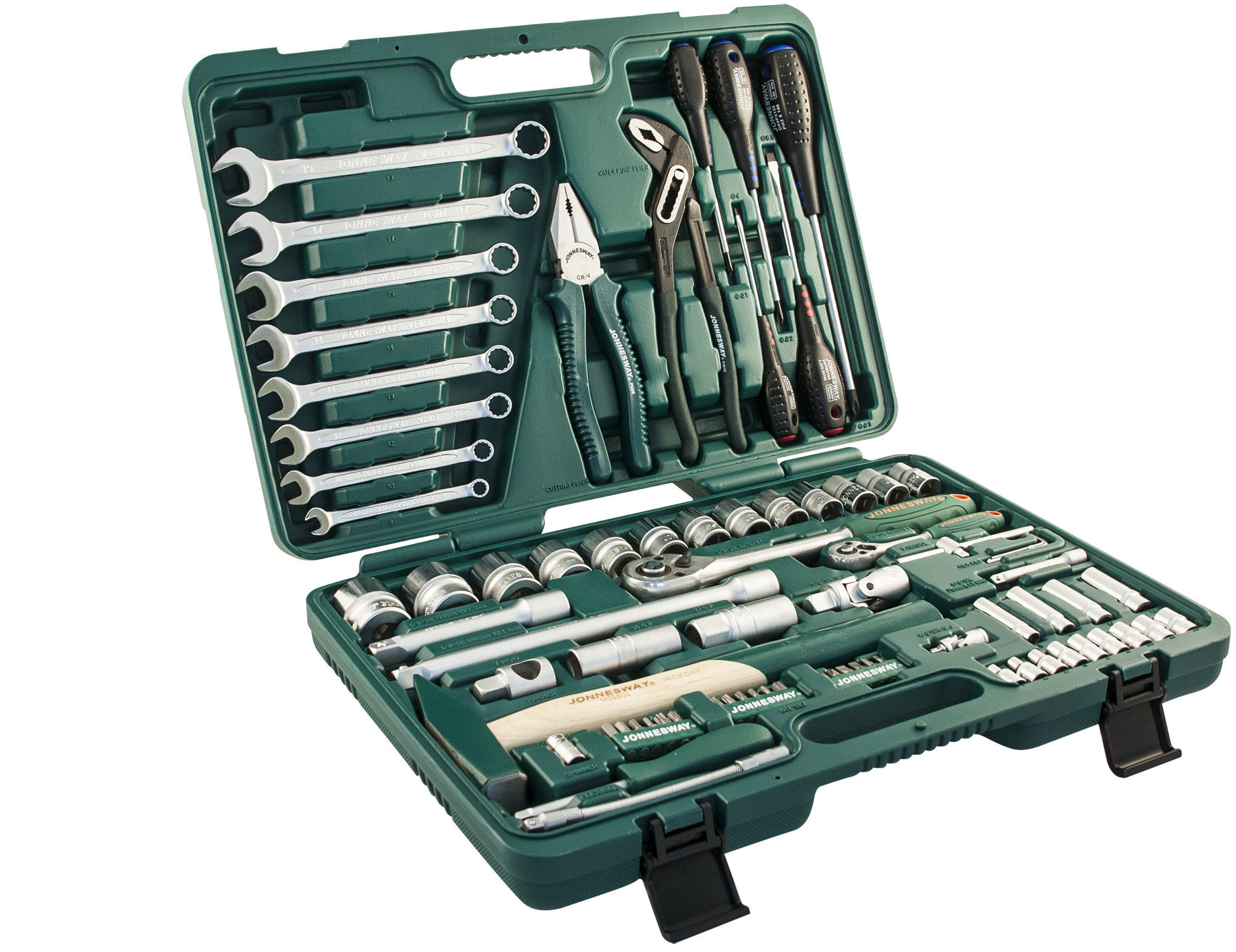 Содержание: 1/2’’ DR: Торцевые головки, 13 шт.: 12, 13, 14, 15, 17, 18, 19, 21, 22, 24, 27, 30, 32 мм; Трещоточная рукоятка, 36 зубцов; Удлинители, 2 шт.: 125 и 250 мм; Торцевые головки свечные, 2 шт.: 16 и 21 мм; Адаптер для удлинителя под вороток 3/8’’(F) x 1/2’’(M); Шарнир карданный; 1/4’’ DR: Торцевые головки, 9 шт.: 4, 5, 6, 7, 8, 9, 10, 11, 12 мм; Трещотка с быстрым сбросом, 36 зубцов; Удлинитель 75 мм; Торцевые головки глубокие, 4 шт.: 8, 10, 12, 13 мм; Гибкий удлинитель 145 мм; Вороток Т-образный 130 мм; Отвертка вороток 150 мм; Карданный шарнир; Адаптер для вставок; Вставки (биты), 18 шт.: Шлиц, 4 шт.: 3, 4, 5, 6 мм; Шестигранные Нех, 4 шт.: 3, 4, 5, 6 мм; Torx, 7 шт.: Т10, Т15, Т20, Т25, Т27, Т30, Т40; Phillips, 3 шт.: 1, 2, 3. Ключи комбинированные, 8 шт.: 8, 10, 12, 13, 14, 15, 17, 19 мм; Клещи переставные 250 мм; Пассатижи 8" (200 мм); Ключи Г-образные шестигранные, 3 шт.: 1.5, 2, 3 мм; Молоток 0,5 кг, GS-стандарт; Отвертки, 5 шт.: (+) PH 1х80 мм, (+) PH 2х100 мм, (+) PH 3х150 мм, (-) SL 0,8х4х80 мм, (-) SL 1,2х6,5х100 мм; Пластиковый кейс.