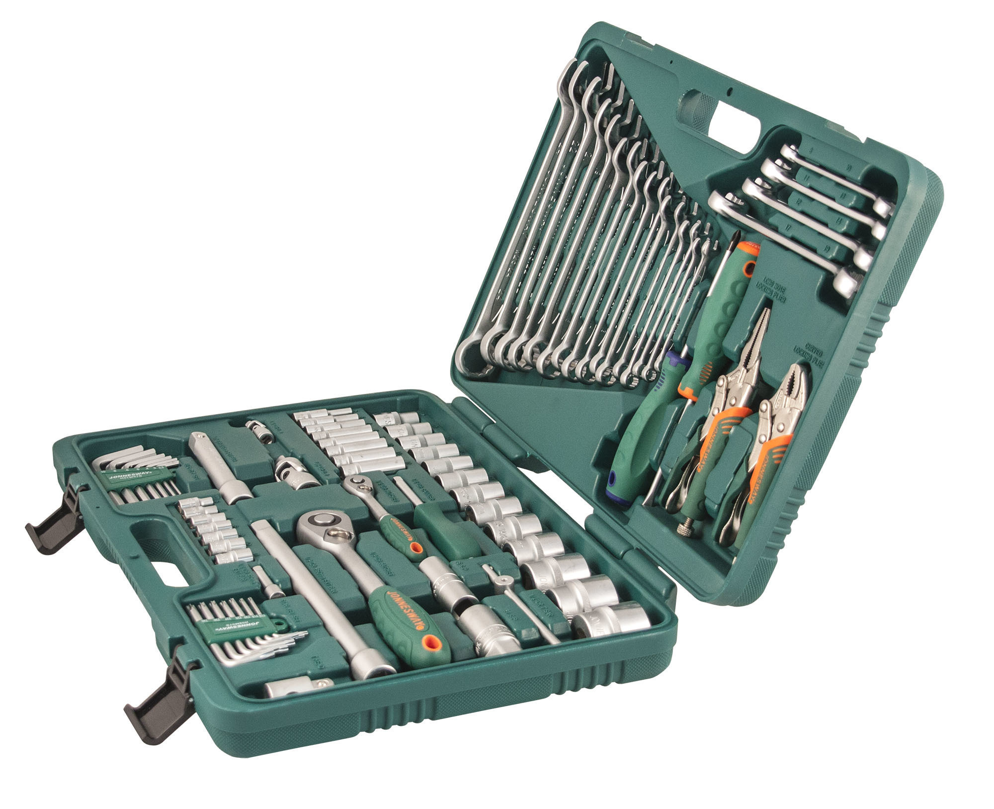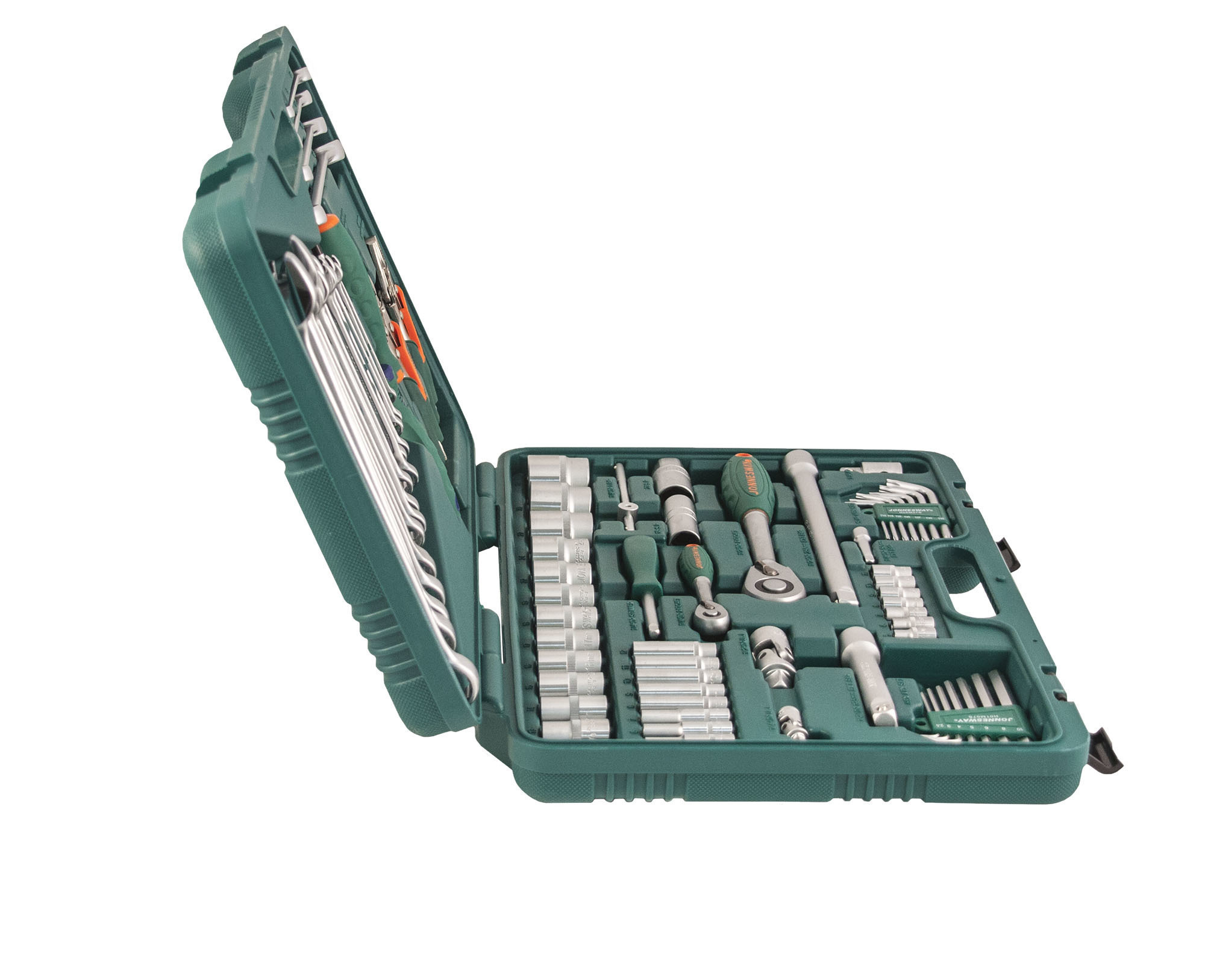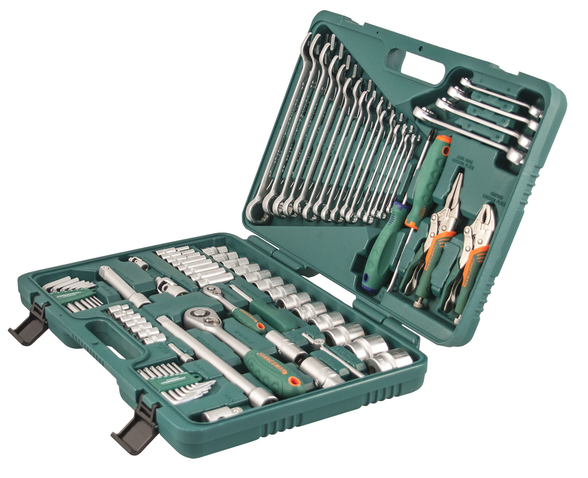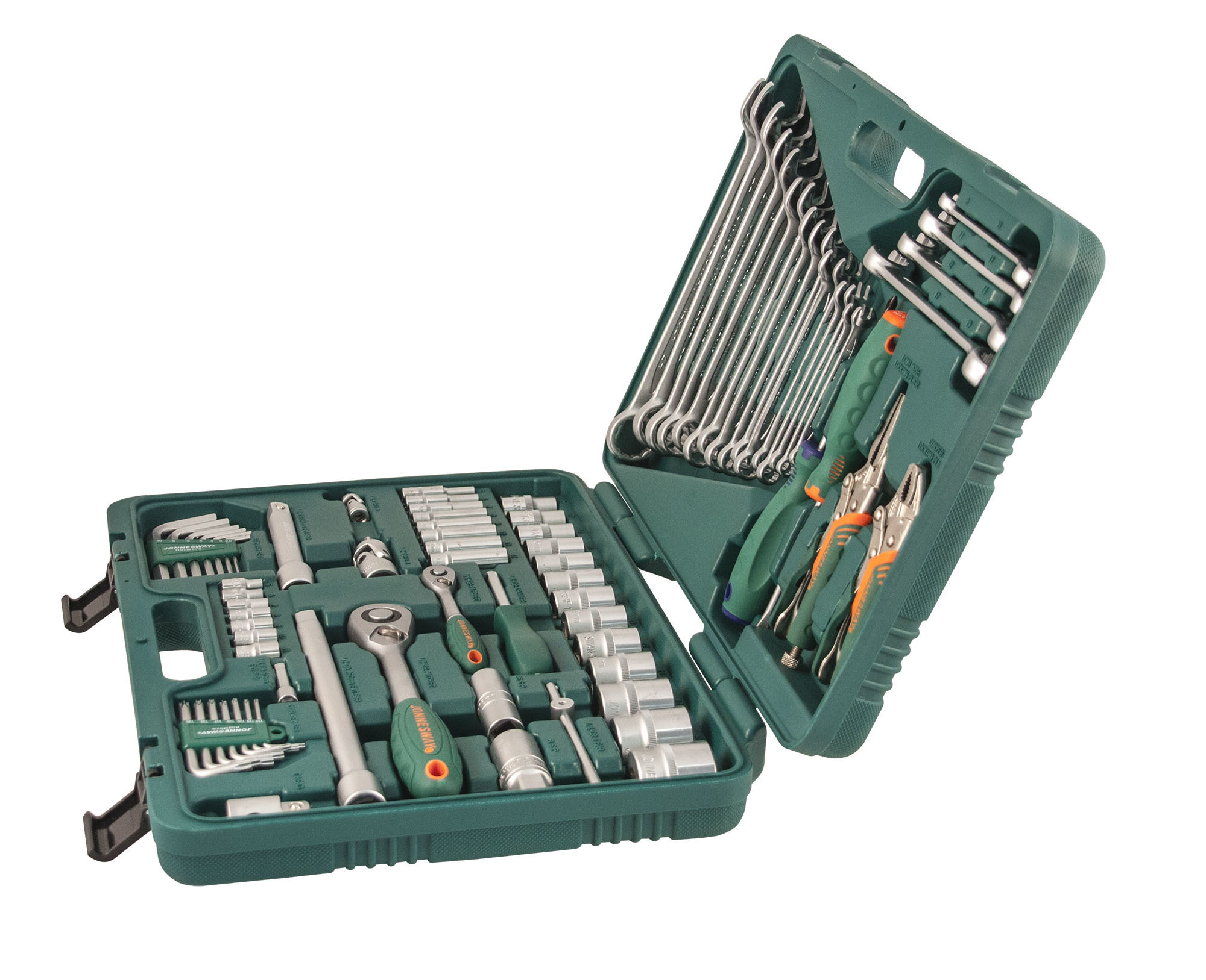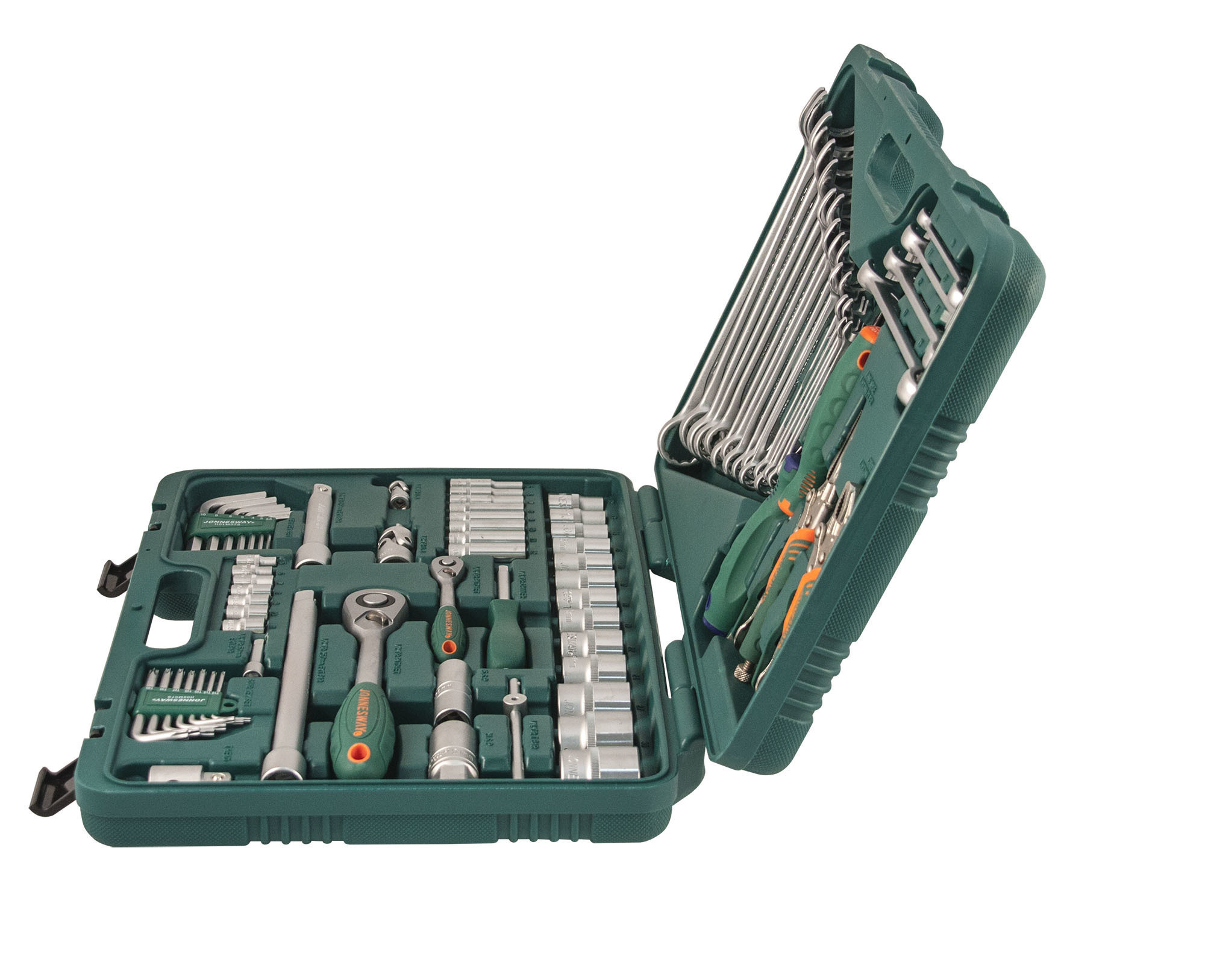 Содержание: Головки торцевые 1/4’’DR, 7 шт.: 5, 6, 7, 8, 9, 10, 11 мм; Головки торцевые глубокие 1/4’’DR, 8 шт.: 5, 6, 7, 8, 9, 10, 11, 12 мм; Головки торцевые 1/2’’DR, 13 шт.: 12, 13, 14, 15, 16, 17, 18, 19, 22, 24, 27, 30, 32 мм; Шарниры карданные, 2 шт.: 1/4’’DR и 1/2’’DR; Головки торцевые свечные, 2 шт.: 16 и 21 мм; Удлинители, 3 шт.: 1/4’’DR x 50 мм, 1/2’’DRх125 мм и 250 мм; Адаптер 3/8’’(F) x 1/2’’(M); Вороток Т-образный 1/4’’DR x 130 мм; Отверточная рукоятка 1/4’’DR; Трещоточная рукоятка, 48 зубцов, 2 шт.: 1/4’’DR и 1/2’’DR; Ключи комбинированные, 16 шт.: 6, 7, 8, 9, 10, 11, 12, 13, 14, 15, 16, 17, 19, 21, 22, 24 мм; Ключи разрезные, 4 шт.: 8х10, 11х13, 12х14, 17х19 мм; Отвертки угловые (торцевые ключи шестигранные), 7 шт.; Отвертки угловые (торцевые ключи Torx), 7 шт.; Отвертки, 2 шт.: (+) PH № 2x100, (-) SL 6,5x100 мм; Ручные тиски 5’’; Ручные тиски 6”; Пластиковый кейс.