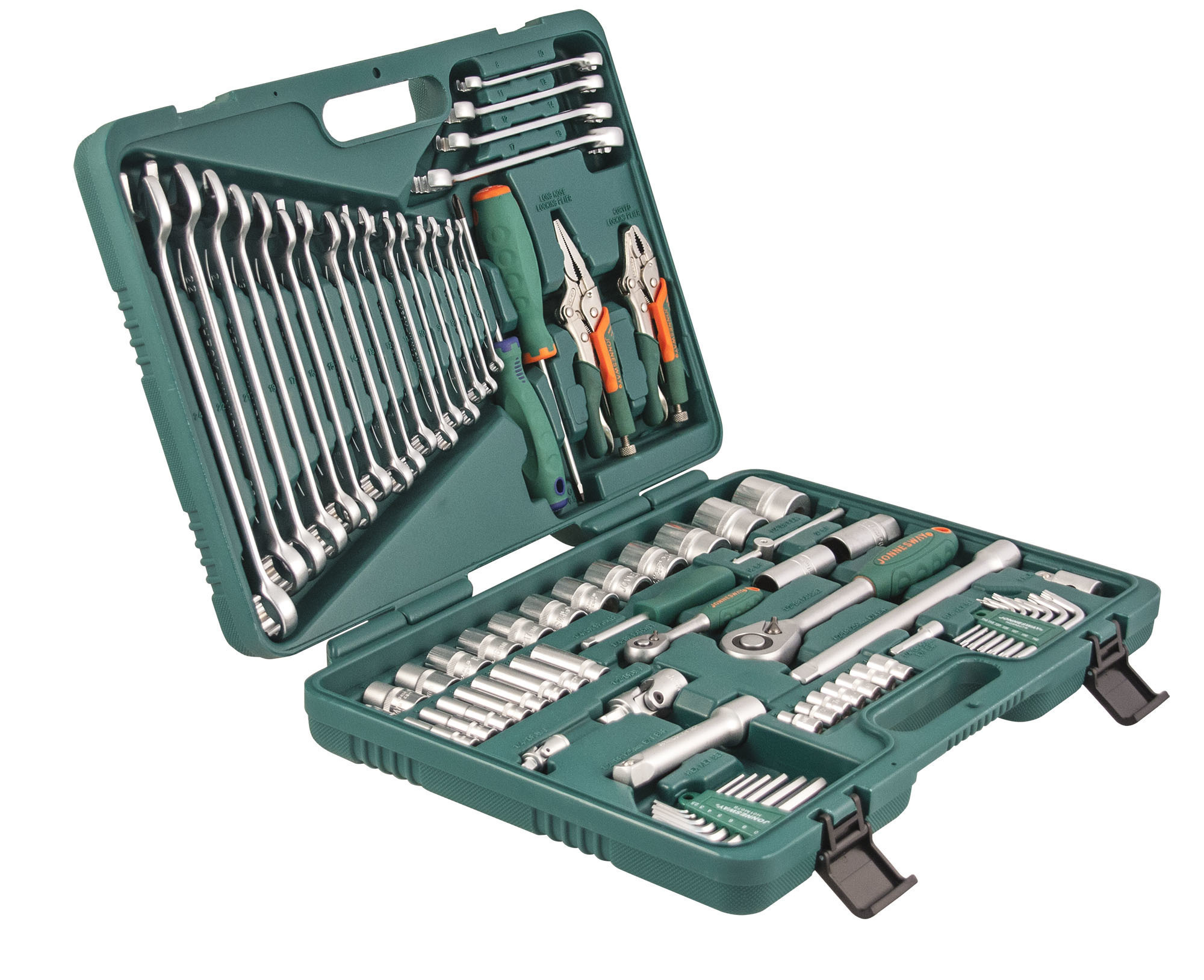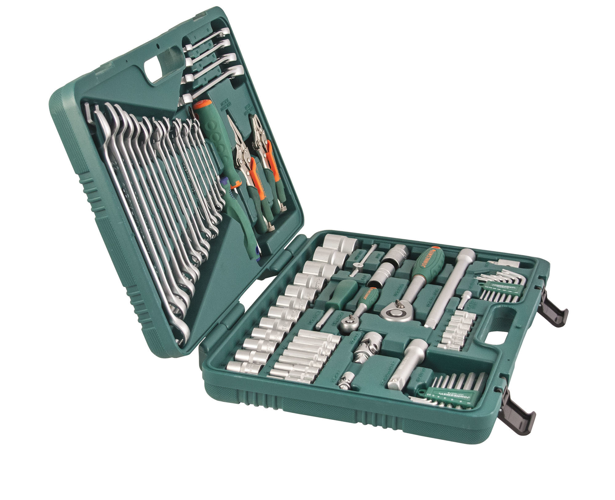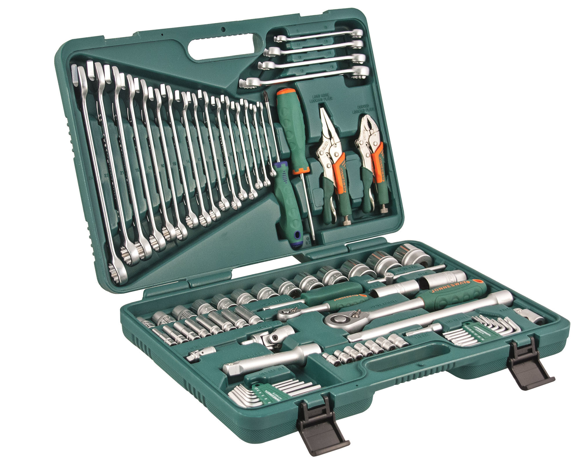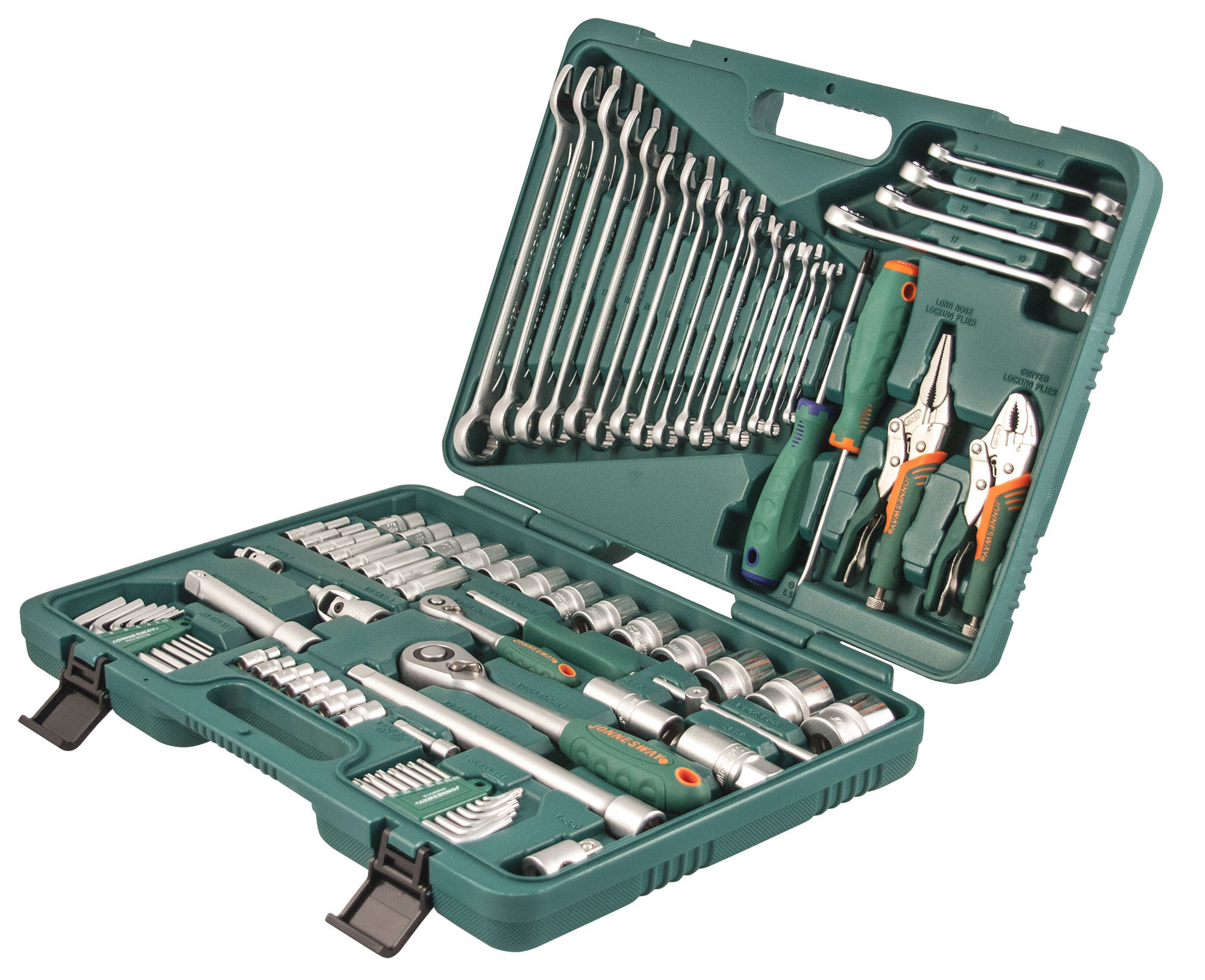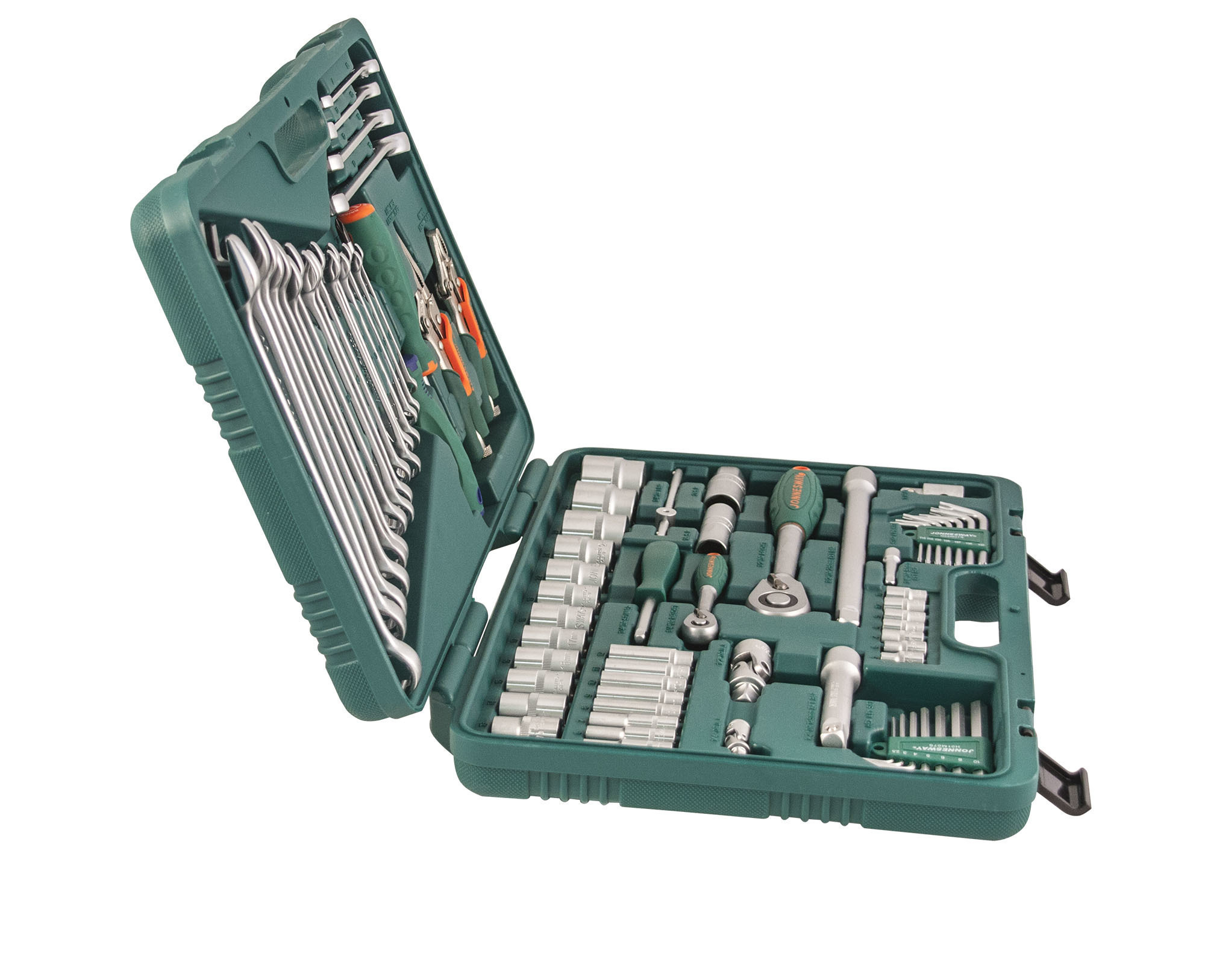 Содержание: Головки торцевые 1/4’’DR, 7 шт.: 5, 6, 7, 8, 9, 10, 11 мм; Головки торцевые глубокие 1/4’’DR, 8 шт.: 5, 6, 7, 8, 9, 10, 11, 12 мм; Головки торцевые 1/2’’DR, 13 шт.: 12, 13, 14, 15, 16, 17, 18, 19, 22, 24, 27, 30, 32 мм; Шарниры карданные, 2 шт.: 1/4’’DR и 1/2’’DR; Головки торцевые свечные, 2 шт.: 16 и 21 мм; Удлинители, 3 шт.: 1/4’’DR x 50 мм, 1/2’’DRх125 мм и 250 мм; Адаптер 3/8’’(F) x 1/2’’(M); Вороток Т-образный 1/4’’DR x 130 мм; Отверточная рукоятка 1/4’’DR; Трещоточная рукоятка, 48 зубцов, 2 шт.: 1/4’’DR и 1/2’’DR; Ключи комбинированные, 16 шт.: 6, 7, 8, 9, 10, 11, 12, 13, 14, 15, 16, 17, 19, 21, 22, 24 мм; Ключи разрезные, 4 шт.: 8х10, 11х13, 12х14, 17х19 мм; Отвертки угловые (торцевые ключи шестигранные), 7 шт.; Отвертки угловые (торцевые ключи Torx), 7 шт.; Отвертки, 2 шт.: (+) PH № 2x100, (-) SL 6,5x100 мм; Ручные тиски 5’’; Ручные тиски 6”; Пластиковый кейс.