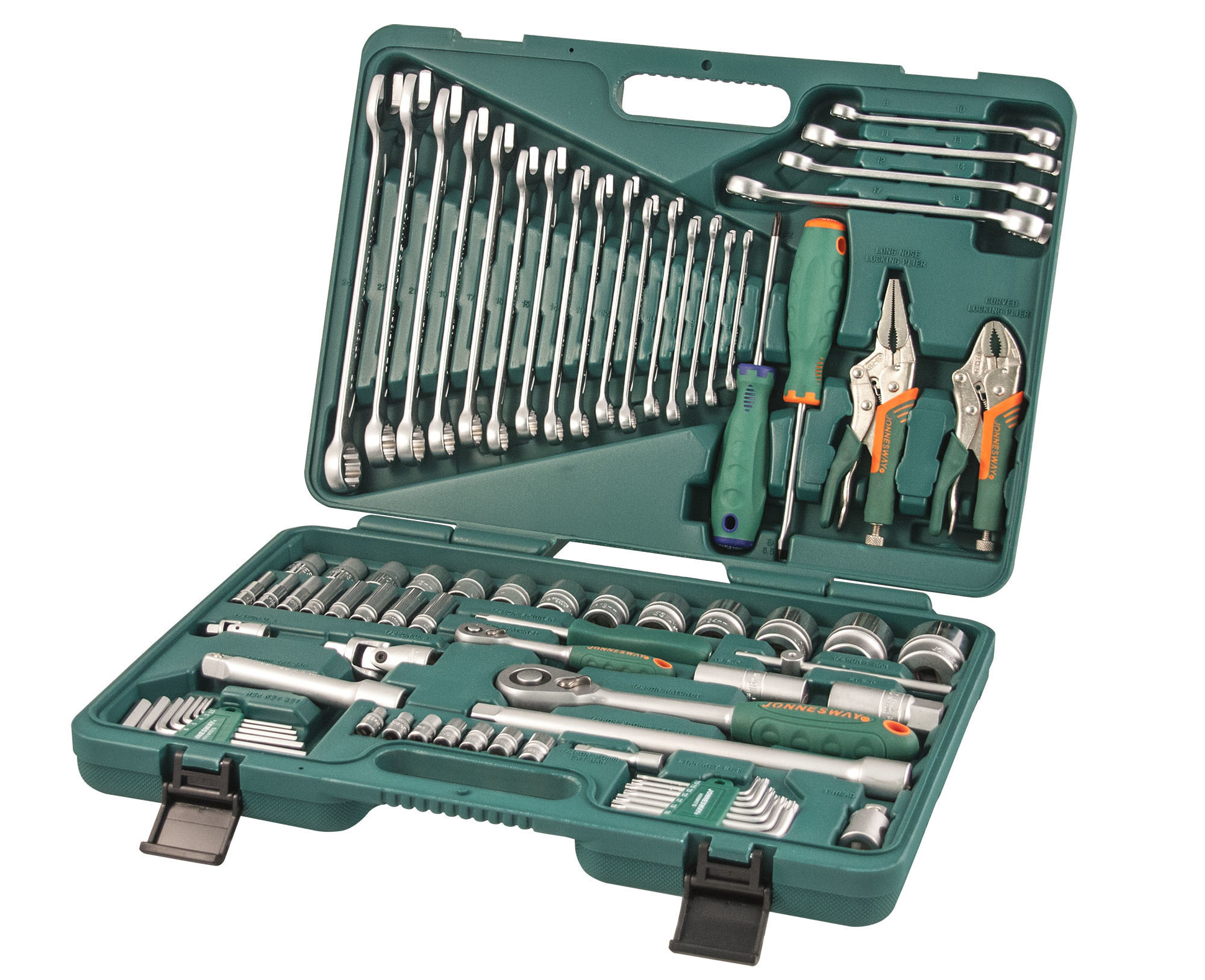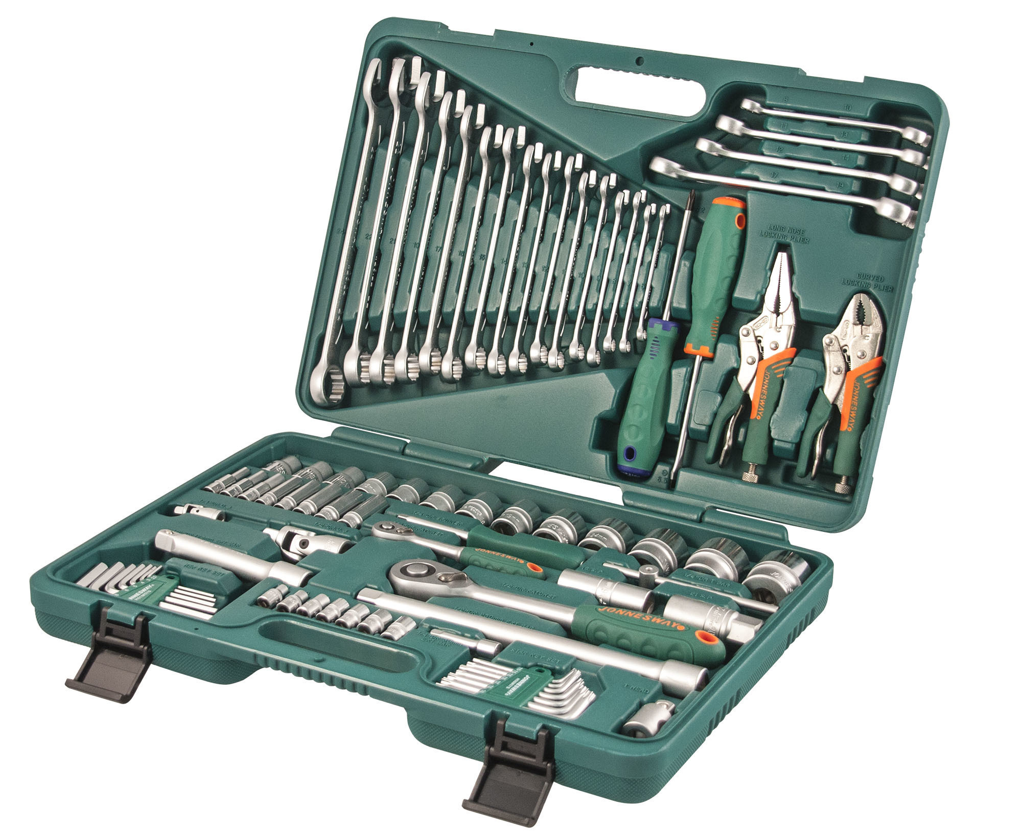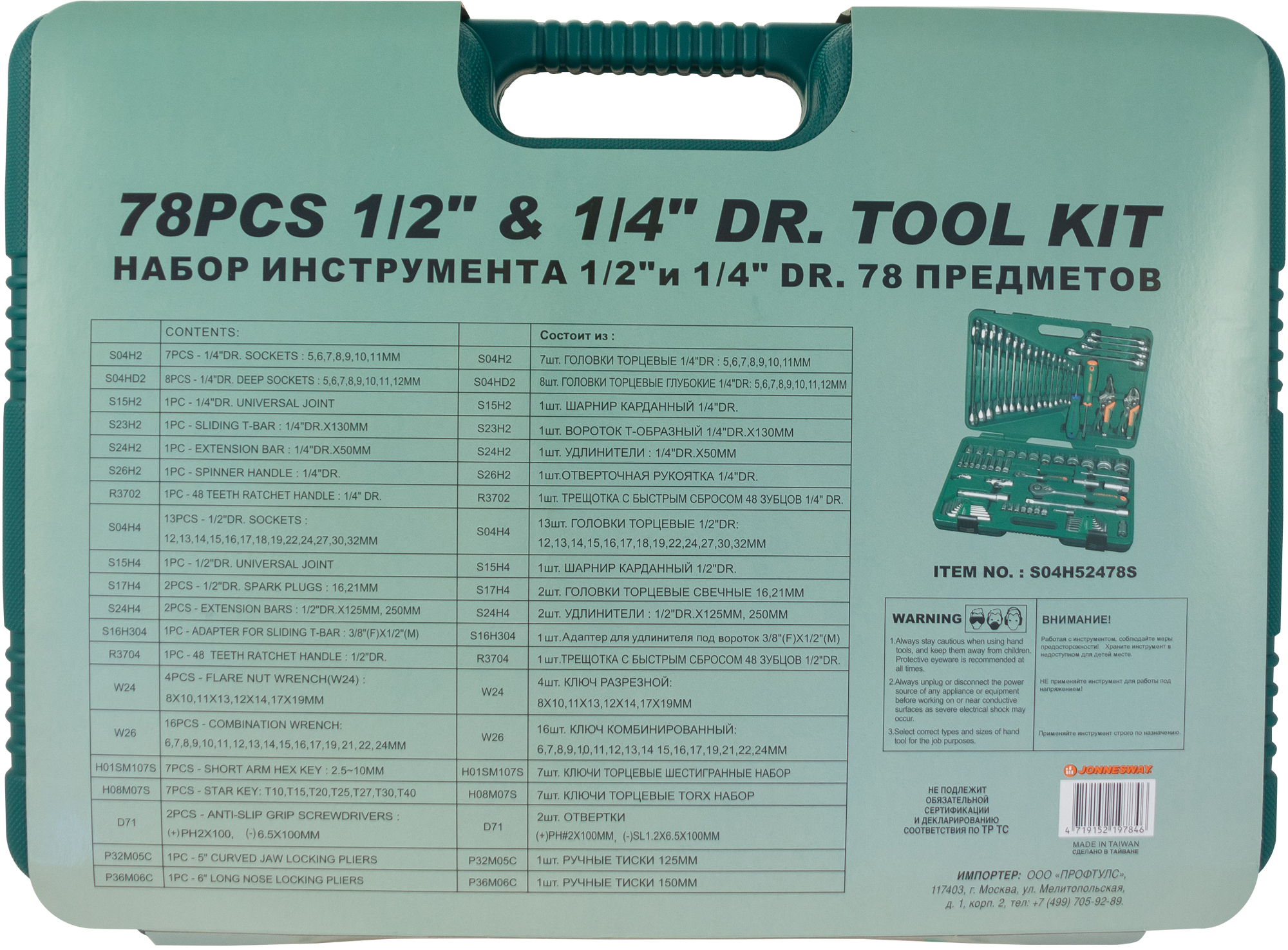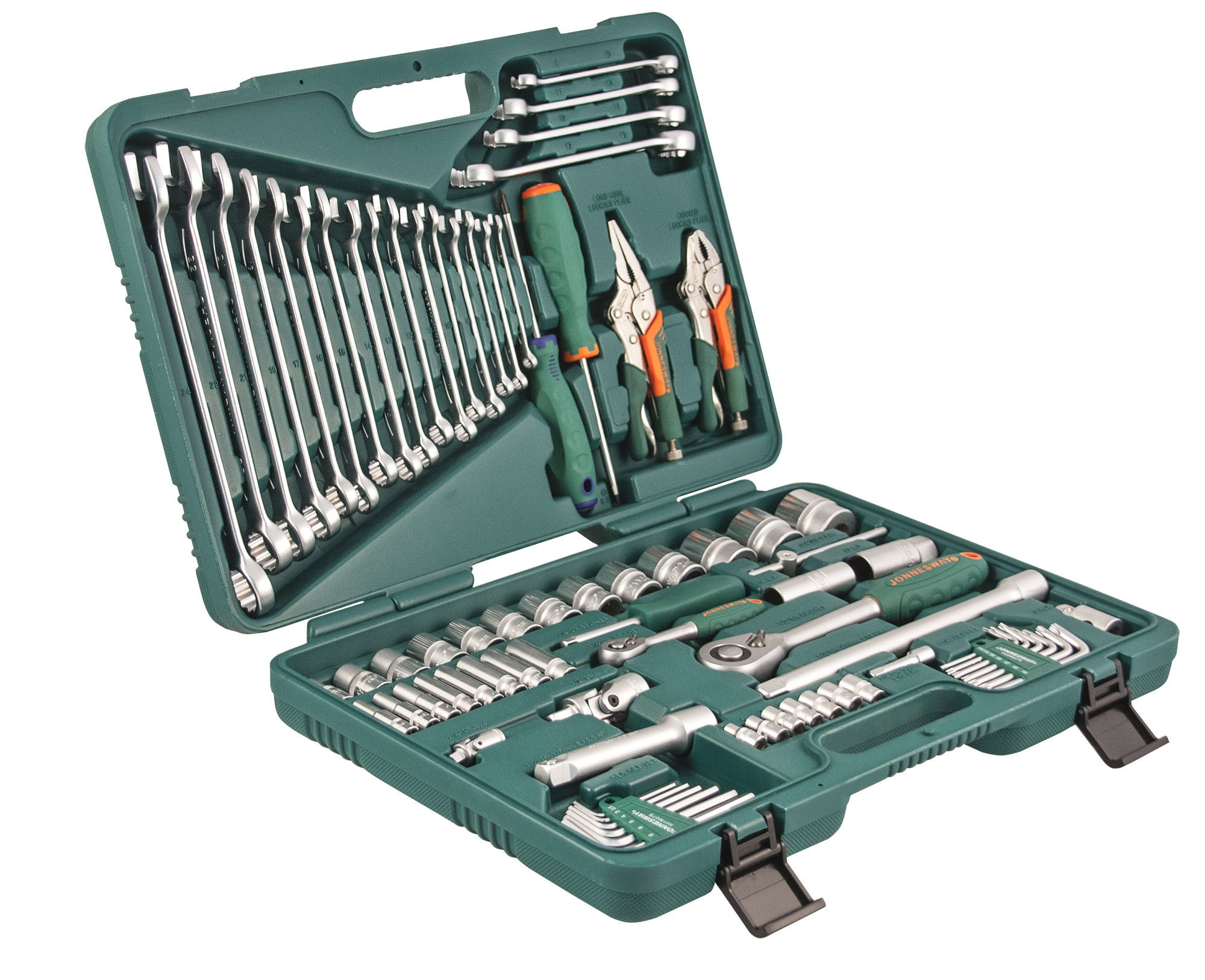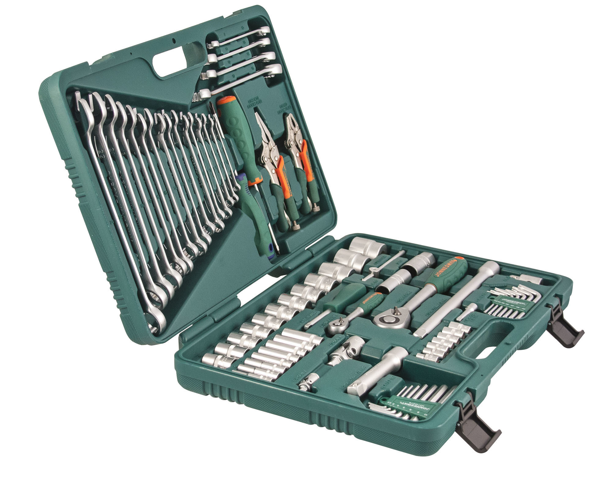 Содержание: Головки торцевые 1/4’’DR, 7 шт.: 5, 6, 7, 8, 9, 10, 11 мм; Головки торцевые глубокие 1/4’’DR, 8 шт.: 5, 6, 7, 8, 9, 10, 11, 12 мм; Головки торцевые 1/2’’DR, 13 шт.: 12, 13, 14, 15, 16, 17, 18, 19, 22, 24, 27, 30, 32 мм; Шарниры карданные, 2 шт.: 1/4’’DR и 1/2’’DR; Головки торцевые свечные, 2 шт.: 16 и 21 мм; Удлинители, 3 шт.: 1/4’’DR x 50 мм, 1/2’’DRх125 мм и 250 мм; Адаптер 3/8’’(F) x 1/2’’(M); Вороток Т-образный 1/4’’DR x 130 мм; Отверточная рукоятка 1/4’’DR; Трещоточная рукоятка, 48 зубцов, 2 шт.: 1/4’’DR и 1/2’’DR; Ключи комбинированные, 16 шт.: 6, 7, 8, 9, 10, 11, 12, 13, 14, 15, 16, 17, 19, 21, 22, 24 мм; Ключи разрезные, 4 шт.: 8х10, 11х13, 12х14, 17х19 мм; Отвертки угловые (торцевые ключи шестигранные), 7 шт.; Отвертки угловые (торцевые ключи Torx), 7 шт.; Отвертки, 2 шт.: (+) PH № 2x100, (-) SL 6,5x100 мм; Ручные тиски 5’’; Ручные тиски 6”; Пластиковый кейс.