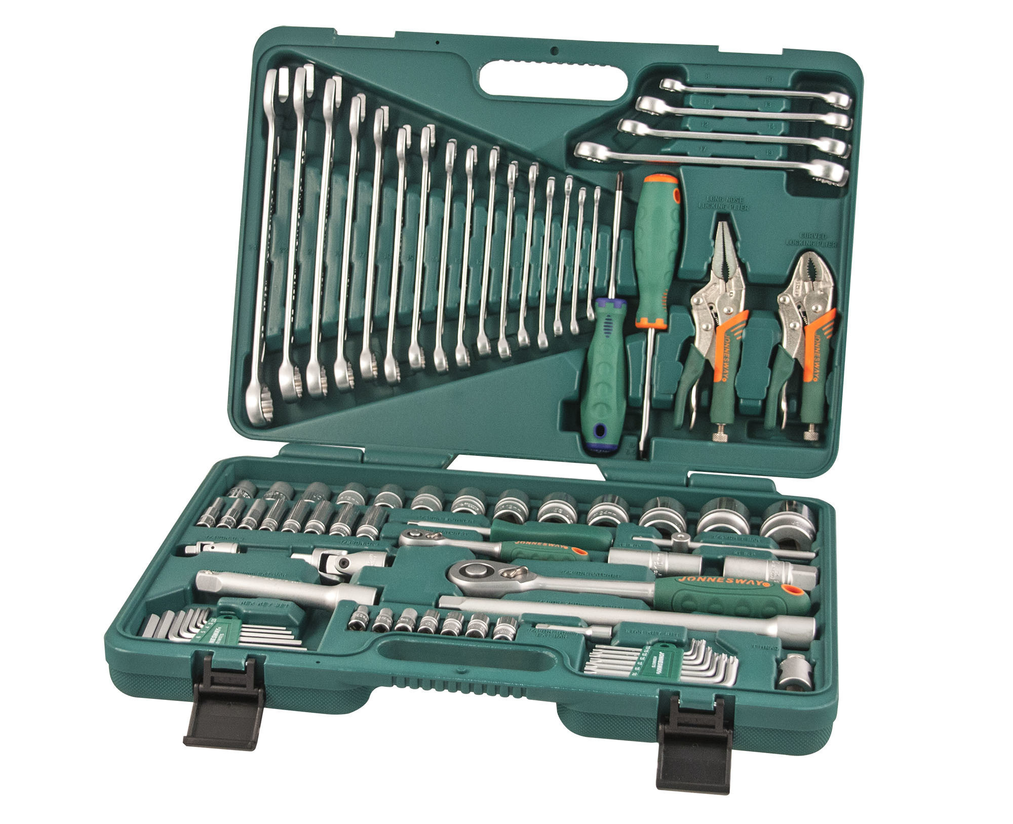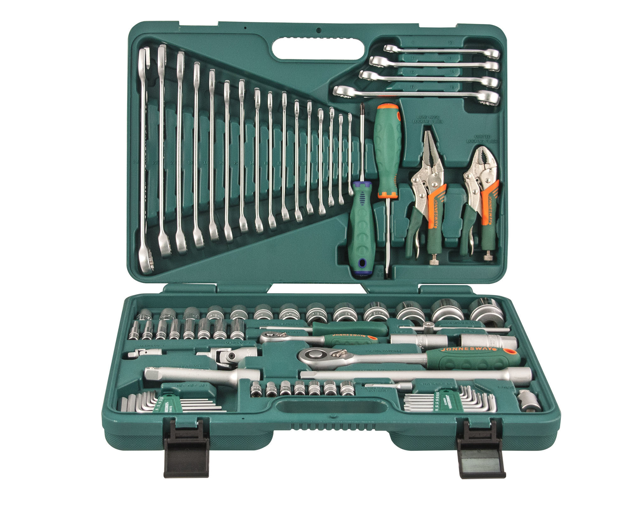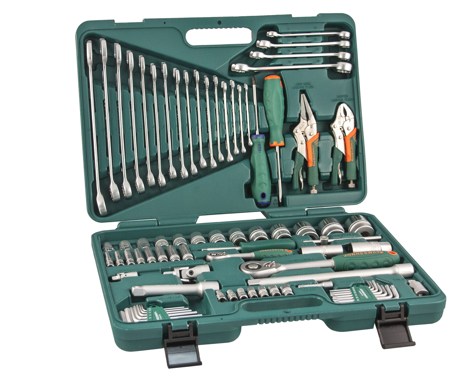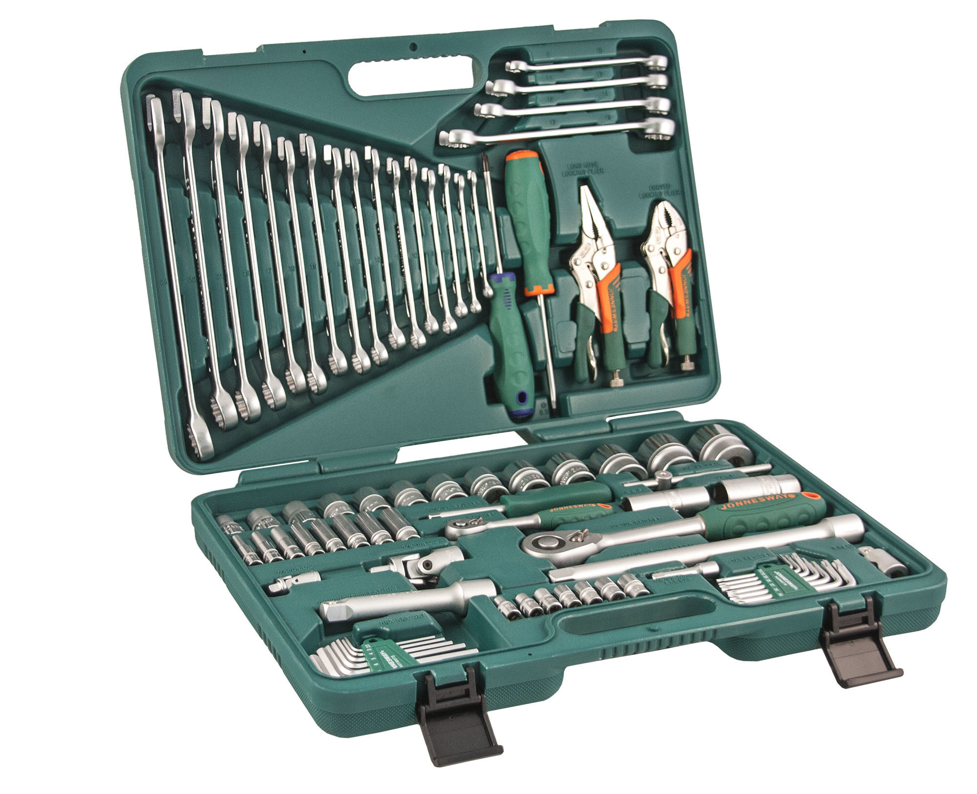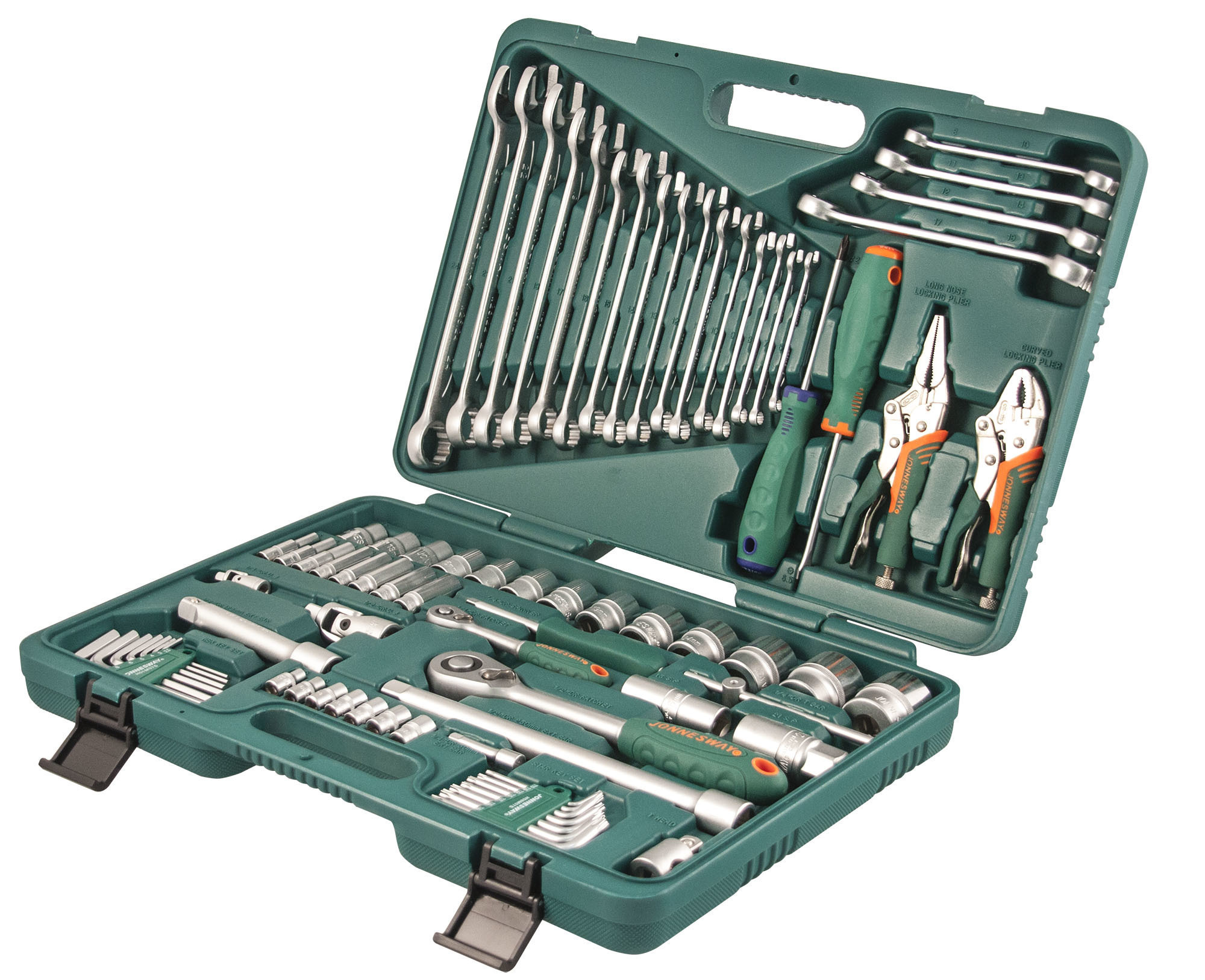 Содержание: Головки торцевые 1/4’’DR, 7 шт.: 5, 6, 7, 8, 9, 10, 11 мм; Головки торцевые глубокие 1/4’’DR, 8 шт.: 5, 6, 7, 8, 9, 10, 11, 12 мм; Головки торцевые 1/2’’DR, 13 шт.: 12, 13, 14, 15, 16, 17, 18, 19, 22, 24, 27, 30, 32 мм; Шарниры карданные, 2 шт.: 1/4’’DR и 1/2’’DR; Головки торцевые свечные, 2 шт.: 16 и 21 мм; Удлинители, 3 шт.: 1/4’’DR x 50 мм, 1/2’’DRх125 мм и 250 мм; Адаптер 3/8’’(F) x 1/2’’(M); Вороток Т-образный 1/4’’DR x 130 мм; Отверточная рукоятка 1/4’’DR; Трещоточная рукоятка, 48 зубцов, 2 шт.: 1/4’’DR и 1/2’’DR; Ключи комбинированные, 16 шт.: 6, 7, 8, 9, 10, 11, 12, 13, 14, 15, 16, 17, 19, 21, 22, 24 мм; Ключи разрезные, 4 шт.: 8х10, 11х13, 12х14, 17х19 мм; Отвертки угловые (торцевые ключи шестигранные), 7 шт.; Отвертки угловые (торцевые ключи Torx), 7 шт.; Отвертки, 2 шт.: (+) PH № 2x100, (-) SL 6,5x100 мм; Ручные тиски 5’’; Ручные тиски 6”; Пластиковый кейс.