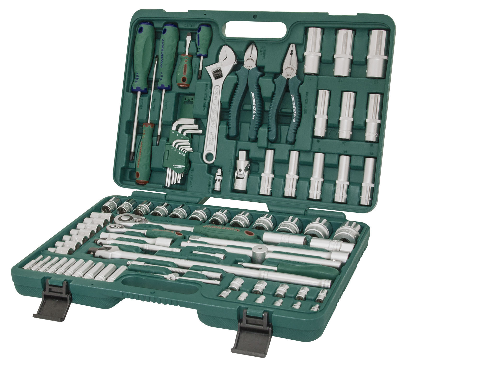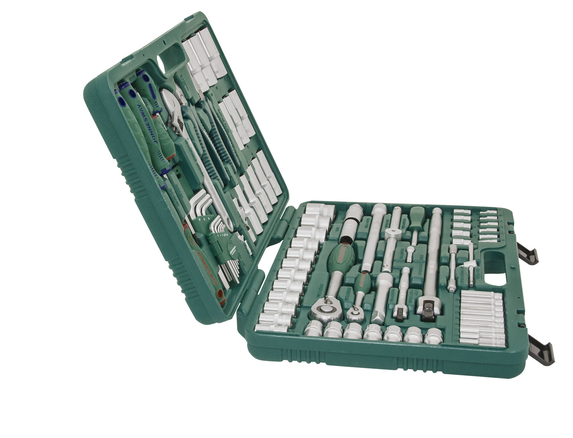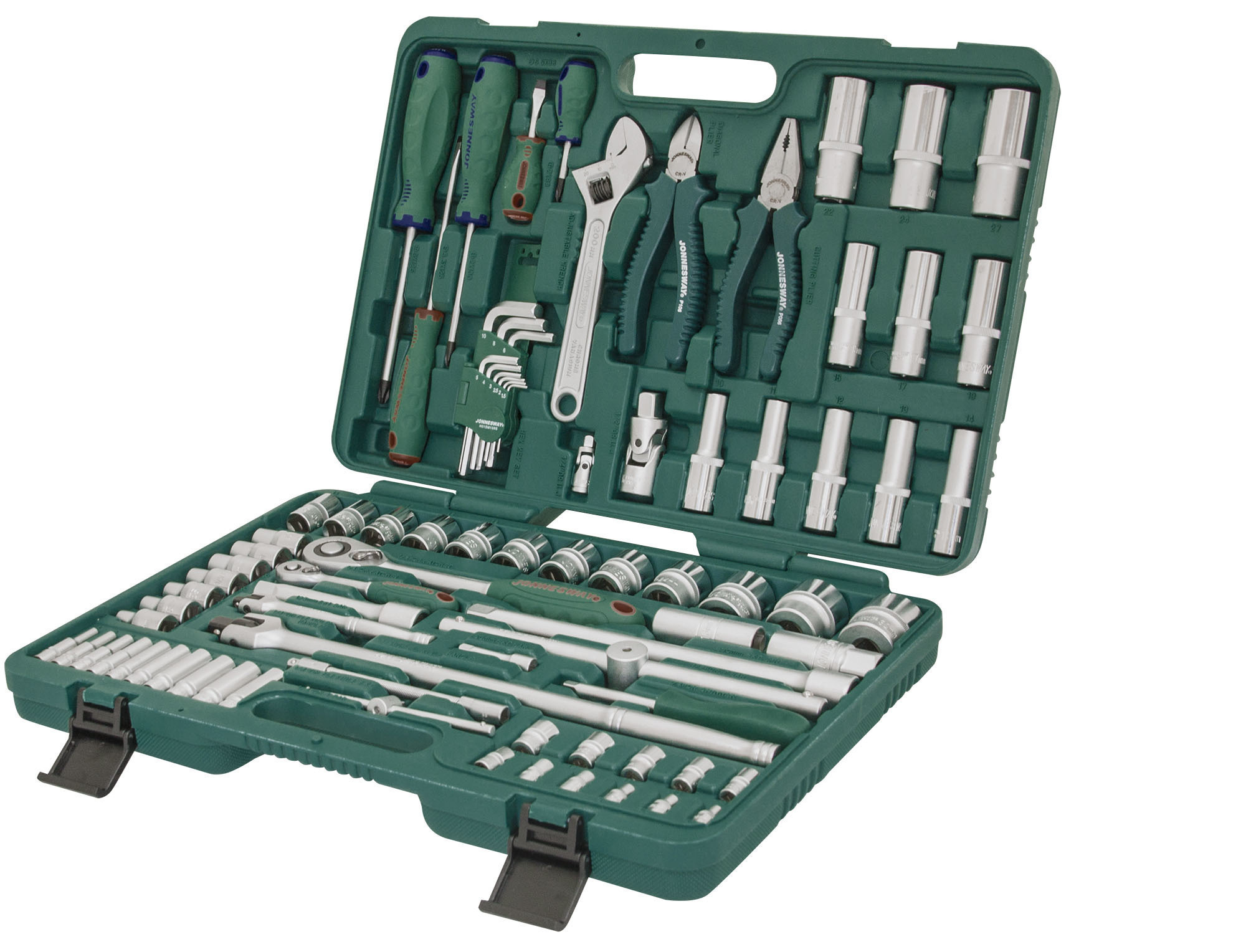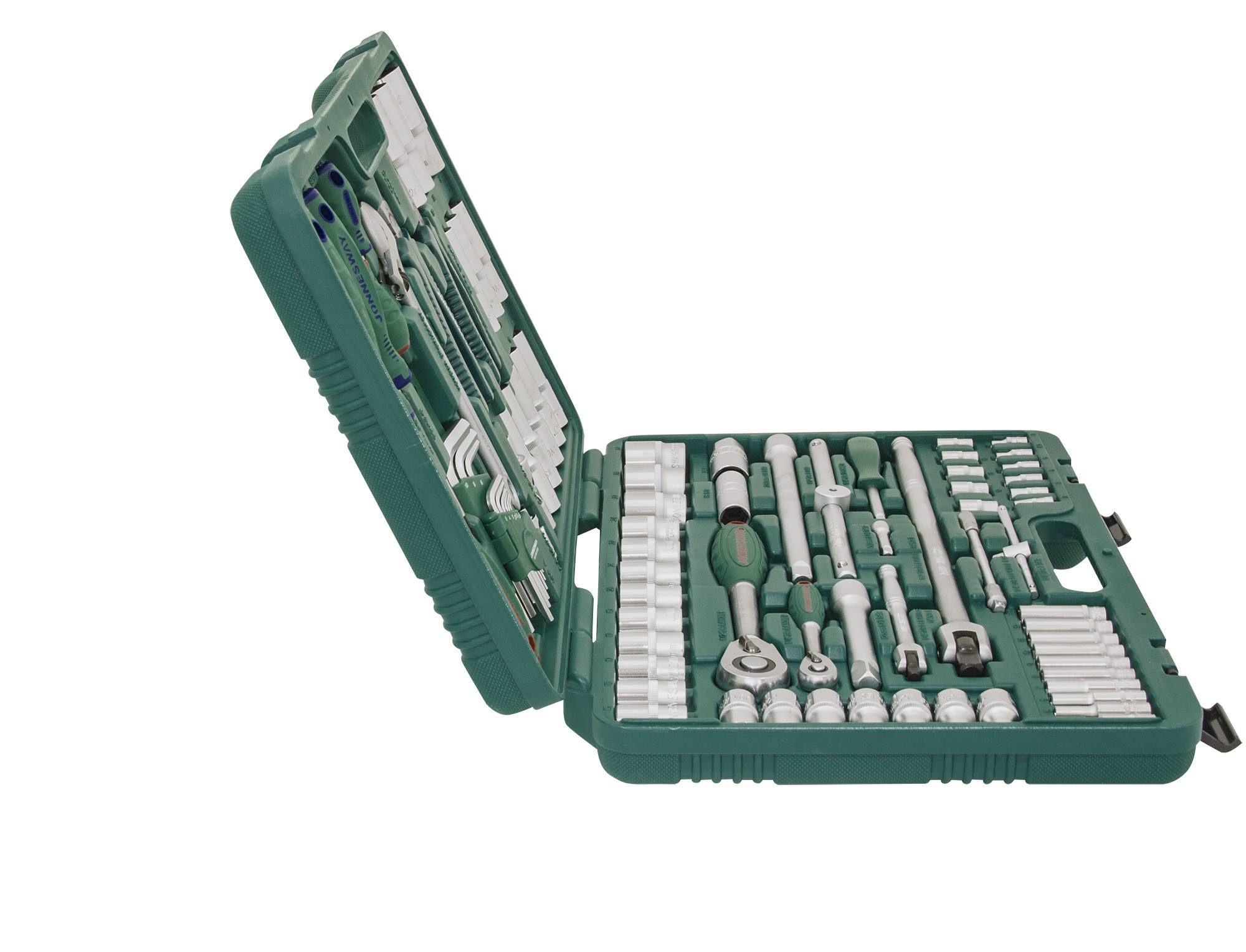 Содержание: Головки торцевые 1/4’’DR, 11 шт.: 4, 4.5, 5, 6, 7, 8, 9, 10, 11, 12, 13 мм; Головки торцевые глубокие 1/4’’DR, 10 шт.: 4, 5, 6, 7, 8, 9, 10, 11, 12, 13 мм; Головки торцевые 1/2’’DR, 19 шт.: 8, 9, 10, 11, 12, 13, 14, 15, 16, 17, 18, 19, 20, 21, 22, 24, 27, 30, 32 мм; Головки торцевые глубокие 1/2’’DR, 11 шт.: 10, 11, 12, 13, 14, 15, 17, 19, 22, 24, 27 мм; Шарниры карданные, 2 шт.: 1/4’’DR и 1/2’’DR; Головки торцевые свечные, 2 шт.: 16, 21 мм; Удлинители, 3 шт.: 1/4’’DRх50 мм, 1/2’’DRх125 мм, 250 мм; Отверточная рукоятка 1/4’’DR; Воротоки гибкая рукоятка, 2 шт.: 1/4’’DRх130 мм, 1/2’’DRх375 мм; Воротоки Т-образные, 2 шт.: 1/4’’DRх130 мм, 1/2’’DRх250 мм; Гибкий удлинитель 1/4’’DRх145 мм; Трещоточные рукоятки,48 зубцов, 2 шт.: 1/4’’DR и 1/2’’DR; Отвертки угловые (торцевые ключи шестигранные), 9 шт.: 1.5, 2, 2.5, 3, 4, 5, 6, 8, 10 мм; Отвертки, 5 шт.: (+) PH2x38, (+) PH2x100, (+) PH3x125, (-) SL 6.5x38, (-) SL 5x125 мм; Бокорезы 6" (150 мм); Пассатижи 6" (150 мм); Ключ разводной 8" (200 мм); Пластиковый кейс.