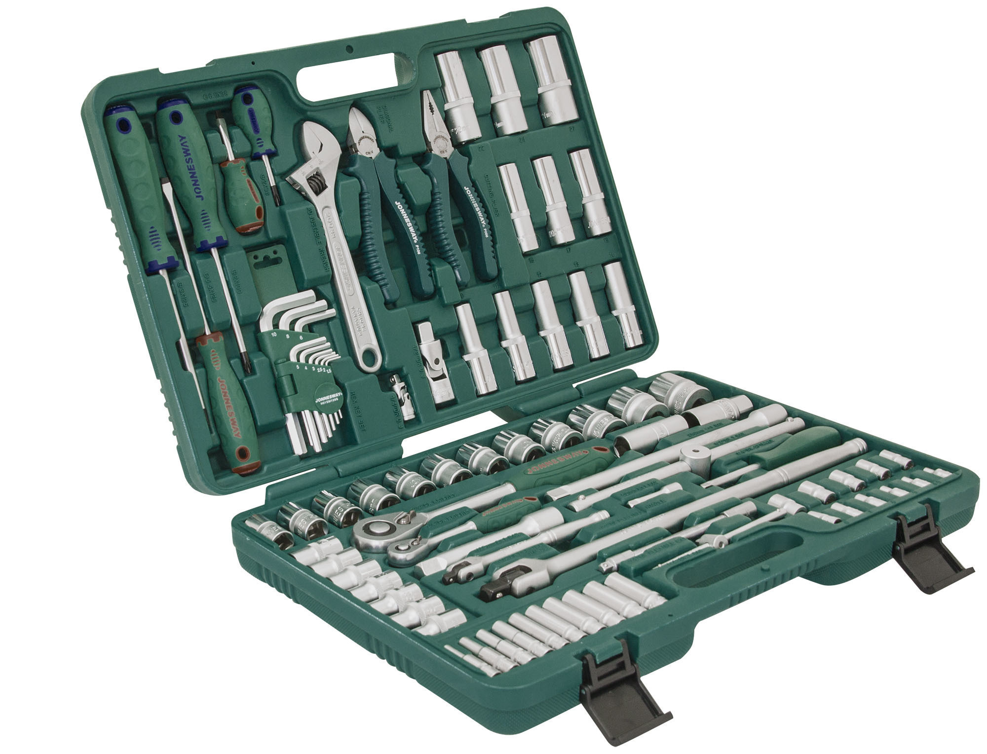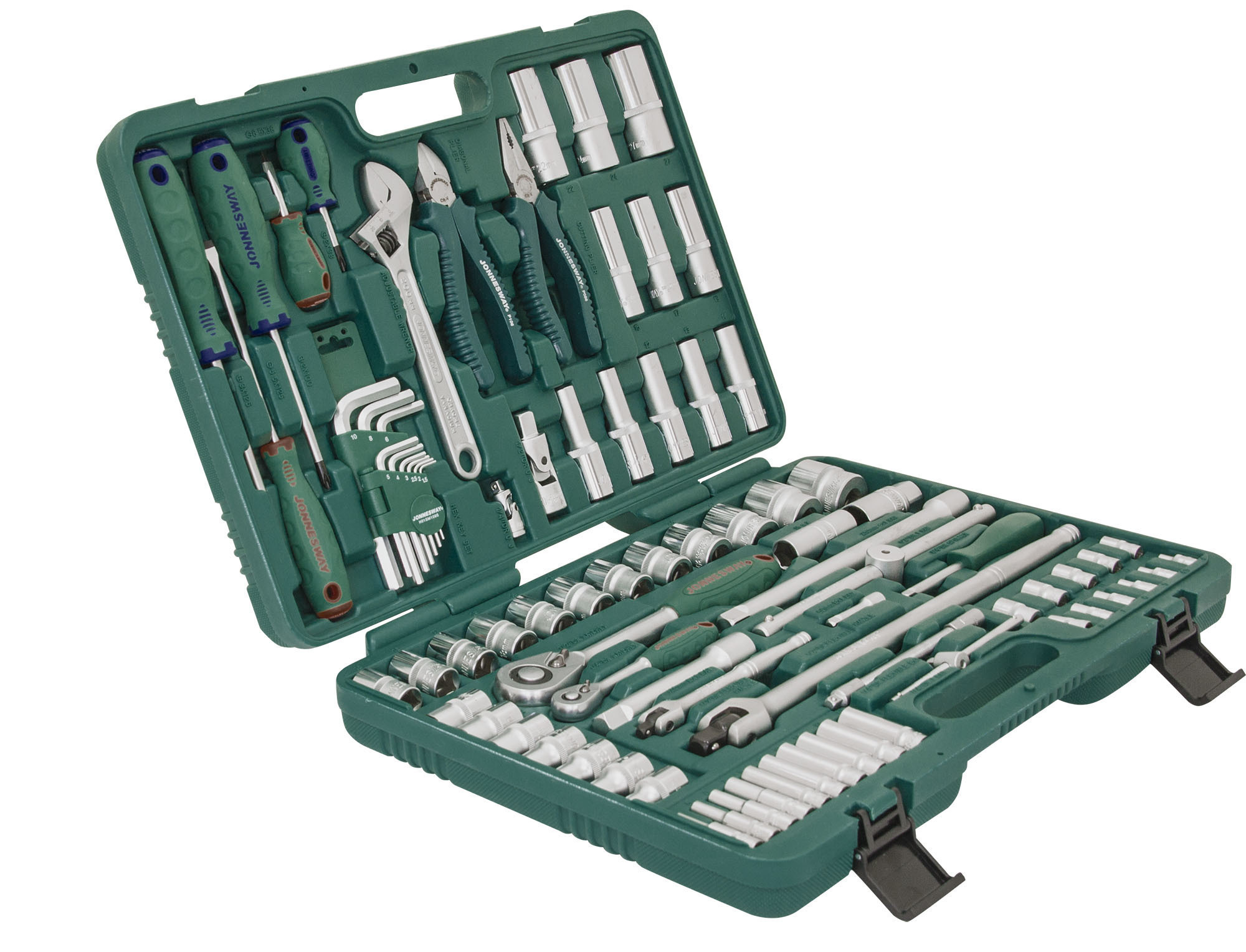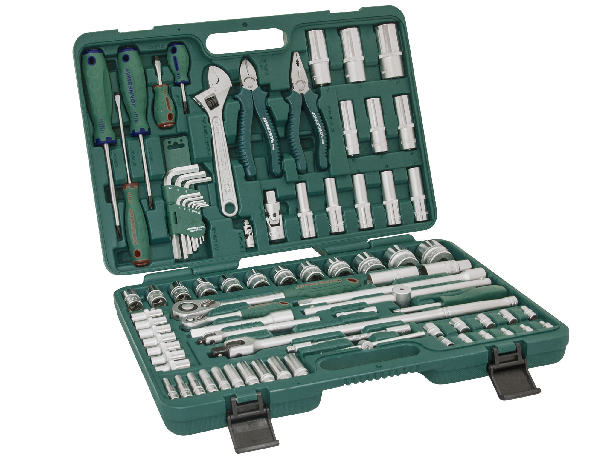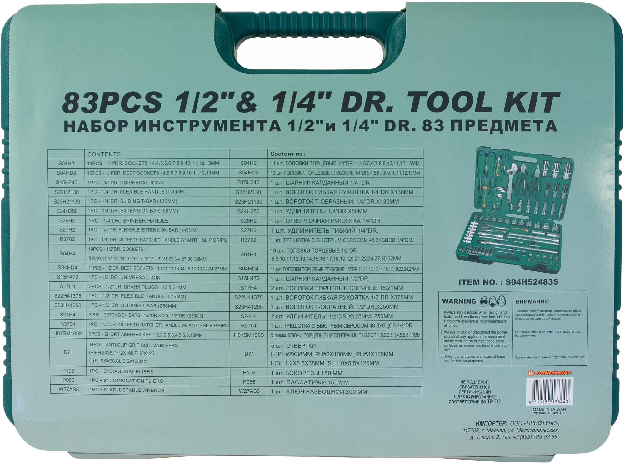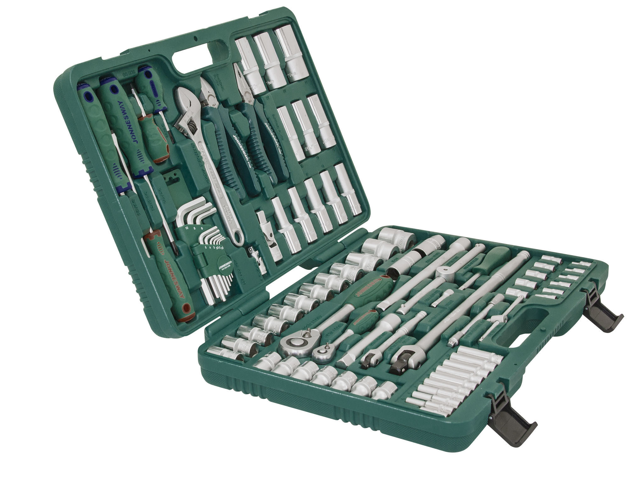 Содержание: Головки торцевые 1/4’’DR, 11 шт.: 4, 4.5, 5, 6, 7, 8, 9, 10, 11, 12, 13 мм; Головки торцевые глубокие 1/4’’DR, 10 шт.: 4, 5, 6, 7, 8, 9, 10, 11, 12, 13 мм; Головки торцевые 1/2’’DR, 19 шт.: 8, 9, 10, 11, 12, 13, 14, 15, 16, 17, 18, 19, 20, 21, 22, 24, 27, 30, 32 мм; Головки торцевые глубокие 1/2’’DR, 11 шт.: 10, 11, 12, 13, 14, 15, 17, 19, 22, 24, 27 мм; Шарниры карданные, 2 шт.: 1/4’’DR и 1/2’’DR; Головки торцевые свечные, 2 шт.: 16, 21 мм; Удлинители, 3 шт.: 1/4’’DRх50 мм, 1/2’’DRх125 мм, 250 мм; Отверточная рукоятка 1/4’’DR; Воротоки гибкая рукоятка, 2 шт.: 1/4’’DRх130 мм, 1/2’’DRх375 мм; Воротоки Т-образные, 2 шт.: 1/4’’DRх130 мм, 1/2’’DRх250 мм; Гибкий удлинитель 1/4’’DRх145 мм; Трещоточные рукоятки,48 зубцов, 2 шт.: 1/4’’DR и 1/2’’DR; Отвертки угловые (торцевые ключи шестигранные), 9 шт.: 1.5, 2, 2.5, 3, 4, 5, 6, 8, 10 мм; Отвертки, 5 шт.: (+) PH2x38, (+) PH2x100, (+) PH3x125, (-) SL 6.5x38, (-) SL 5x125 мм; Бокорезы 6" (150 мм); Пассатижи 6" (150 мм); Ключ разводной 8" (200 мм); Пластиковый кейс.