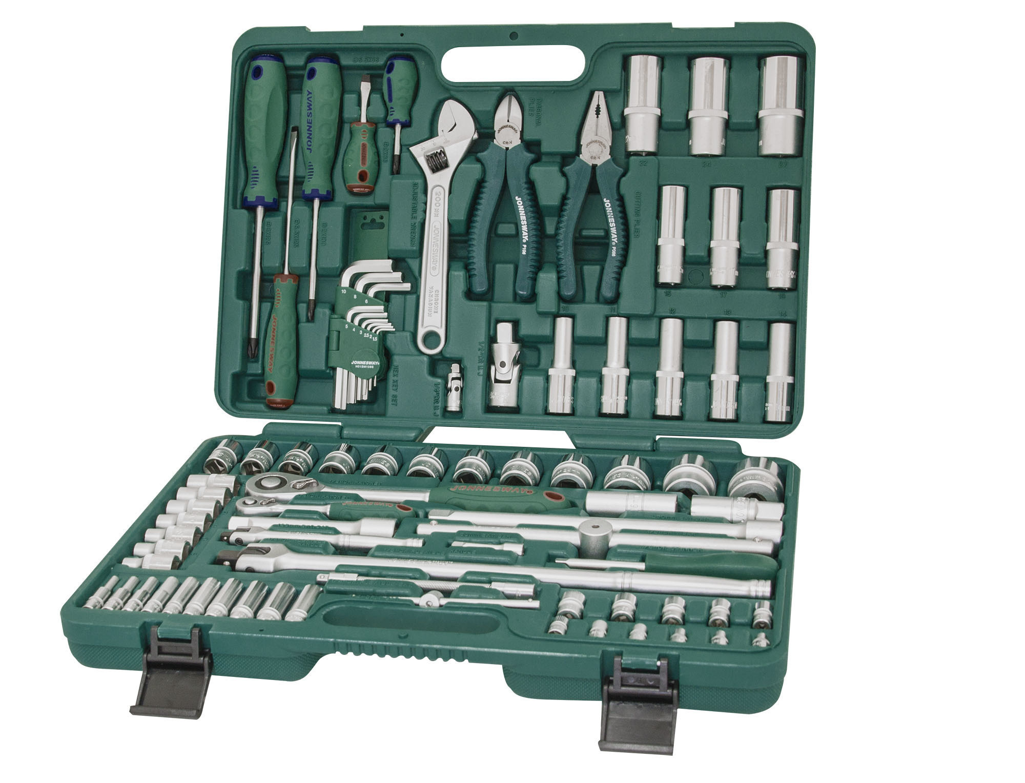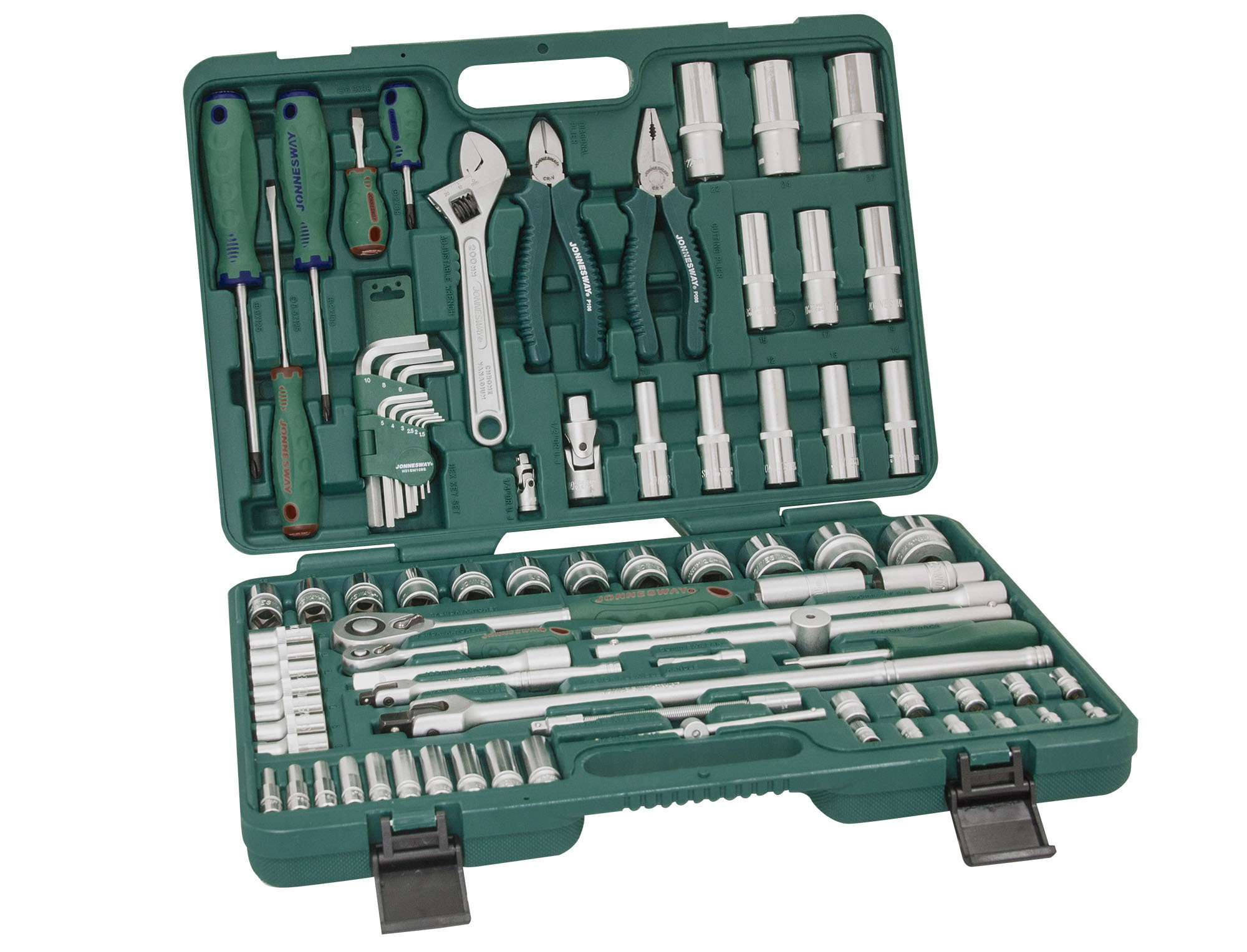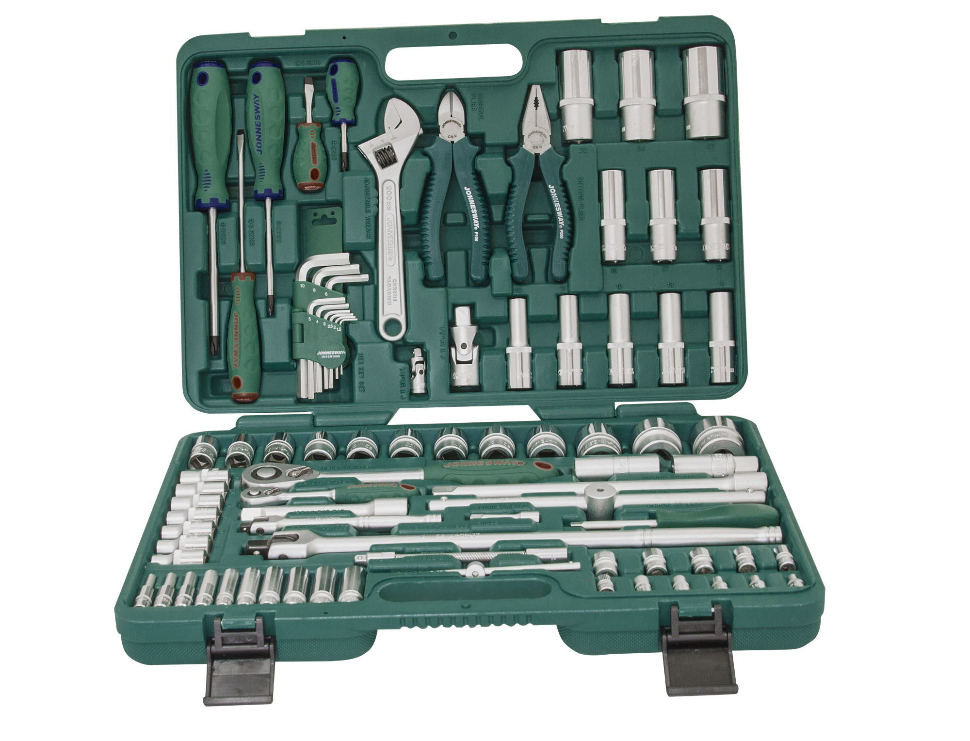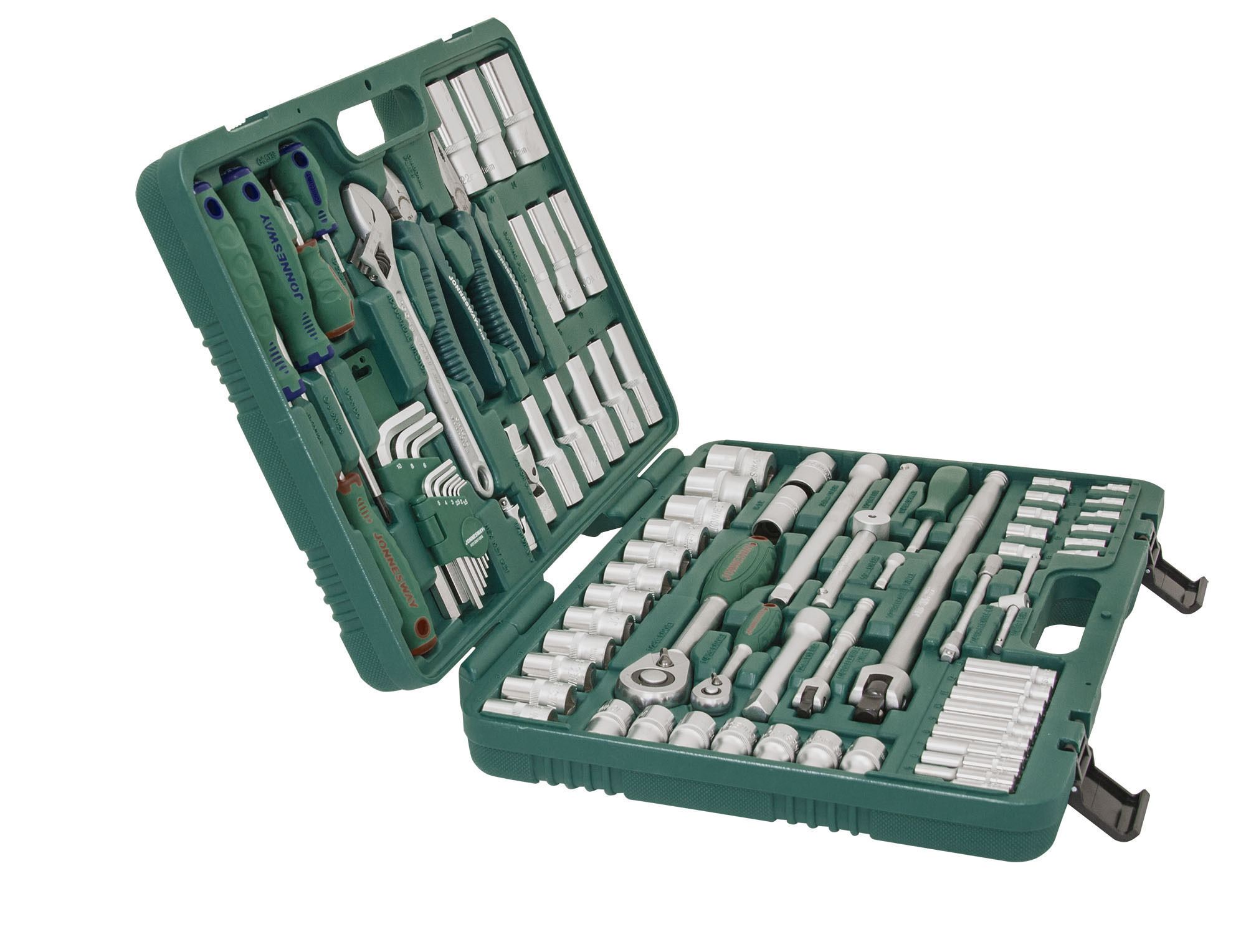 Содержание: Головки торцевые 1/4’’DR, 11 шт.: 4, 4.5, 5, 6, 7, 8, 9, 10, 11, 12, 13 мм; Головки торцевые глубокие 1/4’’DR, 10 шт.: 4, 5, 6, 7, 8, 9, 10, 11, 12, 13 мм; Головки торцевые 1/2’’DR, 19 шт.: 8, 9, 10, 11, 12, 13, 14, 15, 16, 17, 18, 19, 20, 21, 22, 24, 27, 30, 32 мм; Головки торцевые глубокие 1/2’’DR, 11 шт.: 10, 11, 12, 13, 14, 15, 17, 19, 22, 24, 27 мм; Шарниры карданные, 2 шт.: 1/4’’DR и 1/2’’DR; Головки торцевые свечные, 2 шт.: 16, 21 мм; Удлинители, 3 шт.: 1/4’’DRх50 мм, 1/2’’DRх125 мм, 250 мм; Отверточная рукоятка 1/4’’DR; Воротоки гибкая рукоятка, 2 шт.: 1/4’’DRх130 мм, 1/2’’DRх375 мм; Воротоки Т-образные, 2 шт.: 1/4’’DRх130 мм, 1/2’’DRх250 мм; Гибкий удлинитель 1/4’’DRх145 мм; Трещоточные рукоятки,48 зубцов, 2 шт.: 1/4’’DR и 1/2’’DR; Отвертки угловые (торцевые ключи шестигранные), 9 шт.: 1.5, 2, 2.5, 3, 4, 5, 6, 8, 10 мм; Отвертки, 5 шт.: (+) PH2x38, (+) PH2x100, (+) PH3x125, (-) SL 6.5x38, (-) SL 5x125 мм; Бокорезы 6" (150 мм); Пассатижи 6" (150 мм); Ключ разводной 8" (200 мм); Пластиковый кейс.