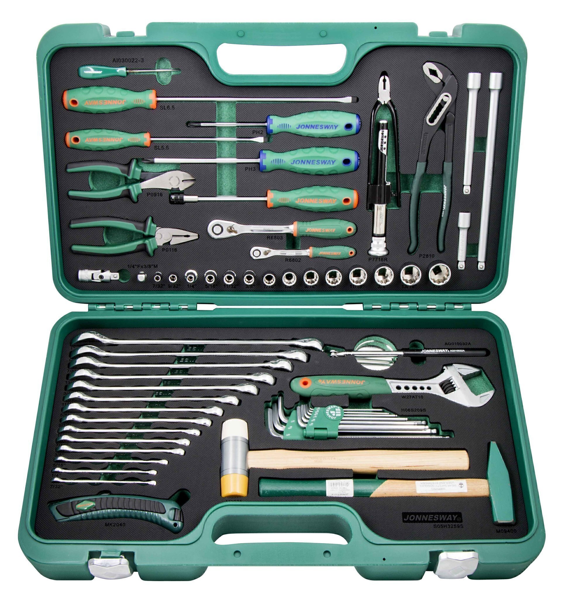 1/4’’DR Головки торцевые дюймовые, 2 шт.: 7/32", 9/32"4 Рукоятка трещоточная, 60 зубцов, 142 мм; 3/8’’DR Головки торцевые дюймовые 12-тигранные , 12 шт.: 1/4", 5/16", 11/32", 3/8", 7/16", 1/2", 9/16", 5/8", 11/16", 3/4", 13/16", 7/8"; Удлинитель с шаром, 3 шт.: 75, 150, 250 мм; Шарнир карданный; Переходник 1/4"DR(F) х 3/8"DR(M); Рукоятка трещоточная, 60 зубцов, 198 мм; Ключи комбинированные дюймовые, 12 шт.: 1/4", 5/16", 3/8", 7/16", 1/2",9/16", 5/8", 11/16", 3/4", 13/16", 7/8", 15/16", 1", 7/32"; Отвертка стержневая крестовая ANTI-SLIP GRIP, PH2х100 мм; Отвертка стержневая крестовая ANTI-SLIP GRIP, PH3x150 мм; Отвертка стержневая шлицевая ANTI-SLIP GRIP, SL5.5х150 мм; Отвертка стержневая шлицевая ANTI-SLIP GRIP, SL6.5х250 мм; Рукоятка отверточная с держателем бит 1/4"; Набор ключей торцевых шестигранных удлиненных с шаром дюймовых, 9 предметов; Пассатижи со смещенным центром шарнира и двухкомпонентными рукоятками, 160 мм; Плоскогубцы для скручивания проволоки (твистеры), 160 мм; Бокорезы усиленные с двухкомпонентными рукоятками, 160 мм; Клещи переставные с коробчатым захватом, 250 мм; Ключ разводной эргономичный с пластиковой ручкой, 0-29 мм, L-250 мм; Молоток со сменными пластиковыми бойками; Молоток с деревянной ручкой (орех), 400 гр.; Ключ разводной эргономичный с пластиковой ручкой, 0-29 мм, L-250 мм; Нож хозяйственный универсальный; Шило; Зеркало инспекционное телескопическое, Ø32мм; Пластиковый кейс.