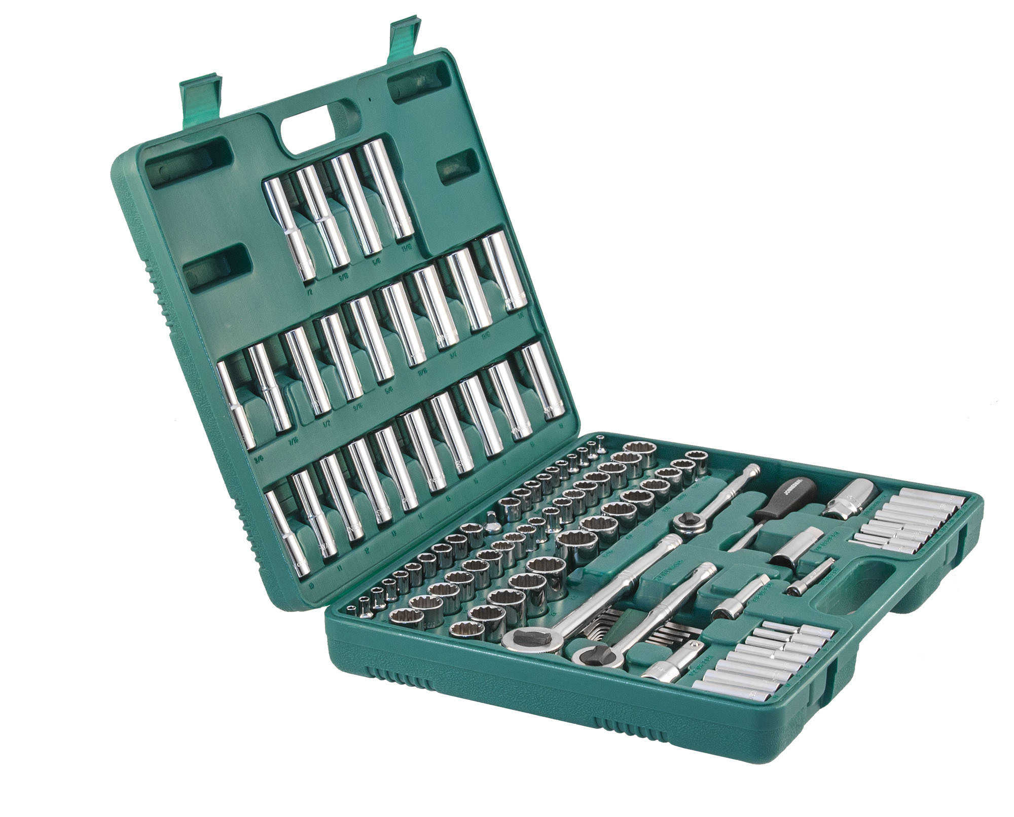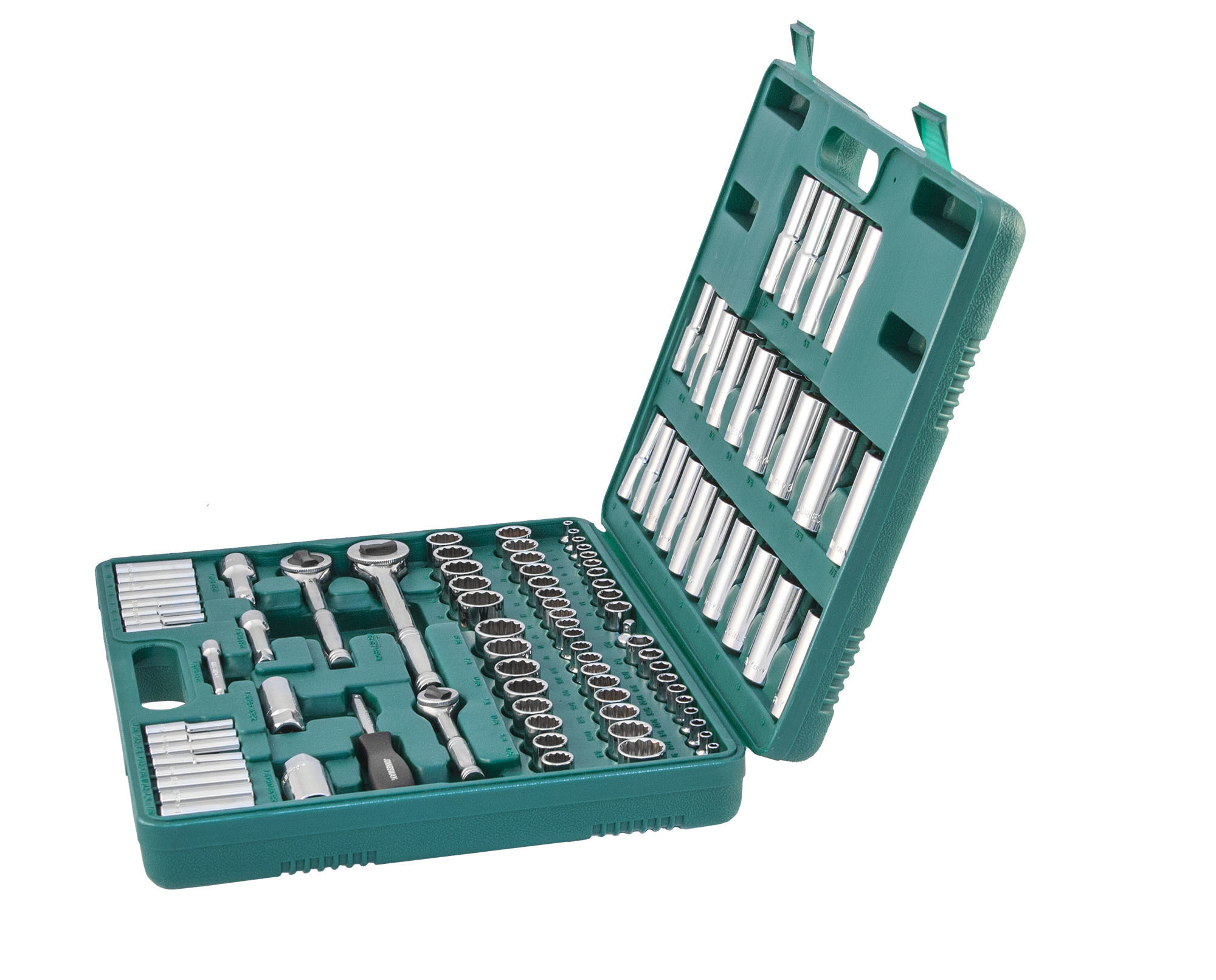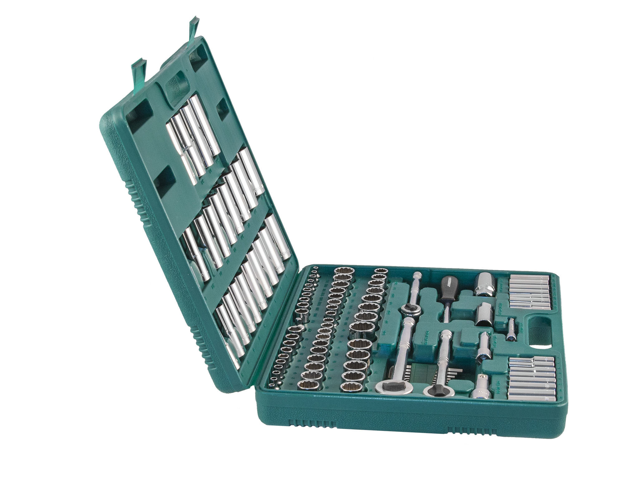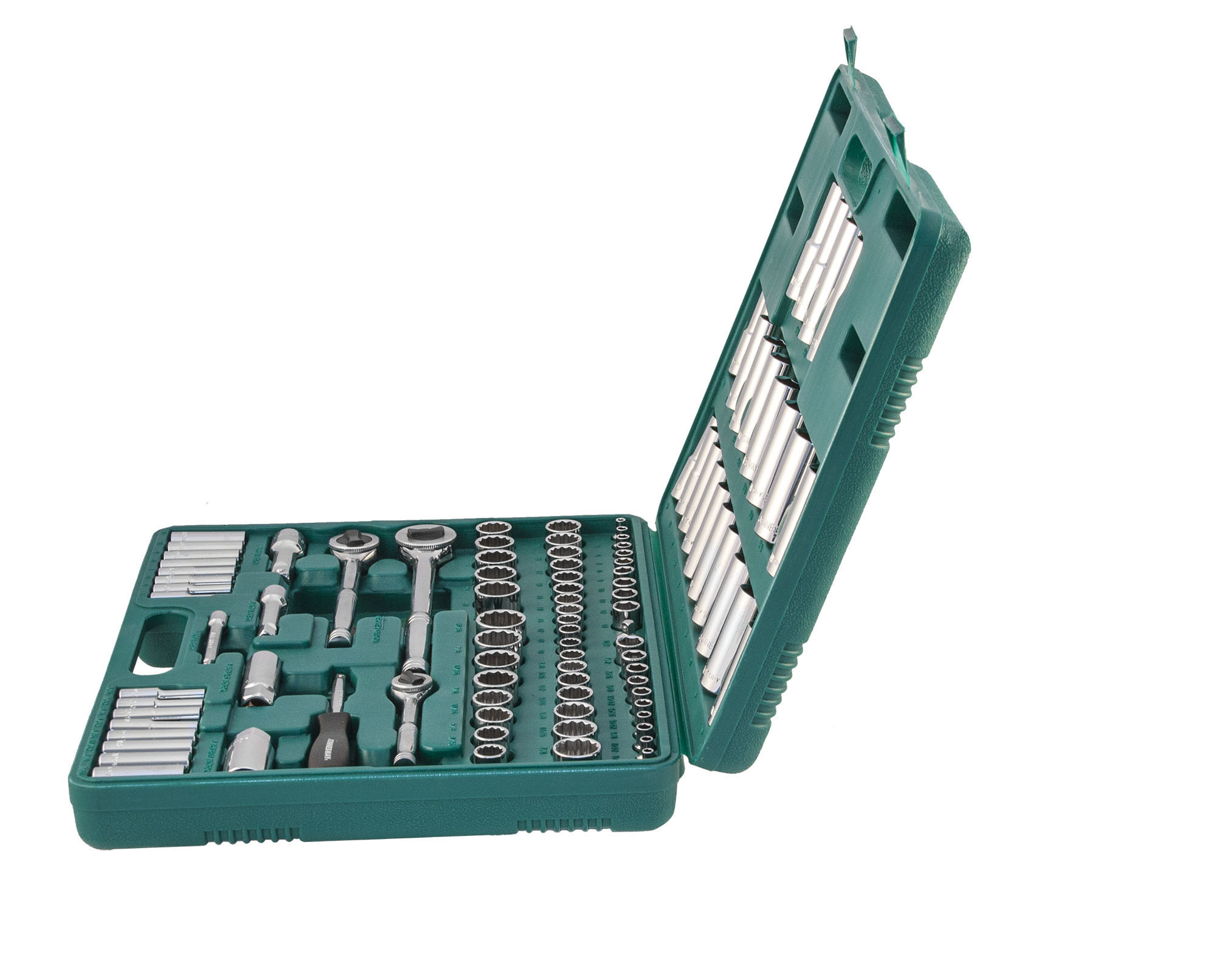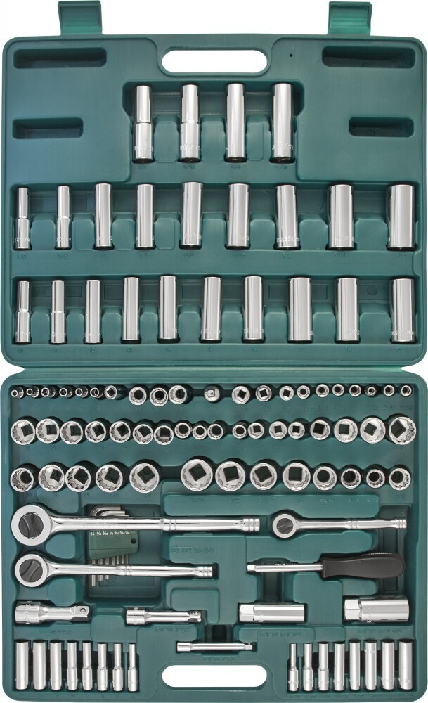 Содержание: 1/2’’ DR: 12-игранные головки торцевые, 8 шт.: 1/2’’, 9/16’’, 5/8’’, 11/16’’, 3/4’’, 13/16’’, 7/8’’, 15/16’’; 12-игранные головки торцевые, 5 шт.: 18, 19, 20, 21, 22 мм; Головки торцевые глубокие, 4 шт.: 1/2’’, 9/16’’, 5/8’’, 11/16’’; Удлинитель 125 мм; Трещоточная рукоятка; 1/4’’ DR: Головки торцевые, 10 шт.: 5/32’’, 3/16’’, 7/32’’, 1/4’’, 9/32’’, 5/16’’, 11/32’’, 3/8’’, 7/16’’, 1/2’’; Головки торцевые, 10 шт.: 4, 5, 6, 7, 8, 9, 10, 11, 12, 13 мм; Головки торцевые глубокие, 8 шт.: 3/16’’, 7/32’’, 1/4’’, 9/32’’, 5/16’’, 11/32’’, 3/8’’, 7/16’’; Головки торцевые глубокие, 8 шт.: 4, 5, 6, 7, 8, 9, 10, 11 мм; Удлинитель 75 мм; Отверточная рукоятка; Трещоточная рукоятка; 3/8’’ DR: 12-игранные головки торцевые, 8 шт.: 3/8’’, 7/16’’, 1/2’’, 9/16’’, 5/8’’, 11/16’’, 3/4’’, 13/16’’; 12-игранные головки торцевые, 10 шт.: 10, 11, 12, 13, 14, 15, 16, 17, 18, 19 мм; 12-игранные головки торцевые глубокие, 9 шт.: 3/8’’, 7/16’’, 1/2’’, 9/16’’, 5/8’’, 11/16’’, 3/4’’, 13/16’’, 7/8’’; Головки торцевые глубокие, 10 шт.: 10, 11, 12, 13, 14, 15, 16, 17, 18, 19 мм; Головки торцевые свечные 2 шт.: 16 и 21 мм; Удлинитель 75 мм; Адаптер 3/8’’DR(F)x1/4’’(M); Трещоточная рукоятка’; Отвертки угловые (торцевые шестигранные ключи), 7 шт; Пластиковый кейс.