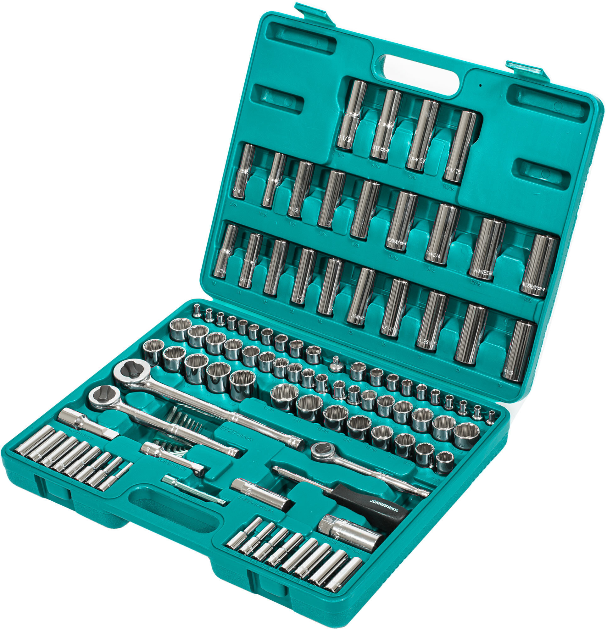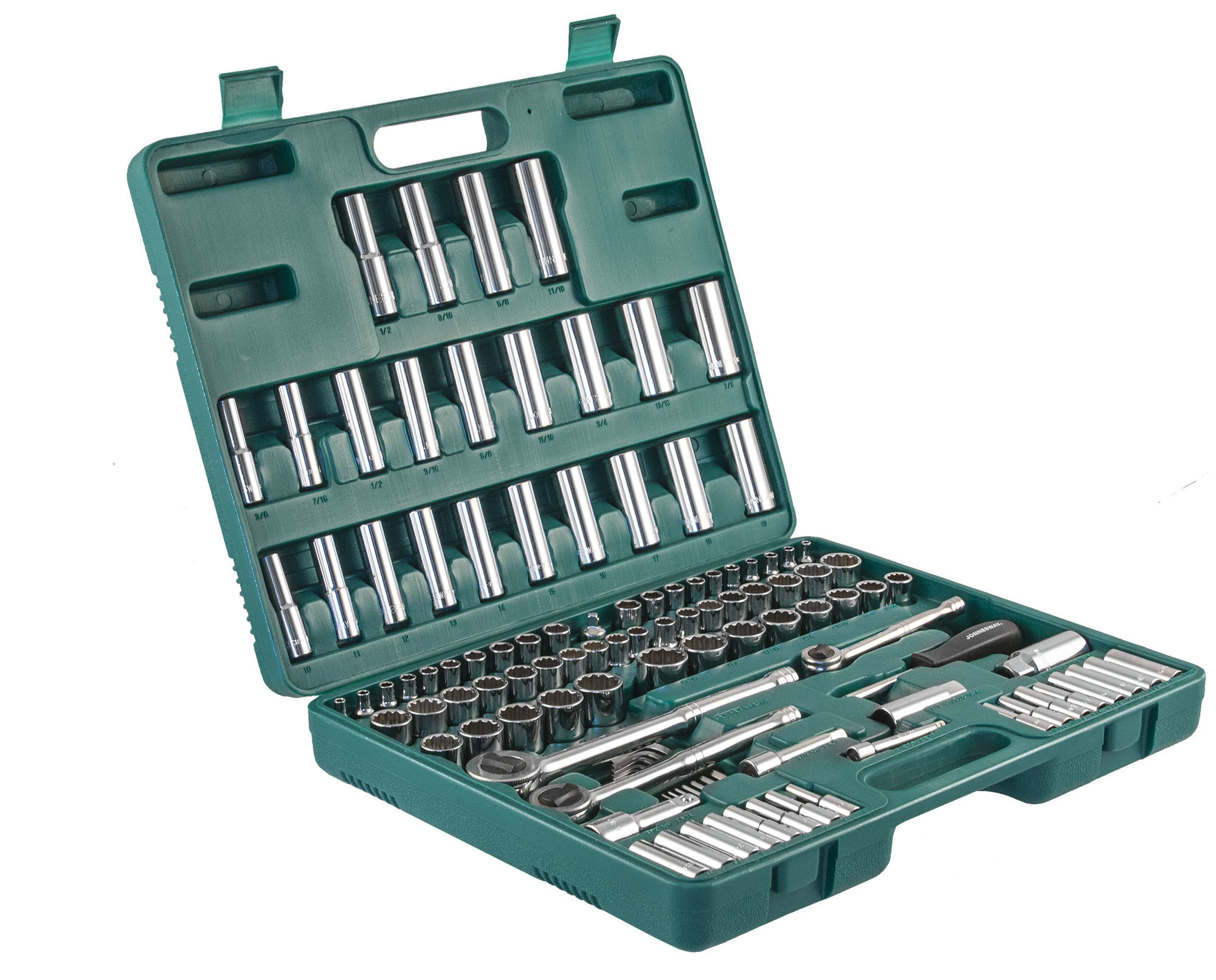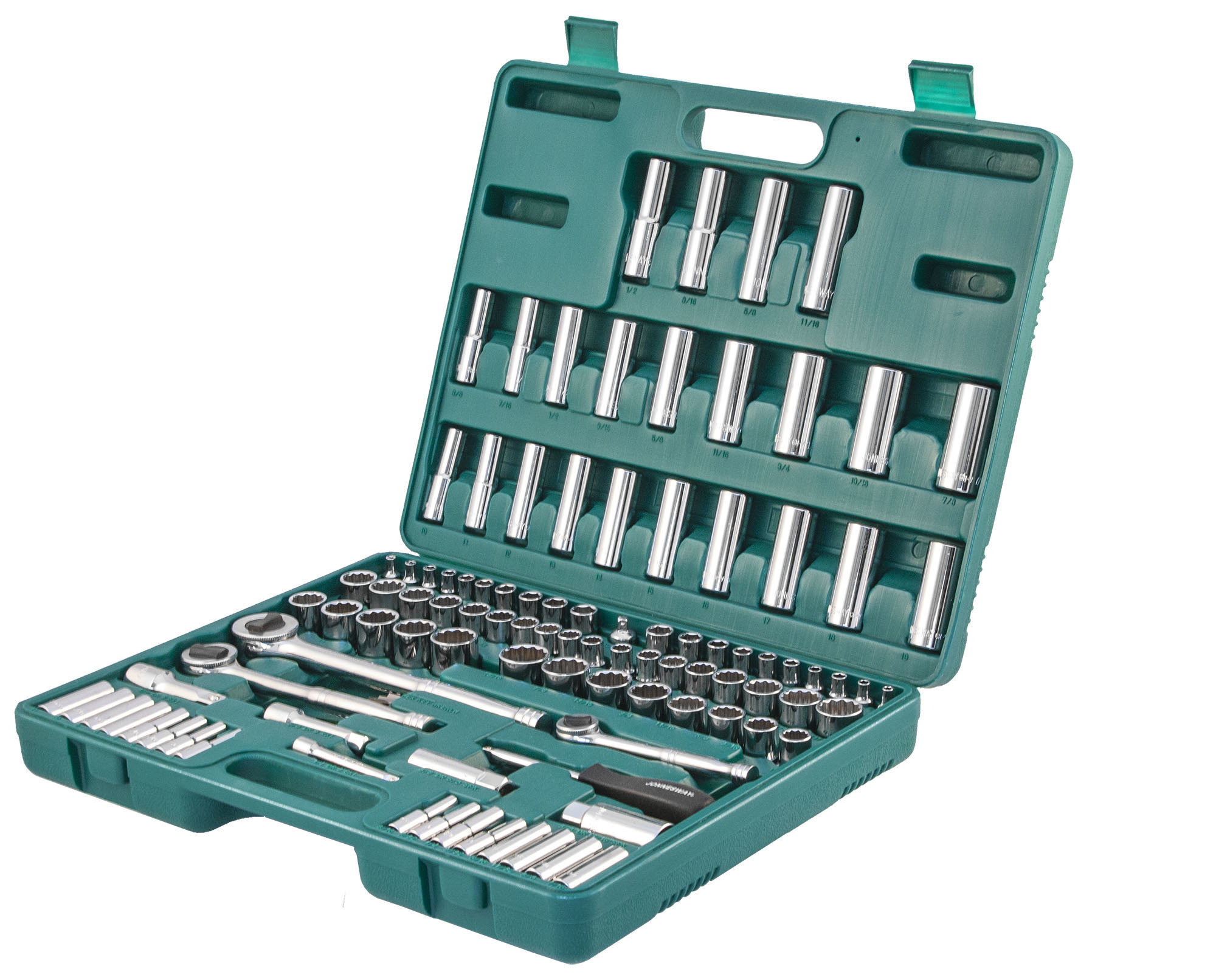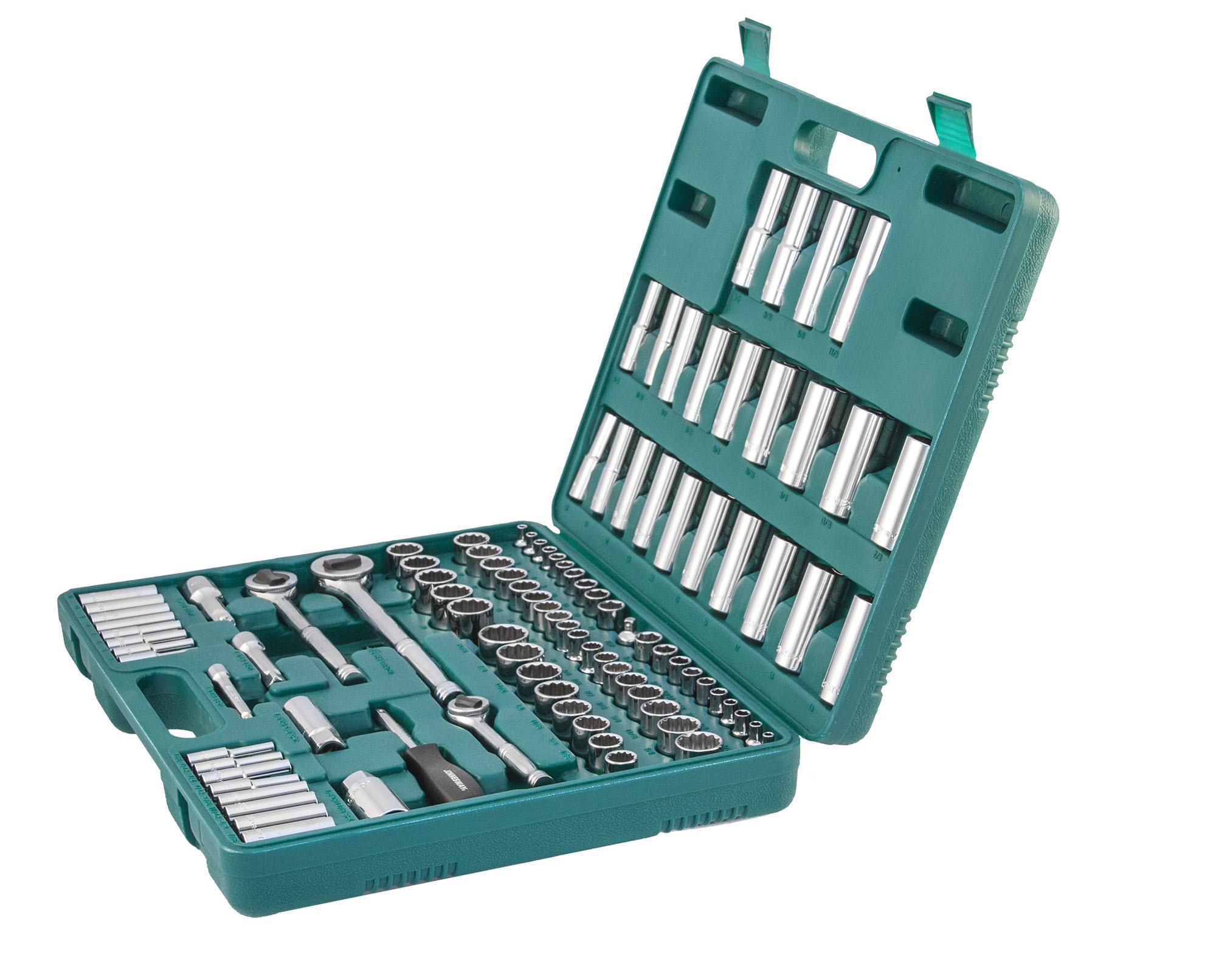 Содержание: 1/2’’ DR: 12-игранные головки торцевые, 8 шт.: 1/2’’, 9/16’’, 5/8’’, 11/16’’, 3/4’’, 13/16’’, 7/8’’, 15/16’’; 12-игранные головки торцевые, 5 шт.: 18, 19, 20, 21, 22 мм; Головки торцевые глубокие, 4 шт.: 1/2’’, 9/16’’, 5/8’’, 11/16’’; Удлинитель 125 мм; Трещоточная рукоятка; 1/4’’ DR: Головки торцевые, 10 шт.: 5/32’’, 3/16’’, 7/32’’, 1/4’’, 9/32’’, 5/16’’, 11/32’’, 3/8’’, 7/16’’, 1/2’’; Головки торцевые, 10 шт.: 4, 5, 6, 7, 8, 9, 10, 11, 12, 13 мм; Головки торцевые глубокие, 8 шт.: 3/16’’, 7/32’’, 1/4’’, 9/32’’, 5/16’’, 11/32’’, 3/8’’, 7/16’’; Головки торцевые глубокие, 8 шт.: 4, 5, 6, 7, 8, 9, 10, 11 мм; Удлинитель 75 мм; Отверточная рукоятка; Трещоточная рукоятка; 3/8’’ DR: 12-игранные головки торцевые, 8 шт.: 3/8’’, 7/16’’, 1/2’’, 9/16’’, 5/8’’, 11/16’’, 3/4’’, 13/16’’; 12-игранные головки торцевые, 10 шт.: 10, 11, 12, 13, 14, 15, 16, 17, 18, 19 мм; 12-игранные головки торцевые глубокие, 9 шт.: 3/8’’, 7/16’’, 1/2’’, 9/16’’, 5/8’’, 11/16’’, 3/4’’, 13/16’’, 7/8’’; Головки торцевые глубокие, 10 шт.: 10, 11, 12, 13, 14, 15, 16, 17, 18, 19 мм; Головки торцевые свечные 2 шт.: 16 и 21 мм; Удлинитель 75 мм; Адаптер 3/8’’DR(F)x1/4’’(M); Трещоточная рукоятка’; Отвертки угловые (торцевые шестигранные ключи), 7 шт; Пластиковый кейс.