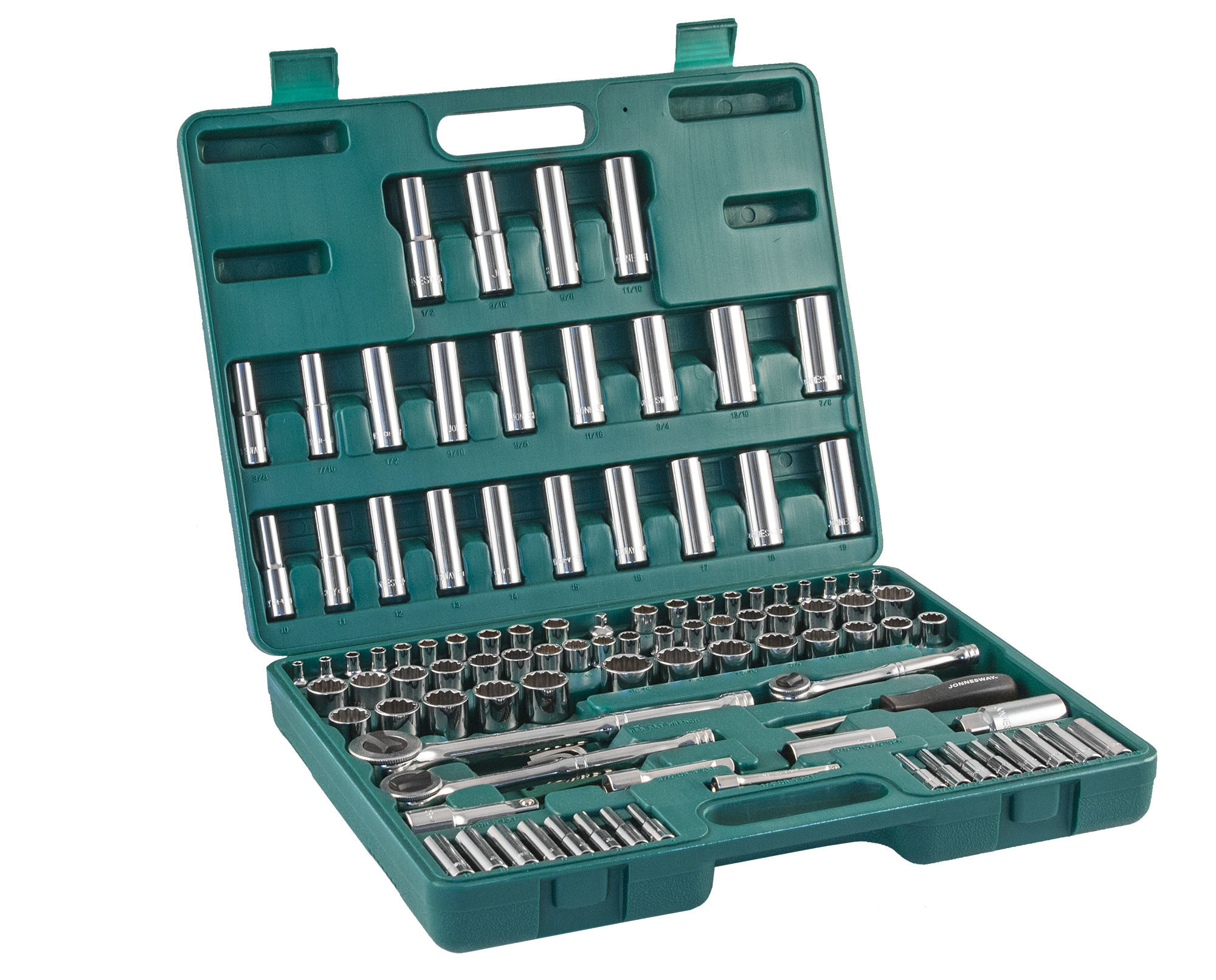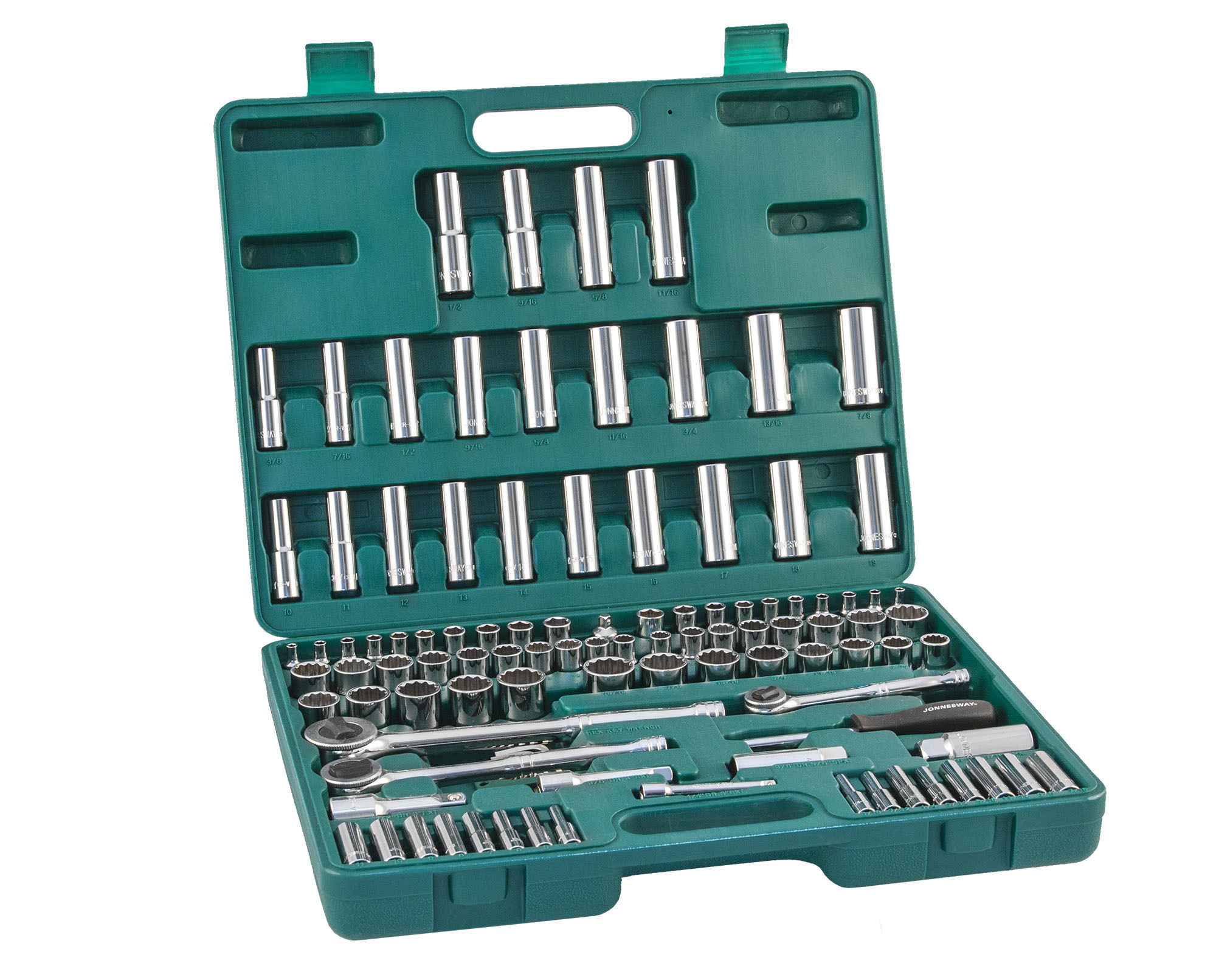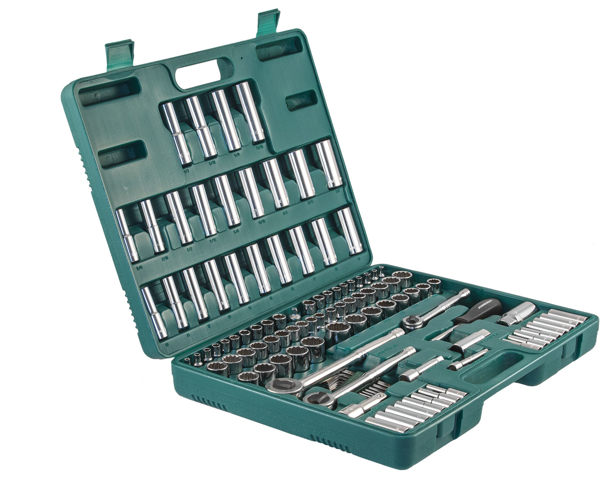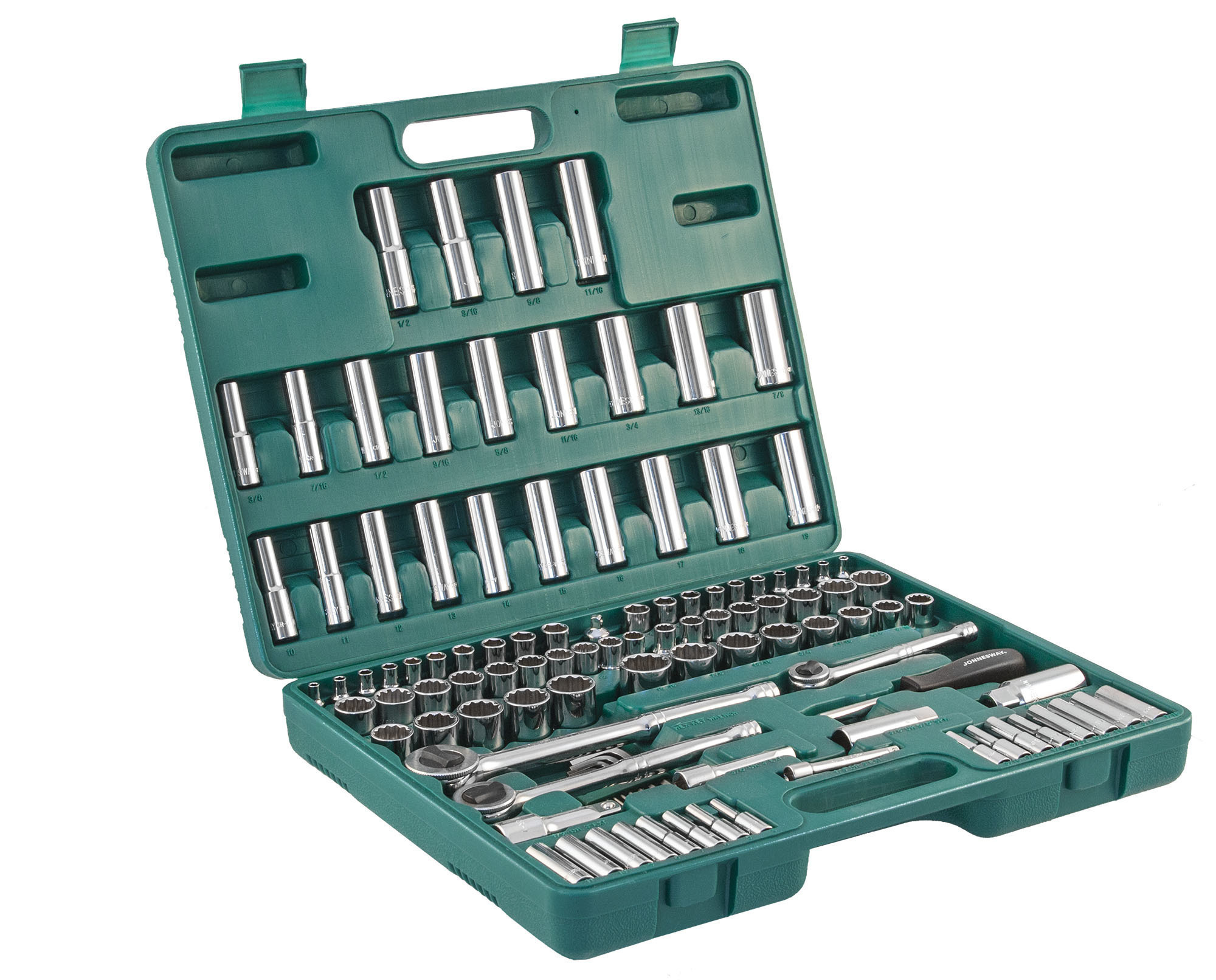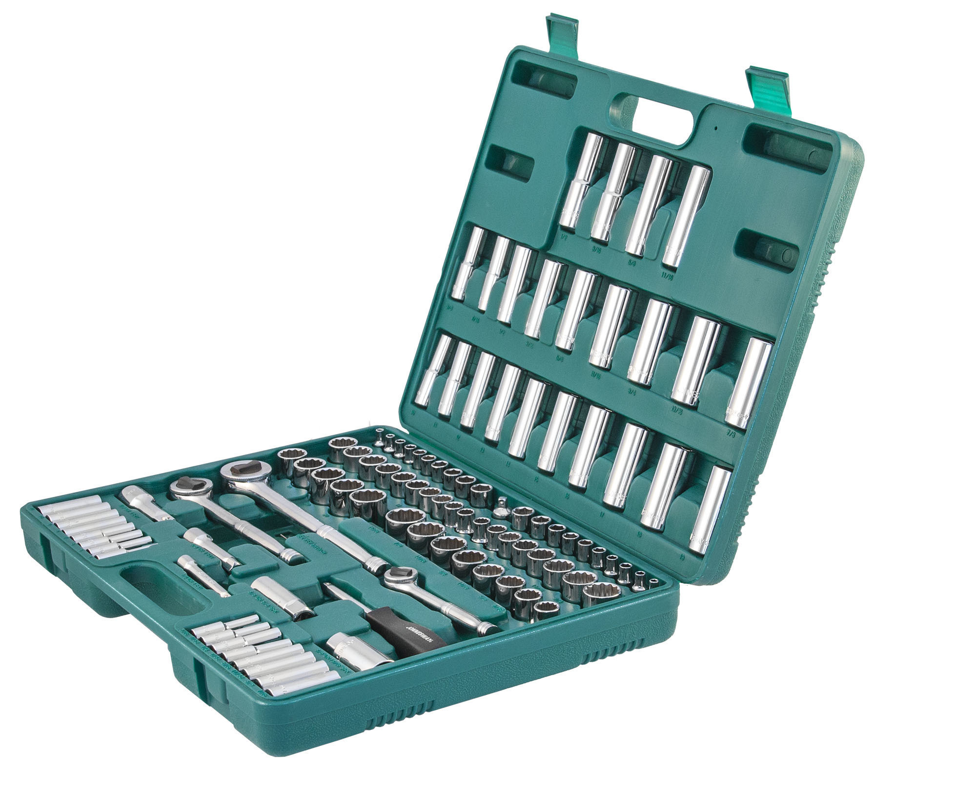 Содержание: 1/2’’ DR: 12-игранные головки торцевые, 8 шт.: 1/2’’, 9/16’’, 5/8’’, 11/16’’, 3/4’’, 13/16’’, 7/8’’, 15/16’’; 12-игранные головки торцевые, 5 шт.: 18, 19, 20, 21, 22 мм; Головки торцевые глубокие, 4 шт.: 1/2’’, 9/16’’, 5/8’’, 11/16’’; Удлинитель 125 мм; Трещоточная рукоятка; 1/4’’ DR: Головки торцевые, 10 шт.: 5/32’’, 3/16’’, 7/32’’, 1/4’’, 9/32’’, 5/16’’, 11/32’’, 3/8’’, 7/16’’, 1/2’’; Головки торцевые, 10 шт.: 4, 5, 6, 7, 8, 9, 10, 11, 12, 13 мм; Головки торцевые глубокие, 8 шт.: 3/16’’, 7/32’’, 1/4’’, 9/32’’, 5/16’’, 11/32’’, 3/8’’, 7/16’’; Головки торцевые глубокие, 8 шт.: 4, 5, 6, 7, 8, 9, 10, 11 мм; Удлинитель 75 мм; Отверточная рукоятка; Трещоточная рукоятка; 3/8’’ DR: 12-игранные головки торцевые, 8 шт.: 3/8’’, 7/16’’, 1/2’’, 9/16’’, 5/8’’, 11/16’’, 3/4’’, 13/16’’; 12-игранные головки торцевые, 10 шт.: 10, 11, 12, 13, 14, 15, 16, 17, 18, 19 мм; 12-игранные головки торцевые глубокие, 9 шт.: 3/8’’, 7/16’’, 1/2’’, 9/16’’, 5/8’’, 11/16’’, 3/4’’, 13/16’’, 7/8’’; Головки торцевые глубокие, 10 шт.: 10, 11, 12, 13, 14, 15, 16, 17, 18, 19 мм; Головки торцевые свечные 2 шт.: 16 и 21 мм; Удлинитель 75 мм; Адаптер 3/8’’DR(F)x1/4’’(M); Трещоточная рукоятка’; Отвертки угловые (торцевые шестигранные ключи), 7 шт; Пластиковый кейс.