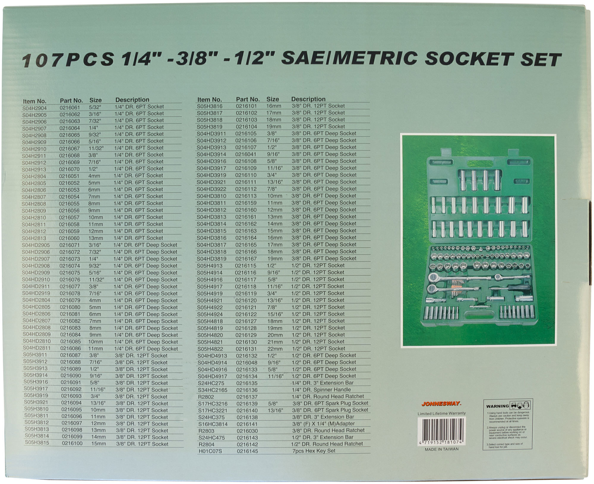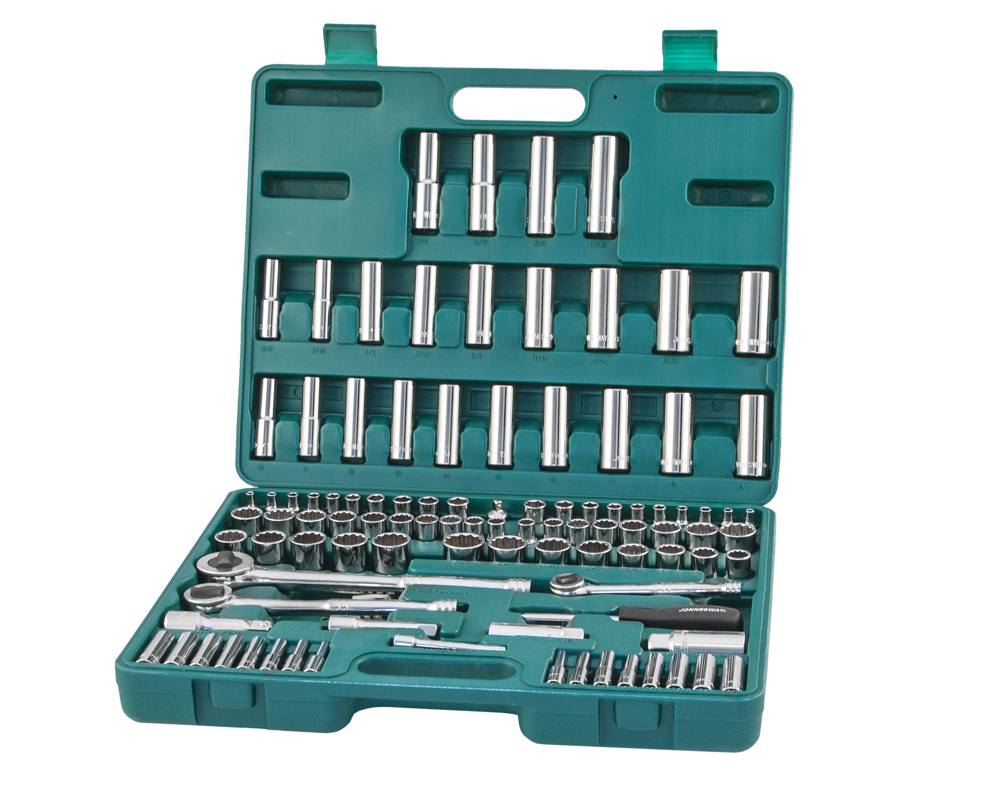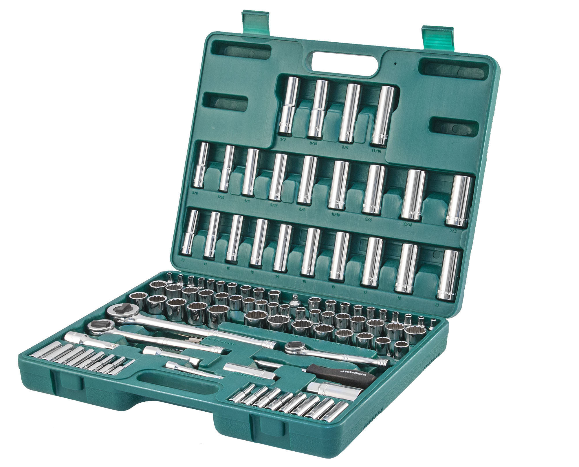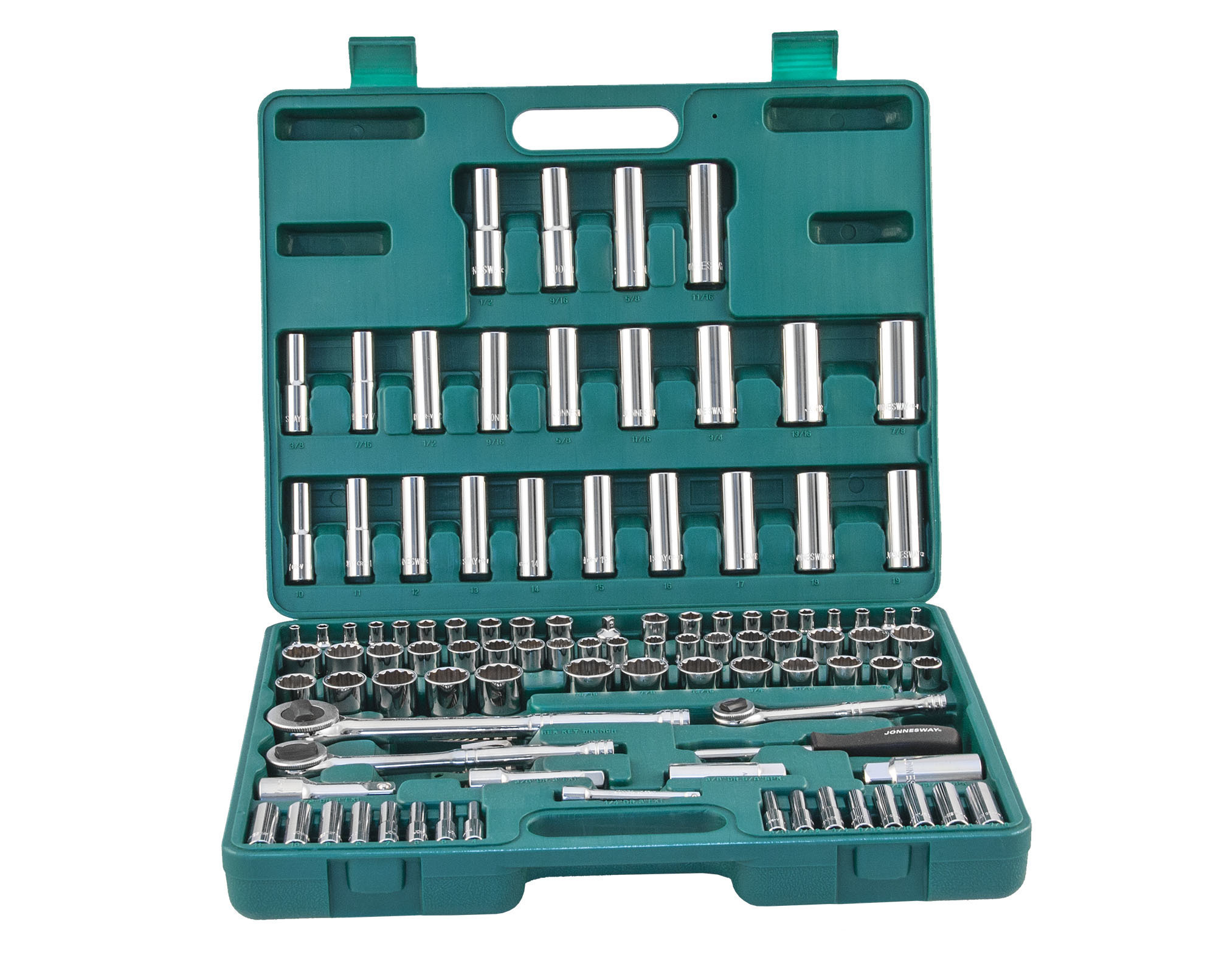 Содержание: 1/2’’ DR: 12-игранные головки торцевые, 8 шт.: 1/2’’, 9/16’’, 5/8’’, 11/16’’, 3/4’’, 13/16’’, 7/8’’, 15/16’’; 12-игранные головки торцевые, 5 шт.: 18, 19, 20, 21, 22 мм; Головки торцевые глубокие, 4 шт.: 1/2’’, 9/16’’, 5/8’’, 11/16’’; Удлинитель 125 мм; Трещоточная рукоятка; 1/4’’ DR: Головки торцевые, 10 шт.: 5/32’’, 3/16’’, 7/32’’, 1/4’’, 9/32’’, 5/16’’, 11/32’’, 3/8’’, 7/16’’, 1/2’’; Головки торцевые, 10 шт.: 4, 5, 6, 7, 8, 9, 10, 11, 12, 13 мм; Головки торцевые глубокие, 8 шт.: 3/16’’, 7/32’’, 1/4’’, 9/32’’, 5/16’’, 11/32’’, 3/8’’, 7/16’’; Головки торцевые глубокие, 8 шт.: 4, 5, 6, 7, 8, 9, 10, 11 мм; Удлинитель 75 мм; Отверточная рукоятка; Трещоточная рукоятка; 3/8’’ DR: 12-игранные головки торцевые, 8 шт.: 3/8’’, 7/16’’, 1/2’’, 9/16’’, 5/8’’, 11/16’’, 3/4’’, 13/16’’; 12-игранные головки торцевые, 10 шт.: 10, 11, 12, 13, 14, 15, 16, 17, 18, 19 мм; 12-игранные головки торцевые глубокие, 9 шт.: 3/8’’, 7/16’’, 1/2’’, 9/16’’, 5/8’’, 11/16’’, 3/4’’, 13/16’’, 7/8’’; Головки торцевые глубокие, 10 шт.: 10, 11, 12, 13, 14, 15, 16, 17, 18, 19 мм; Головки торцевые свечные 2 шт.: 16 и 21 мм; Удлинитель 75 мм; Адаптер 3/8’’DR(F)x1/4’’(M); Трещоточная рукоятка’; Отвертки угловые (торцевые шестигранные ключи), 7 шт; Пластиковый кейс.