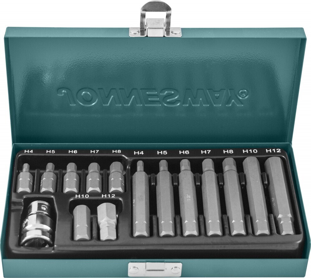 Содержание: Вставки-биты с хвостовиком 10 мм.: - Вставки-биты HEX, L=30 мм.. 7 шт.: H4, H5, H6, H7, H8, H10, H12 мм.; - Вставки-биты HEX, L=75 мм., 7 шт.: H4, H5, H6, H7, H8, H10, H12 мм.; - Адаптер для вставок-бит 1/2”DRх10 мм.; - Металлический бокс.