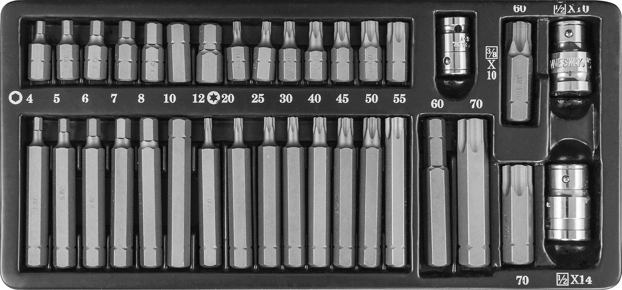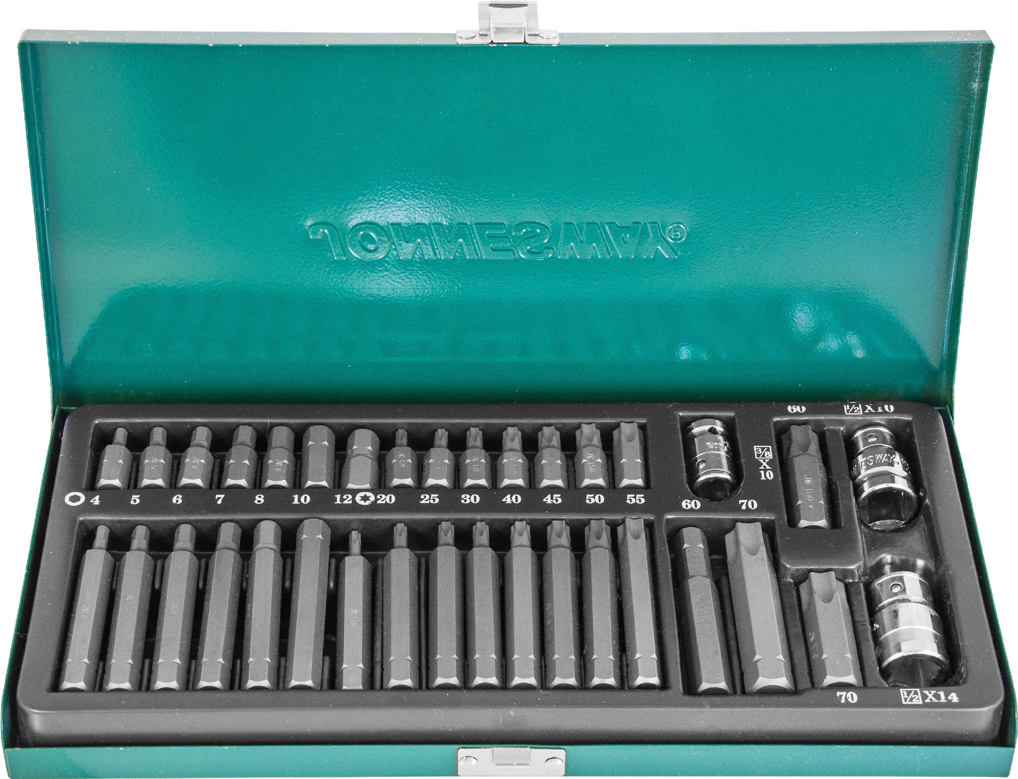 Содержание: Вставки-биты с хвостовиком 10 мм.: - Вставки-биты HEX, L=30 мм.. 7 шт.: H4, H5, H6, H7, H8, H10, H12 мм.; - Вставки-биты HEX, L=75 мм., 7 шт.: H4, H5, H6, H7, H8, H10, H12 мм.; - Вставки биты TORX®, L=30 мм, 7 шт.: Т20, Т25, Т30, Т40, Т45, Т50, Т55; - Вставки биты TORX®, L=75 мм, 7 шт.: Т20, Т25, Т30, Т40, Т45, Т50, Т55;; Вставки-биты с хвостовиком 14 мм.: - Вставки биты TORX®, L=30 мм., 2 шт.: Т60, Т70; - Вставки биты TORX®, L=75 мм., 2 шт.: Т60, Т70; - Адаптер для вставок-бит 3/8”DRх10 мм.; - Адаптер для вставок-бит 1/2”DRх10 мм.; - Адаптер для вставок-бит 1/2”DRх14 мм.; - Металлический бокс.