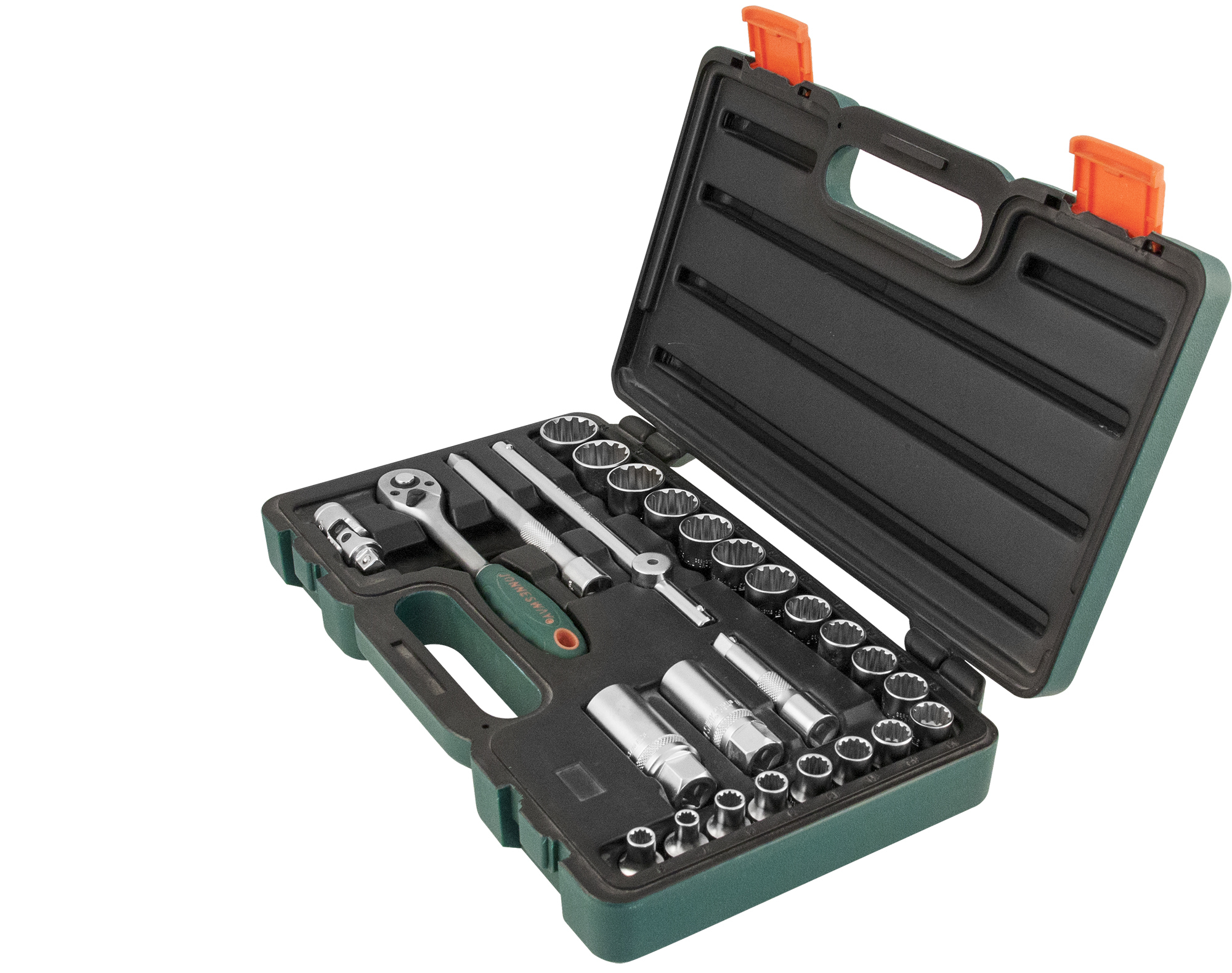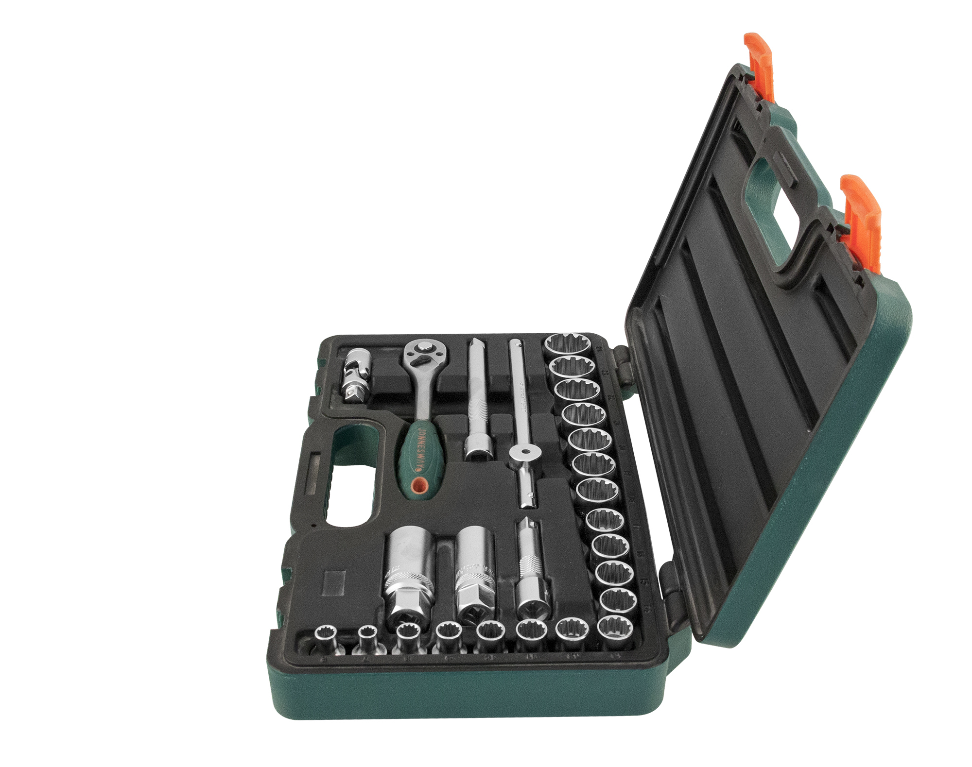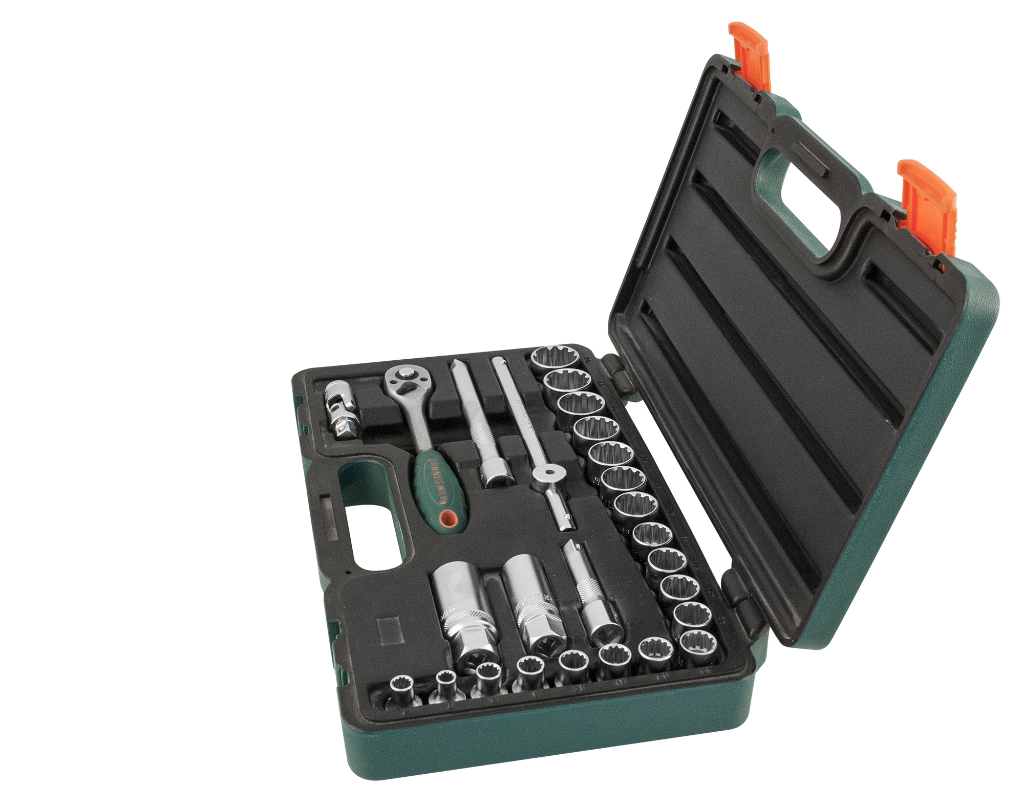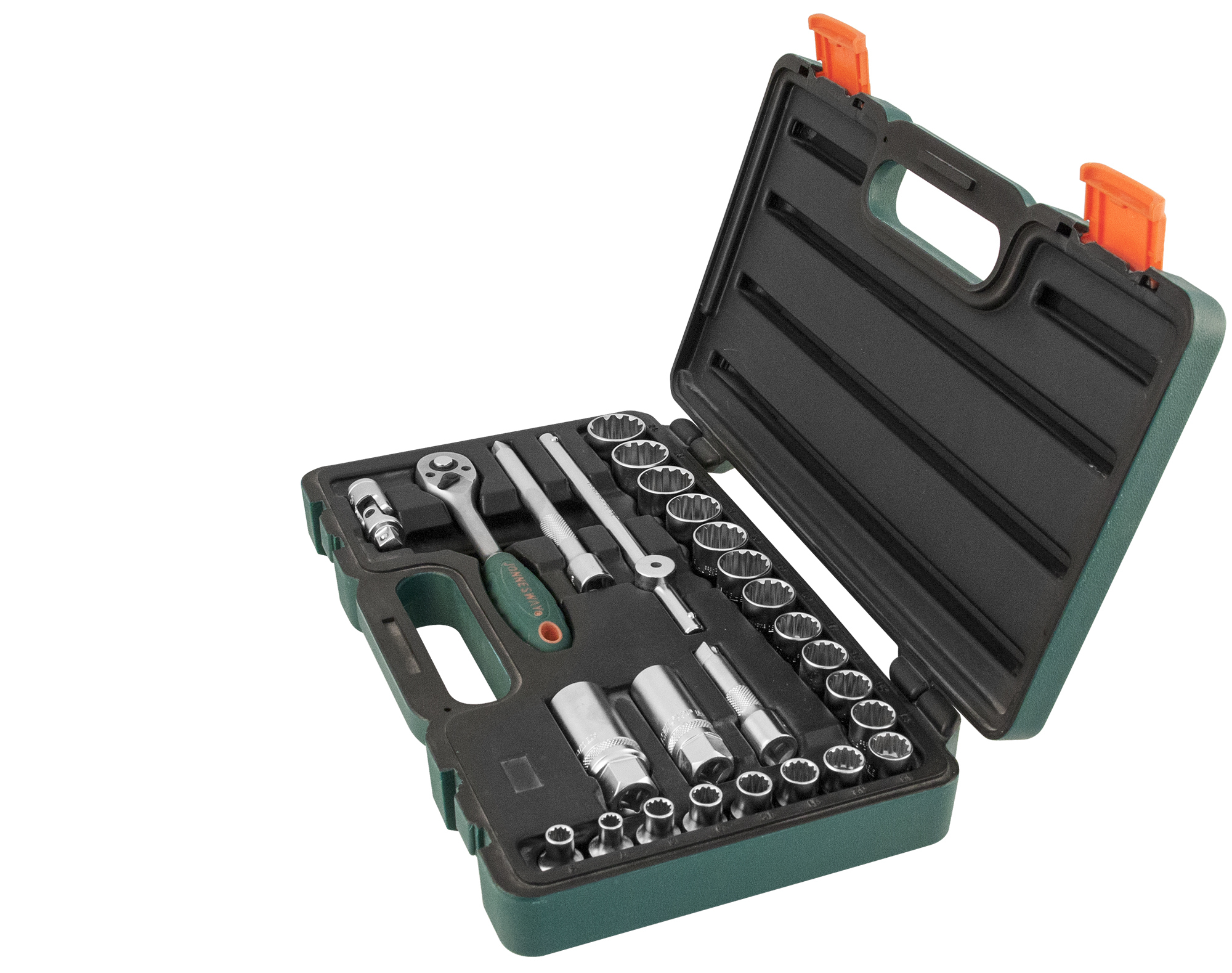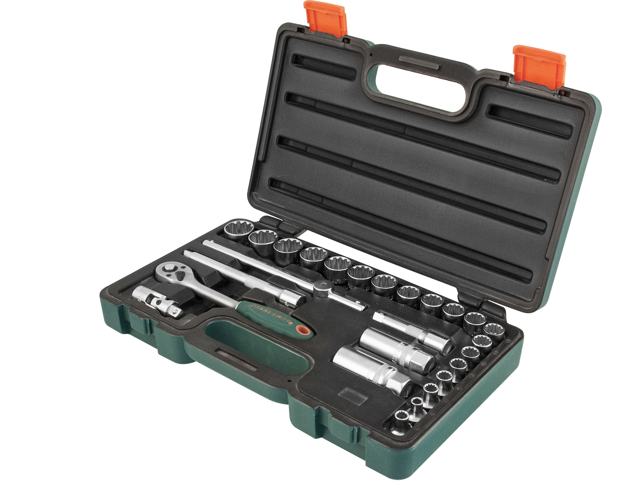 Содержание: 3/8"DR: Головки торцевые, 19 шт.: 6, 7, 8, 9, 10, 11, 12, 13, 14, 15, 16, 17, 18, 19, 20, 21, 22, 23, 24 мм.; Головки торцевые свечные, 2 шт.: 16, 21 мм.; Рукоятка трещоточная, 185 мм. ; Вороток Т-образный, 200 мм.; Удлинители, 2 шт.: 75, 150 мм.; Шарнир карданный; Пластиковый кейс.