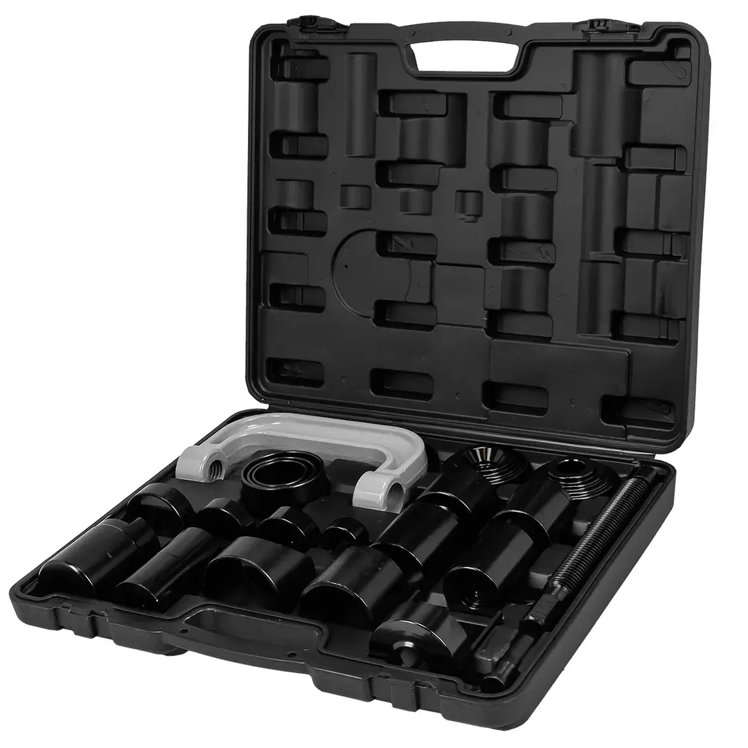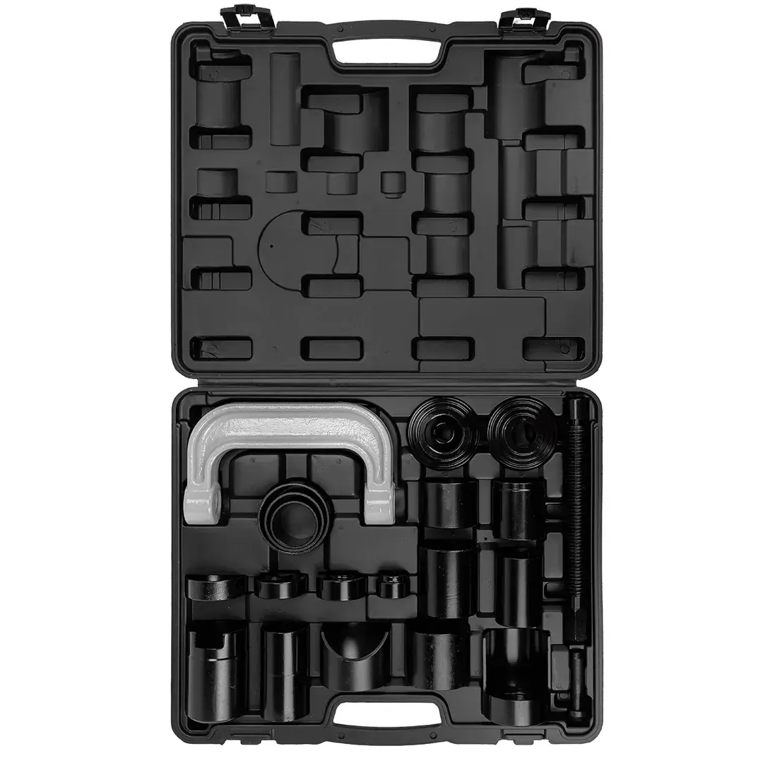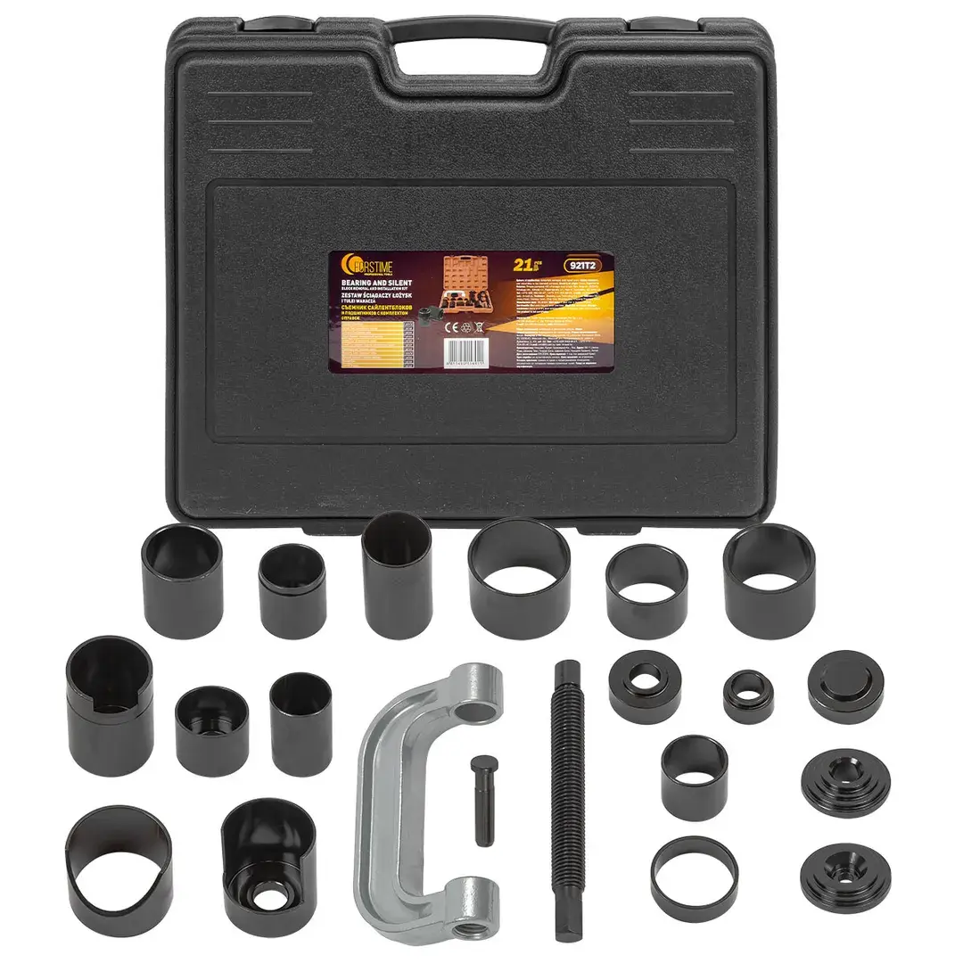 Съемник сайлентблоков и подшипников с набором оправок. Съемник для выдавливания штифтов и втулок подвески без необходимости демонтажа подузла. Устраняет необходимость снимать заднюю или переднюю поперечную балку. В наборе 21 предмет. Для удобного хранения и транспортировки поставляется в прочном пластиковом кейсе ехнические данные: 1 х Винтовой пресс - диаметр винта 28 мм для ключа 22 длина 255 мм; диск для втачивания гильз : 77мм на 25мм; диск для втачивания гильз :78мм на 12,5 мм; Оправки с размерами: Внутренний диаметр 23,0 мм / внешний диаметр 37,0 мм / высота 23,0 мм; Внутренний диаметр 45,0 мм / внешний диаметр 51,0 мм / высота 45,0 мм; Внутренний диаметр 45,0 мм / внешний диаметр 51 мм / высота 94 мм; Внутренний диаметр 46,0 мм / внешний диаметр 50 мм / высота 73,5 мм; Внутренний диаметр 46,0 мм / внешний диаметр 54,0 мм / высота 25,5 мм; Внутренний диаметр 48,5 мм / внешний диаметр 56,5 мм / высота 21,0 мм; Внутренний диаметр 51,0 мм / внешний диаметр 57,0 мм / высота 62 мм; Внутренний диаметр 55,0 м