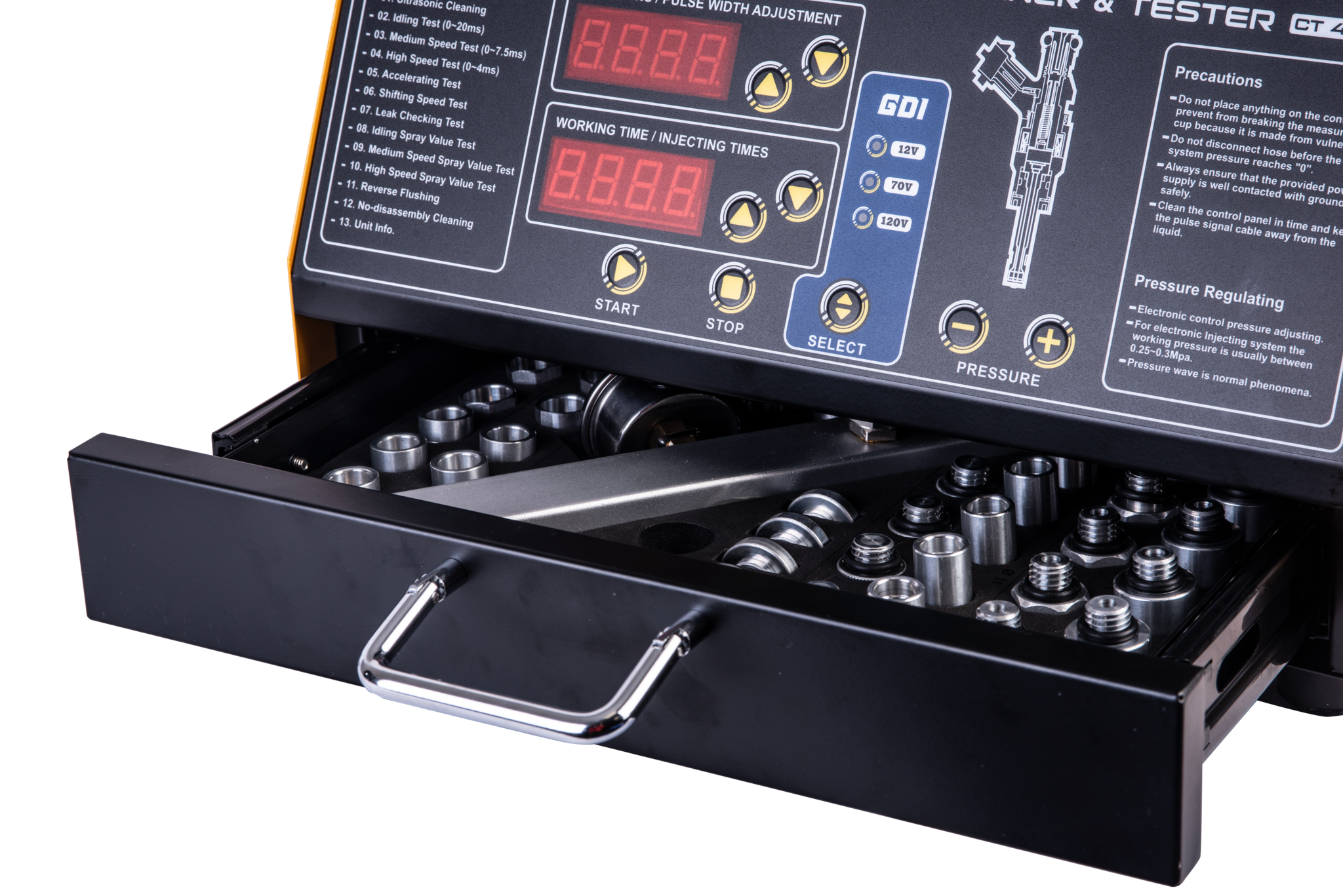 - Устройство может тестировать не только стандартные бензиновые форсунки, но и форсунки прямого впрыска GDI, которые используются в таких автомобилях, как Mercedes-Benz, BMW, Audi, Porsche, Ford или других автомобилях с непосредственным впрыском.