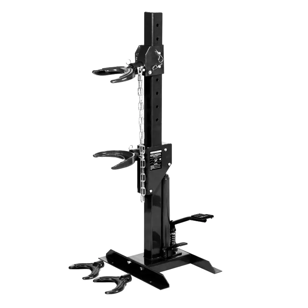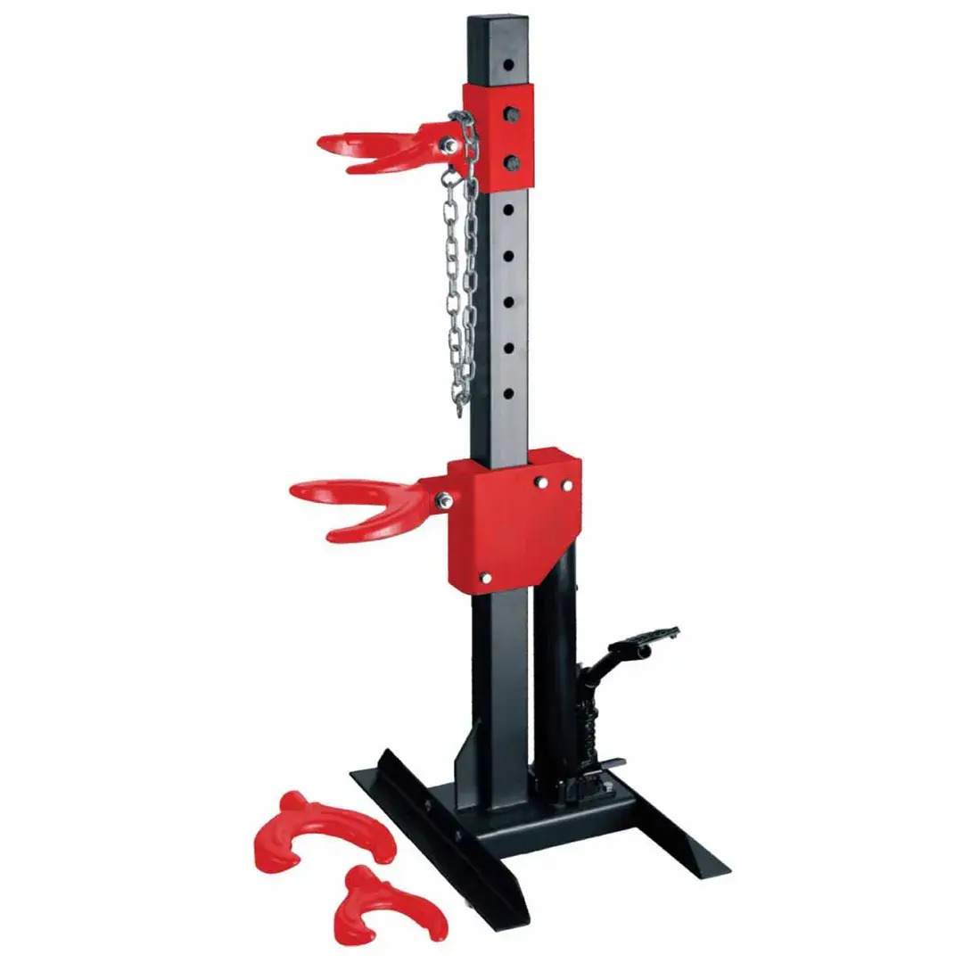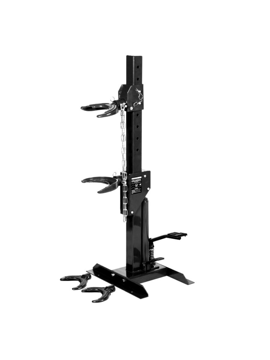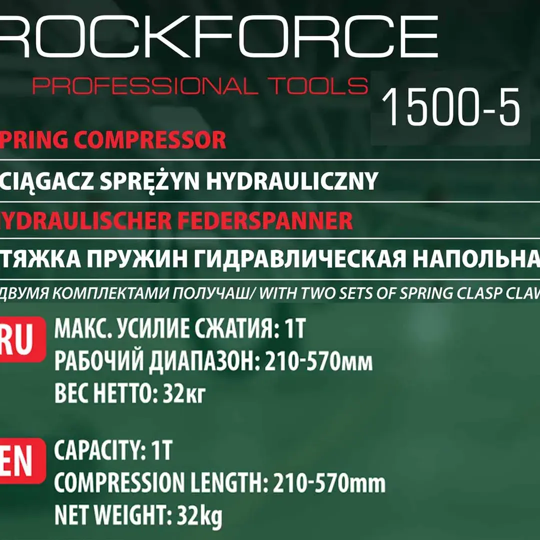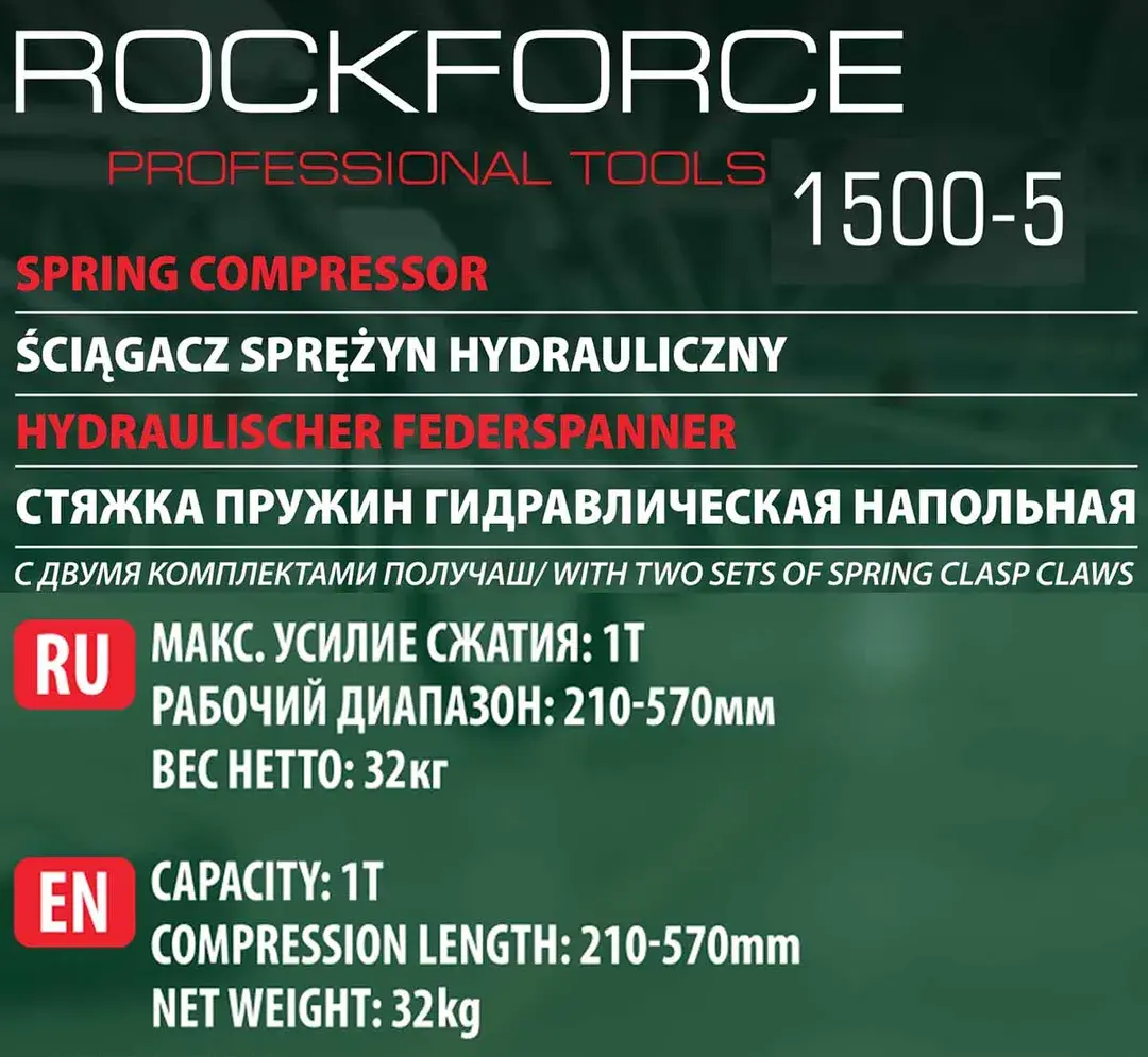 Съемник(стяжка) используется для замены пружин/амортизаторов типа McPherson вне автомобиля. Съемник изготовлен из массивных профилей. Пружина сжимается гидравлическим поршнем (ножной привод). Конструкция регулируемых держателей универсальна для крепления большинства типов пружин (и амортизаторов). Можно использовать как на собранном автомобиле (без разборки шасси), так и с разложенным шасси. Устройство прочное, простое по конструкции и портативное. Технические параметры : Высота : 1120 мм; Ширина : 570 мм; Максимальное усилие: 1 тонна; Ход поршня: 110 мм; 1-я пластина вмещает пружины диаметром 80-125 мм; 2-я пластина удерживает пружины диаметром 100-165 мм; Диаметр пружины: 400 мм; Рабочий диапазон: 210-570 мм; Стальная цепь: 1,2 м.