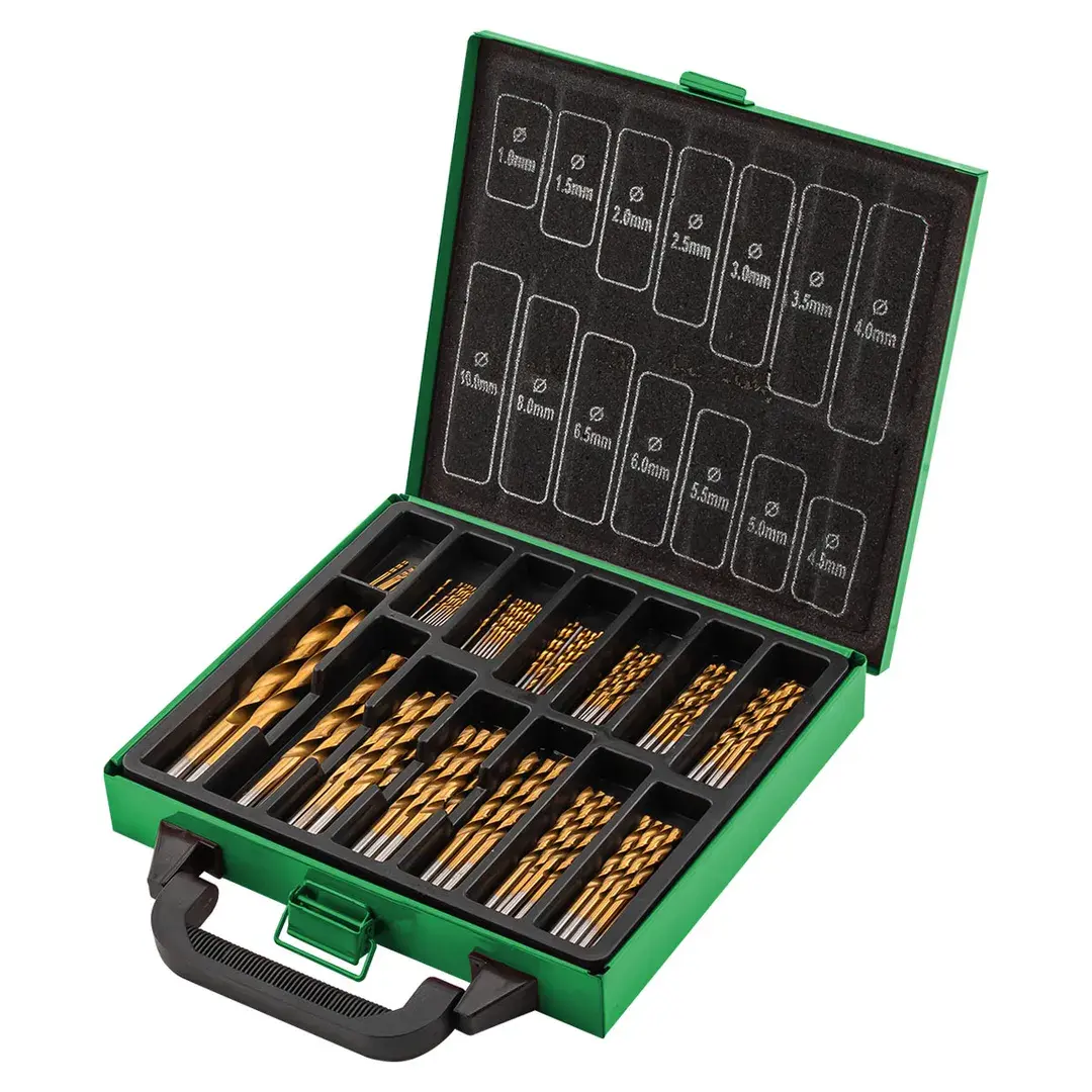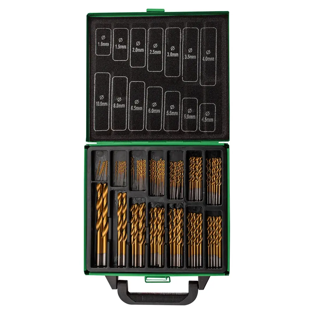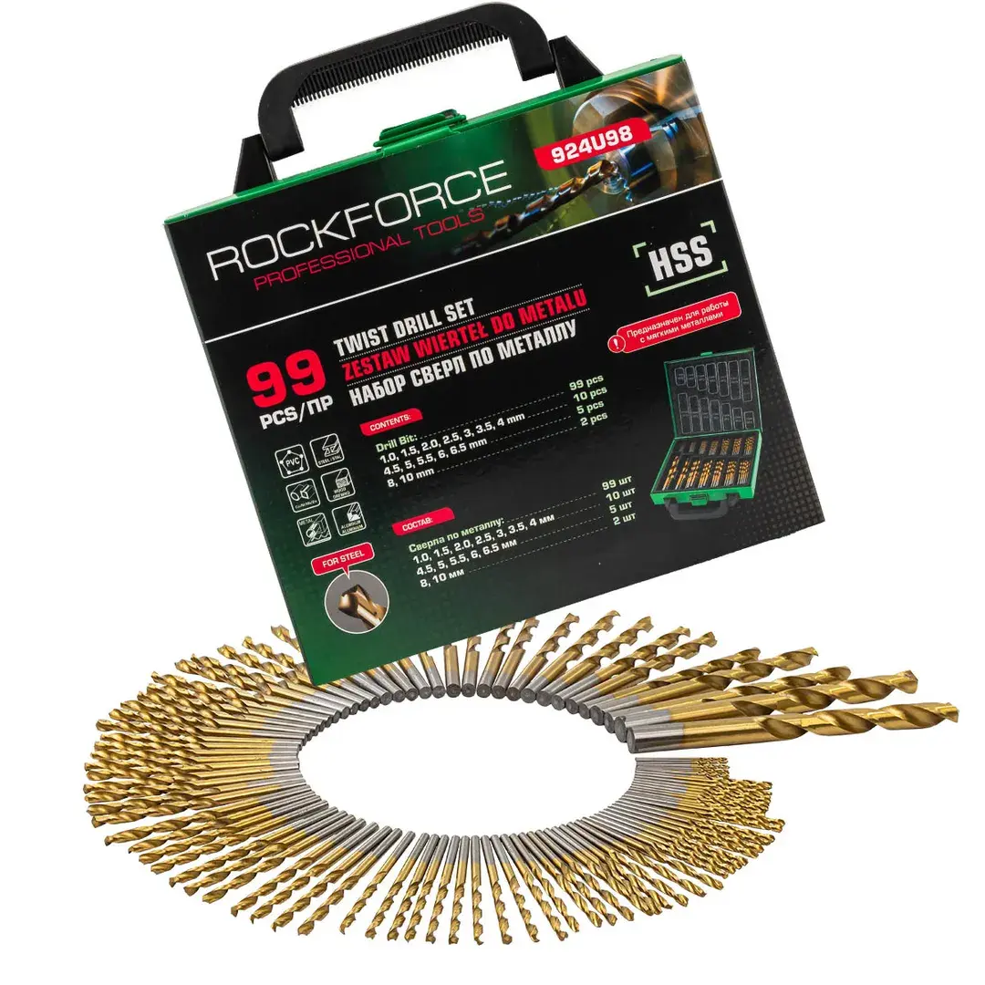 Набор сверл по металлу HSS представляет собой комплект из 99 предметов в пластиковом органайзере с металлическим кейсом, предназначенный для сверления отверстий в изделиях из мягкого металла. Сверла изготовлены из высококачественной быстрорежущей стали с кобальтовым покрытием, что обеспечивает высокую стойкость инструмента, повышенную скорость сверления, точное центрирование и длительный срок службы. Конструкция с прокатной У-образной спиралью обеспечивает эффективное удаление стружки и улучшенную стабильность процесса сверления. Цилиндрический хвостовик совместим с различными типами электроинструментов: дрелями, перфораторами, шуруповертами и сверлильными станками. Комплектация включает сверла диаметром от 1 до 10 мм в следующем количестве: 10 шт по 1 мм, 10 шт по 1,5 мм, 10 шт по 2 мм, 10 шт по 2,5 мм, 10 шт по 3 мм, 10 шт по 3,5 мм, 10 шт по 4 мм, 5 шт по 4,5 мм, 5 шт по 5 мм, 5 шт по 5,5 мм, 5 шт по 6 мм, 5 шт по 6,5 мм, 2 шт по 8 мм и 2 шт по 10 мм. Весь набор организован в удобном кейсе для хранения и т