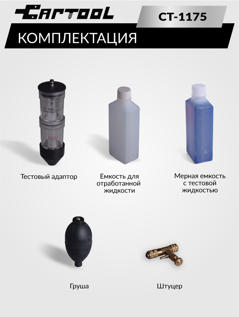 CT-1175 - тестер для обнаружения выхлопных газов в системе охлаждения двигателей внутреннего сгорания. Тестер может применяться как для автомобилей с бензиновыми так и дизельными двигателями. CT-1175 определяет попадают ли продукты сгорания топлива в рубашку охлаждения ДВС. Обычно утечка продуктов сгорания происходит через перекосы головки цилиндра, поврежденные прокладки или трещины в блоке цилиндров. По уровню содержания выхлопных газов можно предположить наличие микротрещин в камере сгорания ДВС или плотности прокладки между блоком двигателя и головкой блока цилиндров и т.п., обычно свидетельствующих о перегреве двигателя и необходимости профилактического техобслуживания.