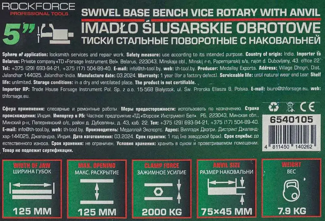 Тиски стальные поворотные с наковальней 5''(125мм) RockFORCE RF-6540105