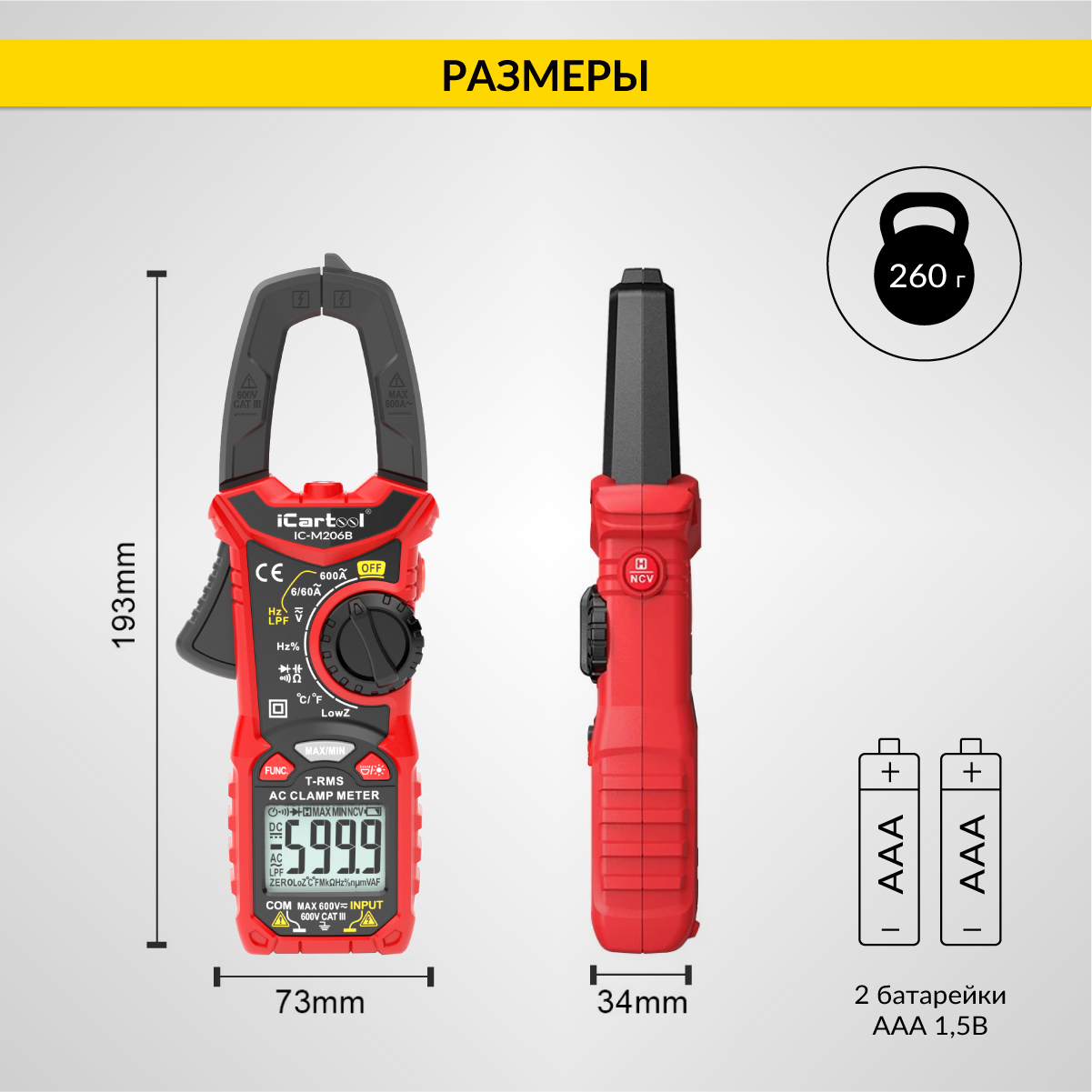 Токовые клещи переменного тока 600A iCartool IC-M206B