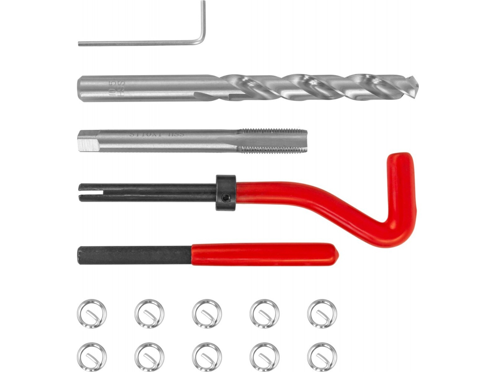 СОДЕРЖАНИЕ: ● СВЕРЛО СПИРАЛЬНОЕ ПО МЕТАЛЛУ ПО DIN 338; ● МЕТЧИК STI ПО DIN 8140-2; ● ВОРОТОК УСТАНОВОЧНЫЙ (с предохранительным кольцом для ограничения глубины); ● ДЕМОНТАЖНАЯ ОПРАВКА (для удаления поводка); ● КЛЮЧ ТОРЦЕВОЙ ШЕСТИГРАННЫЙ; ● РЕЗЬБОВЫЕ ВСТАВКИ (10 шт.).