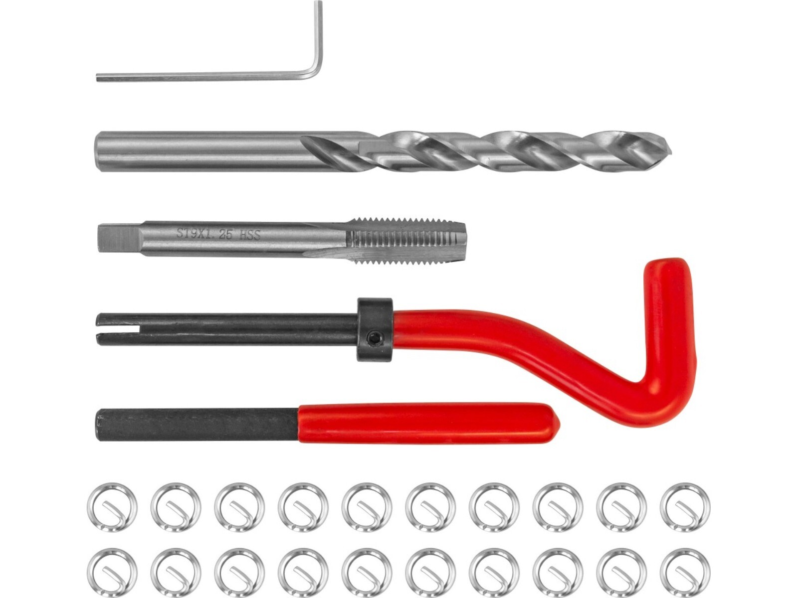 СОДЕРЖАНИЕ: ● СВЕРЛО СПИРАЛЬНОЕ ПО МЕТАЛЛУ ПО DIN 338; ● МЕТЧИК STI ПО DIN 8140-2; ● ВОРОТОК УСТАНОВОЧНЫЙ (с предохранительным кольцом для ограничения глубины); ● ДЕМОНТАЖНАЯ ОПРАВКА (для удаления поводка); ● КЛЮЧ ТОРЦЕВОЙ ШЕСТИГРАННЫЙ; ● РЕЗЬБОВЫЕ ВСТАВКИ (20 шт.).