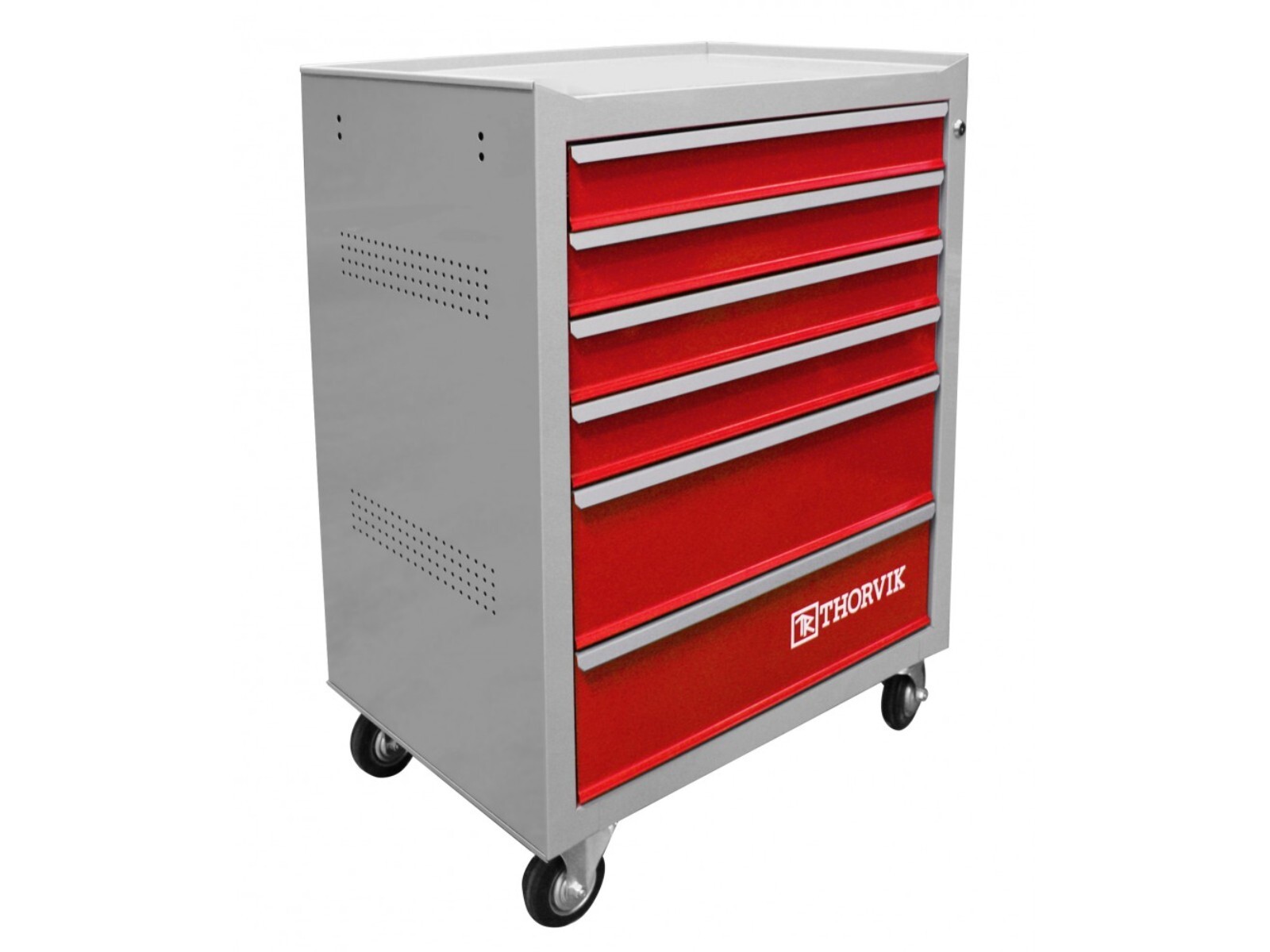 Тележка инструментальная 6-ти полочная Thorvik изготавливается в двух цветах, красный и синий. Тележка имеет антивандальный уникальный замок, полностью исключающий возможность вскрытия при помощи подручных средств. Ручки можно установить слева или справа для удобства перемещения. Полки выдерживают нагрузку до 35 кг на каждую. Область применения Инструментальные тележки Thorvik применяются для оборудования стационарных и мобильных рабочих мест в мастерских, цехах и других помещениях в качестве средств хранения и перемещения внутри рабочей зоны инструментов, специальной оснастки, запасных частей общей массой до 200 кг., необходимых для обеспечения рабочего процесса предприятия. Размеры Габариты тележки Габариты полок