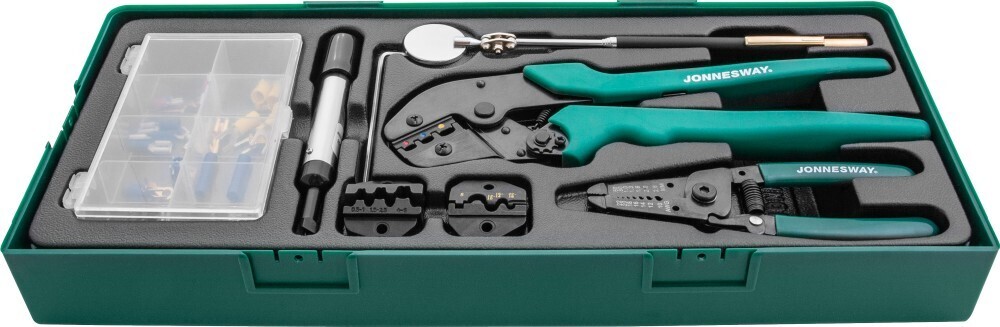 Пресс-клещи обжимные с аксессуарами и расходными материалами в ложементе Jonnesway V1311SP используются для работы с электрическими соединениями и разъемами. В комплектацию входят: клещи для разъемов V1311A; губки для изолированных соединителей 0,5 - 6 мм V1311B; губки для неизолированных разъемов - 0,5 - 6 мм V1311E; губки для трубчатых соединителей - 0,5 - 10 мм V1401; универсальные клещи для обжима и снятия изоляции AR030044; тестер напряжения 3-28В AG010131A; телескопическое смотровое зеркало с магнитом; 60 различных разъемов; шестигранный ключ 2,5 мм; и 2 винта.