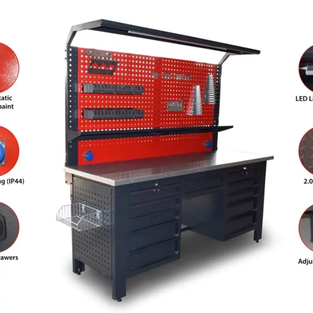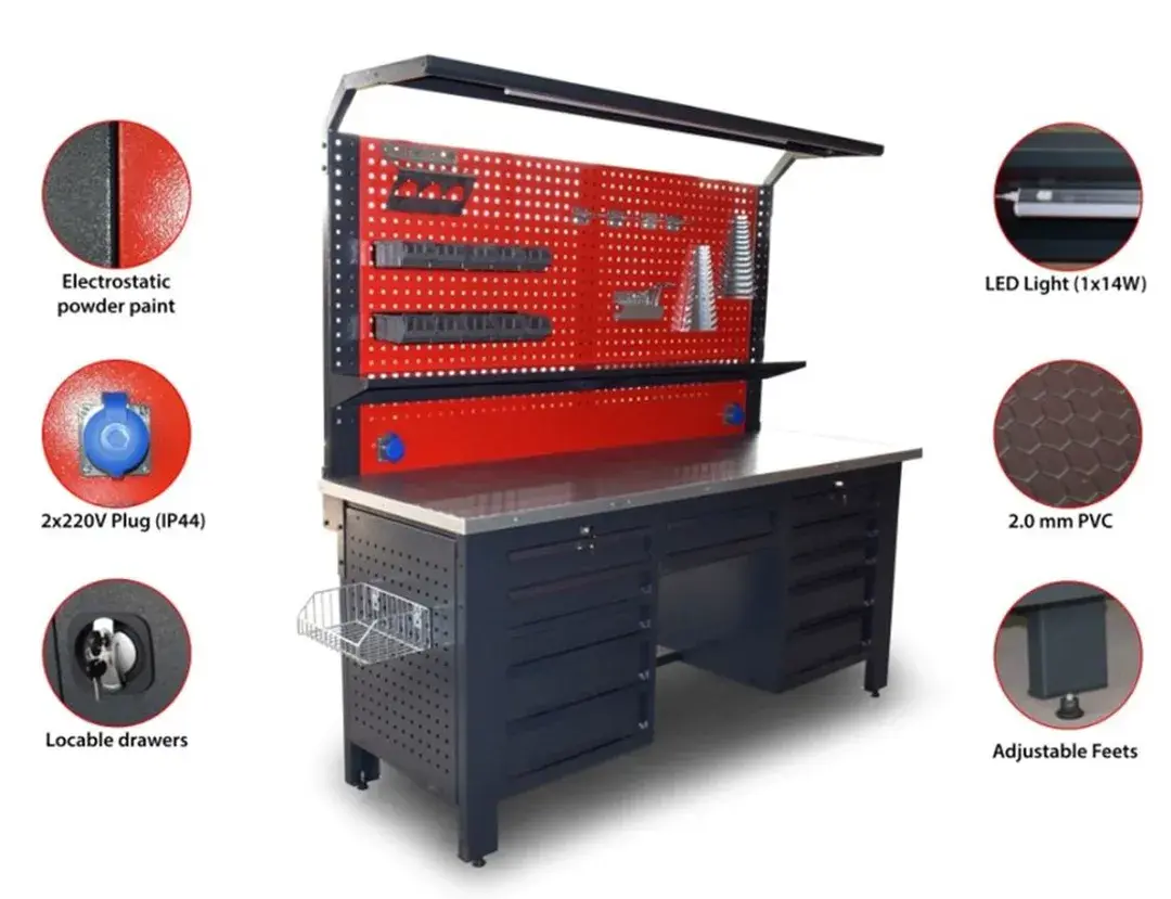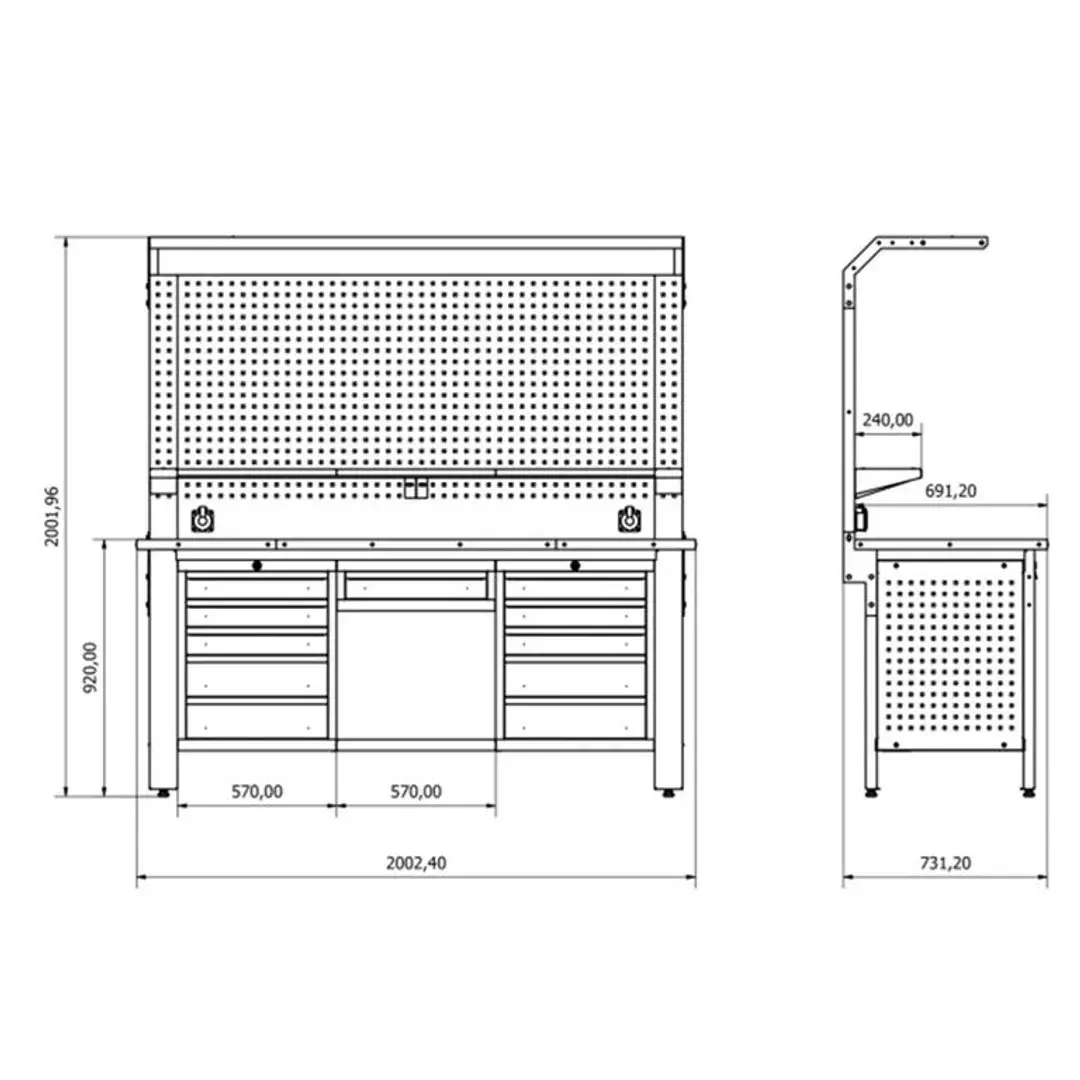 Верстак металический 730х2000х2200мм(столешница 690х2000мм,перфорация1080х2000мм,бок перфорации500х600мм,ящик навес 1-а створч.-1шт,ящик навес5 полок- RockFORCE RF-01Y0201