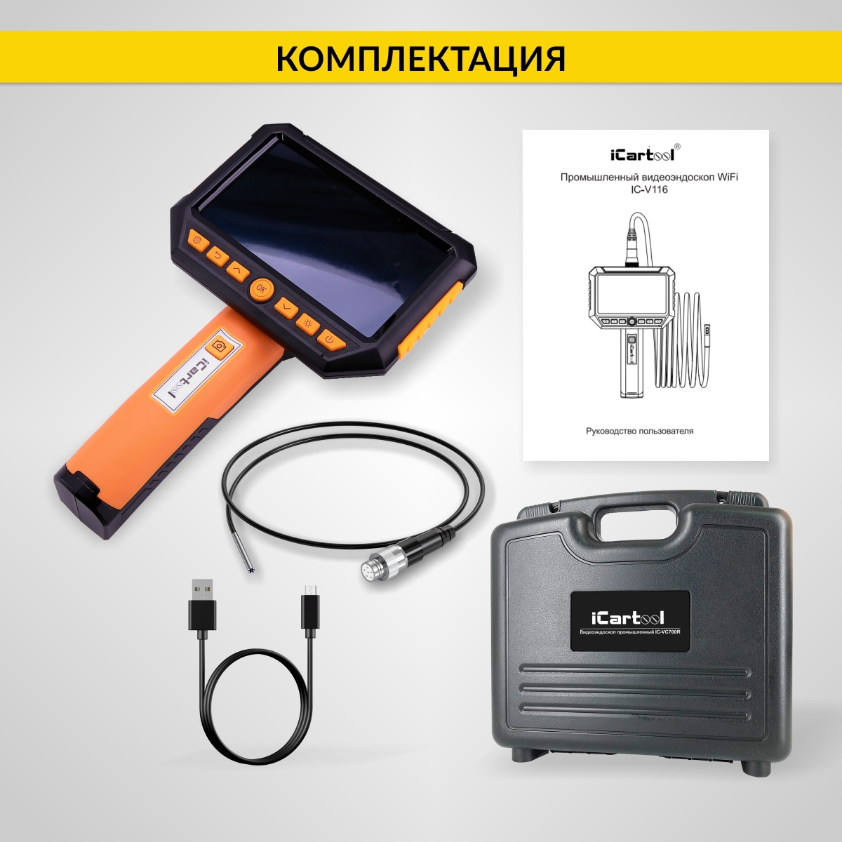 Видеоэндоскоп промышленный, экран 5", 1 камера, 2Мп, 1920х1080, 1м, 3.9 мм сменный зонд iCartool IC-V116C