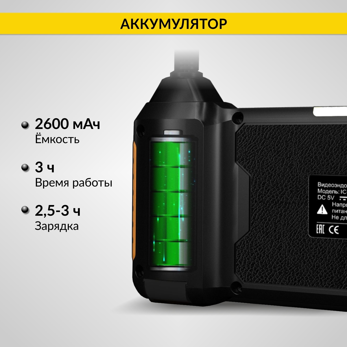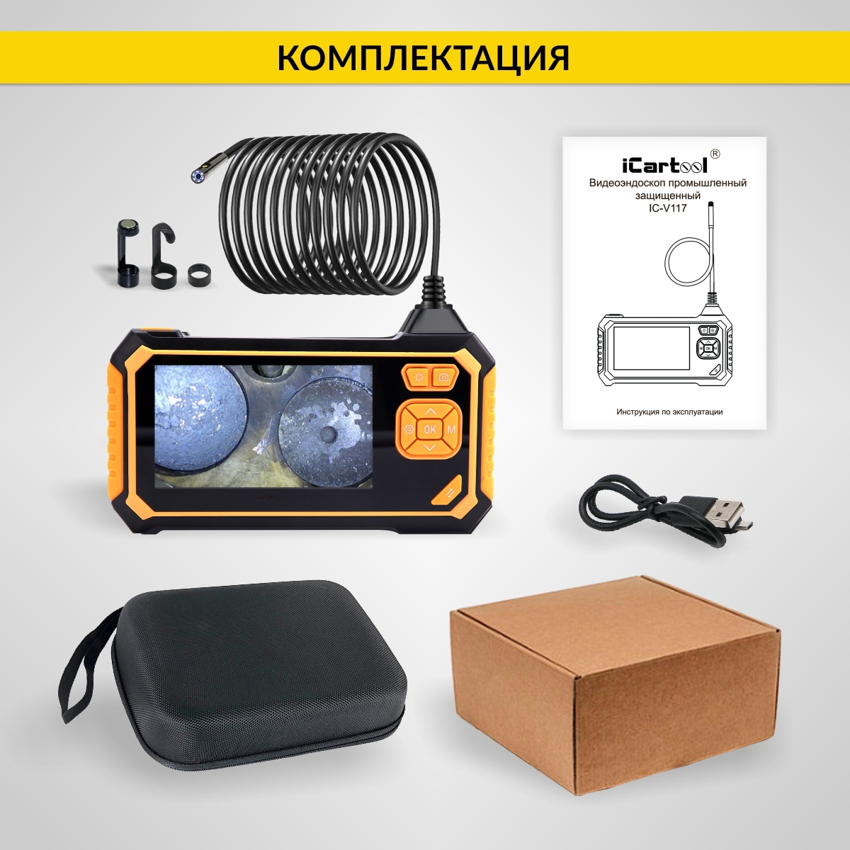 Видеоэндоскоп промышленный защищенный, 4.3", 2Мп, 2 камеры, 1920х1080, 3м, 5.5 мм, iCartool IC-V117