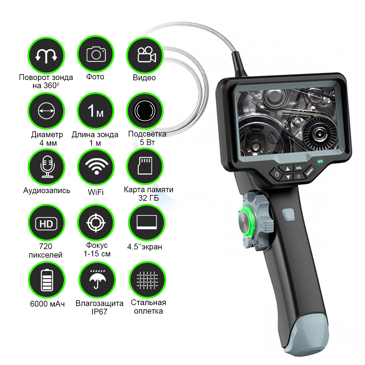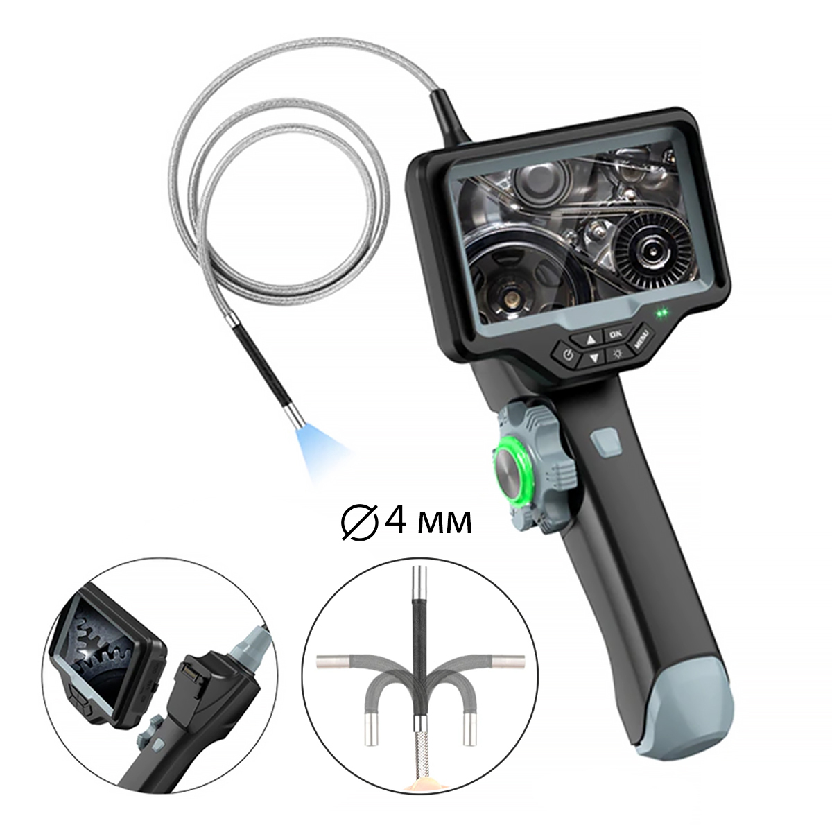 Видеоэндоскоп управляемый оптоволоконная подсветка, экран 4.5", 1Мп, 1280х720, 1м, 4мм зонд, 360° iCartool IC-VC1042WL