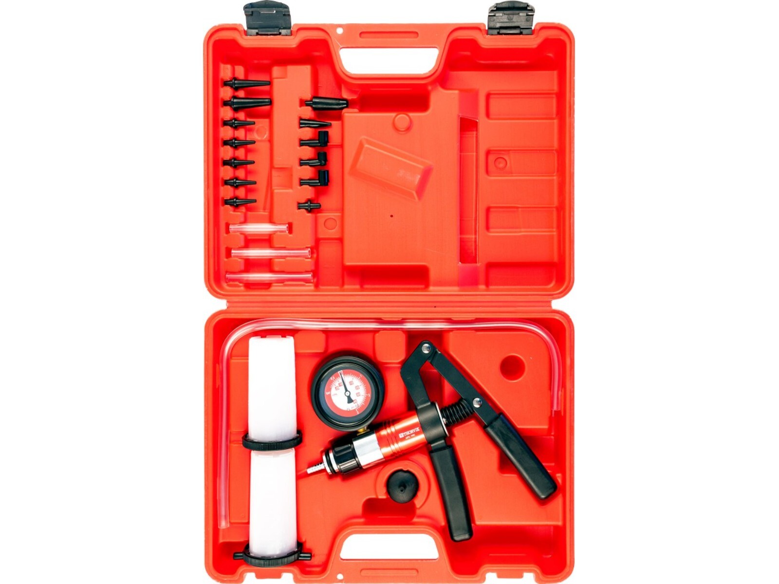СОДЕРЖАНИЕ: Насос ручной с манометром в сборе; Емкость для слива отработанной жидкости в сборе с крышкой; Шланг прозрачный в ассортименте, 5 шт.; Фитинги и переходники в ассортименте, 4 шт.; Пластиковый кейс.