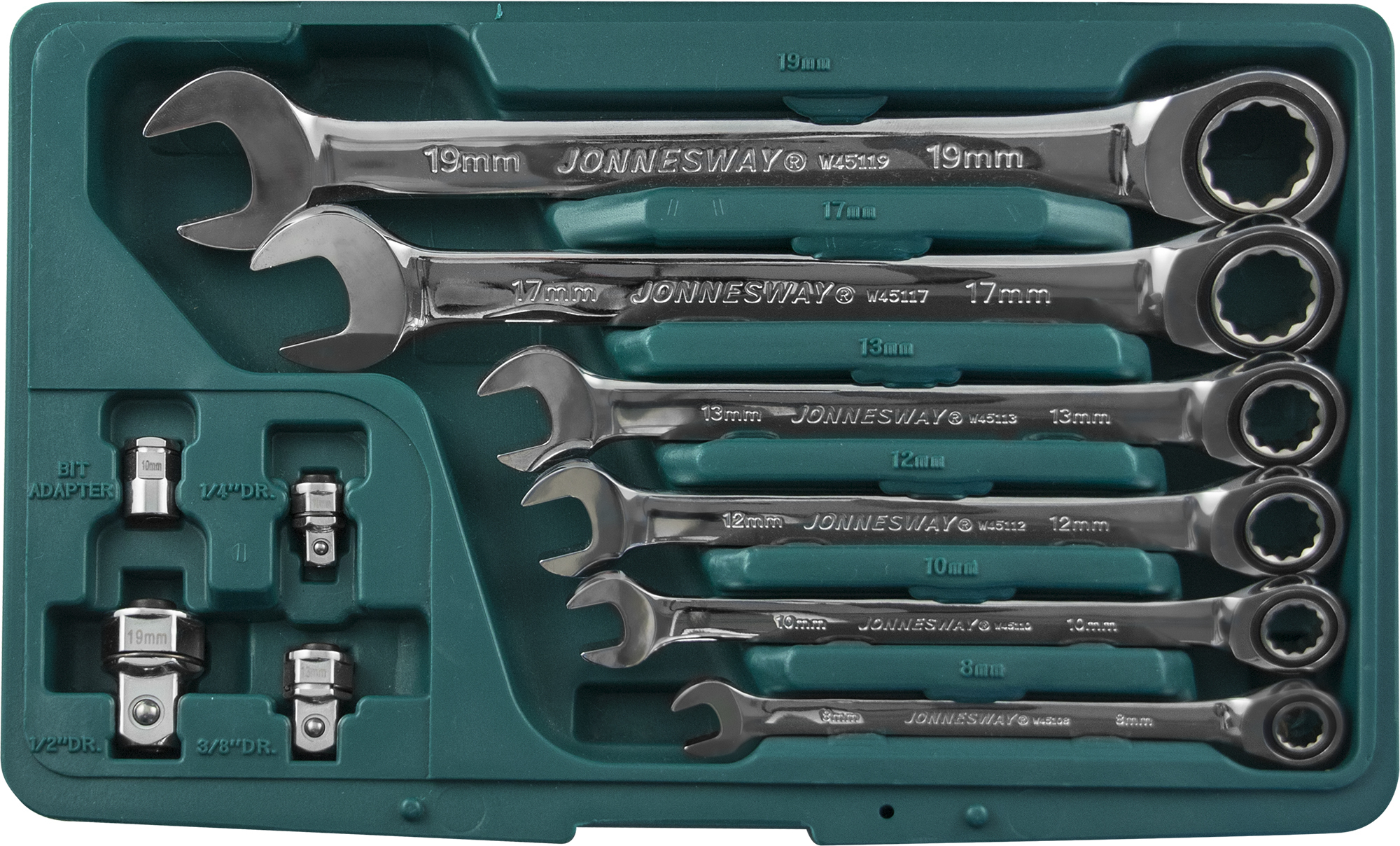 Ключи комбинированные трещоточные, 6 шт.: 8, 10, 12, 13, 17, 19 мм; Адаптеры, 3 шт.: 1/4''DR, 3/8''DR, 1/2''DR; Адаптер для бит 1/4''DR; Пластиковый кейс.