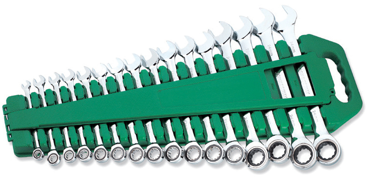 Ключи комбинированные трещоточные, 16 шт.: 8, 9, 10, 11, 12, 13, 14, 15, 16, 17, 18, 19, 21, 22, 23, 24 мм; Пластиковый держатель.
