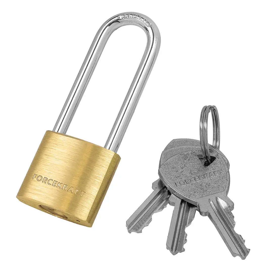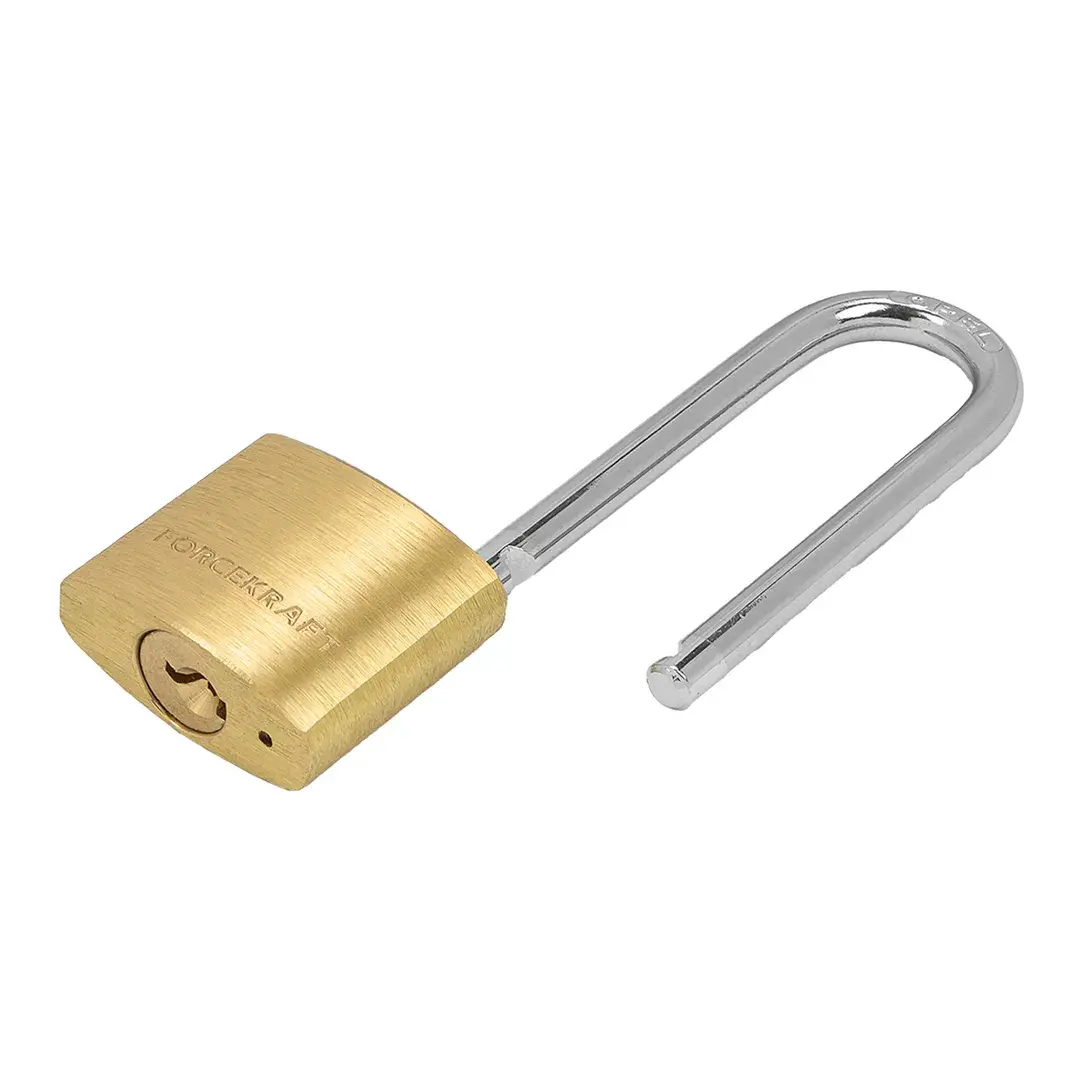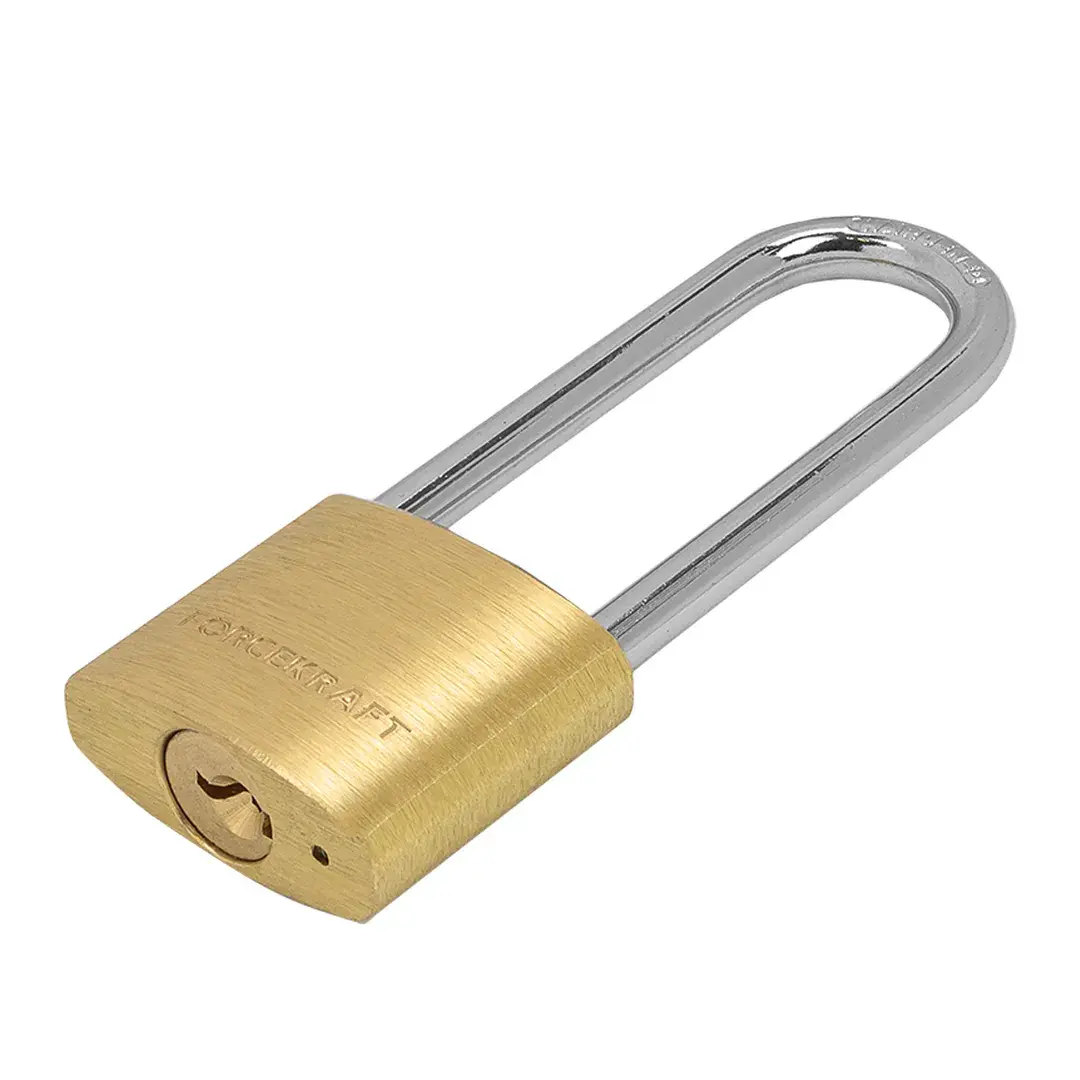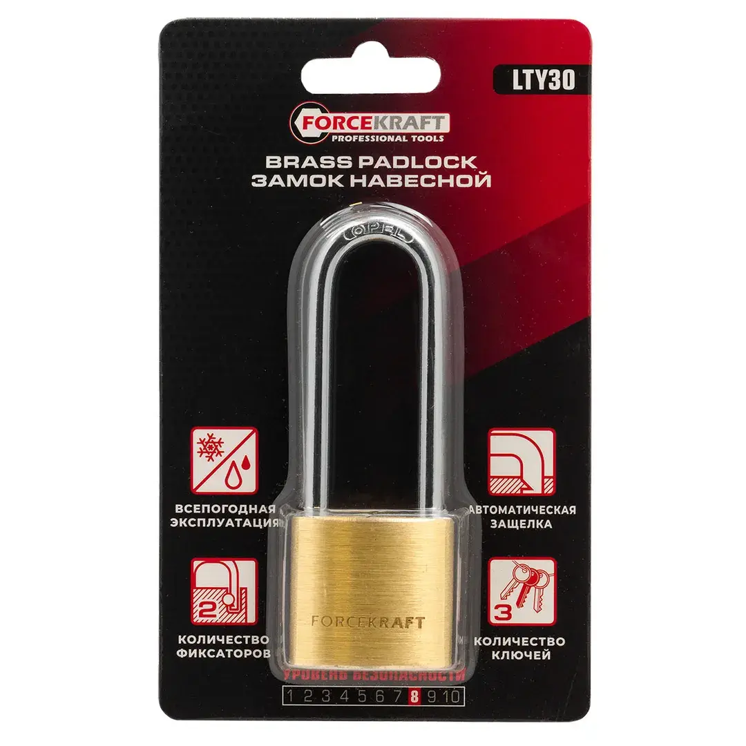 Замок навесной латунный с удлиненой дужкой 30мм (дужка 5мм, пространство для замка 50х15мм, 3 ключа) в блистере FORCEKRAFT FK-LTY30