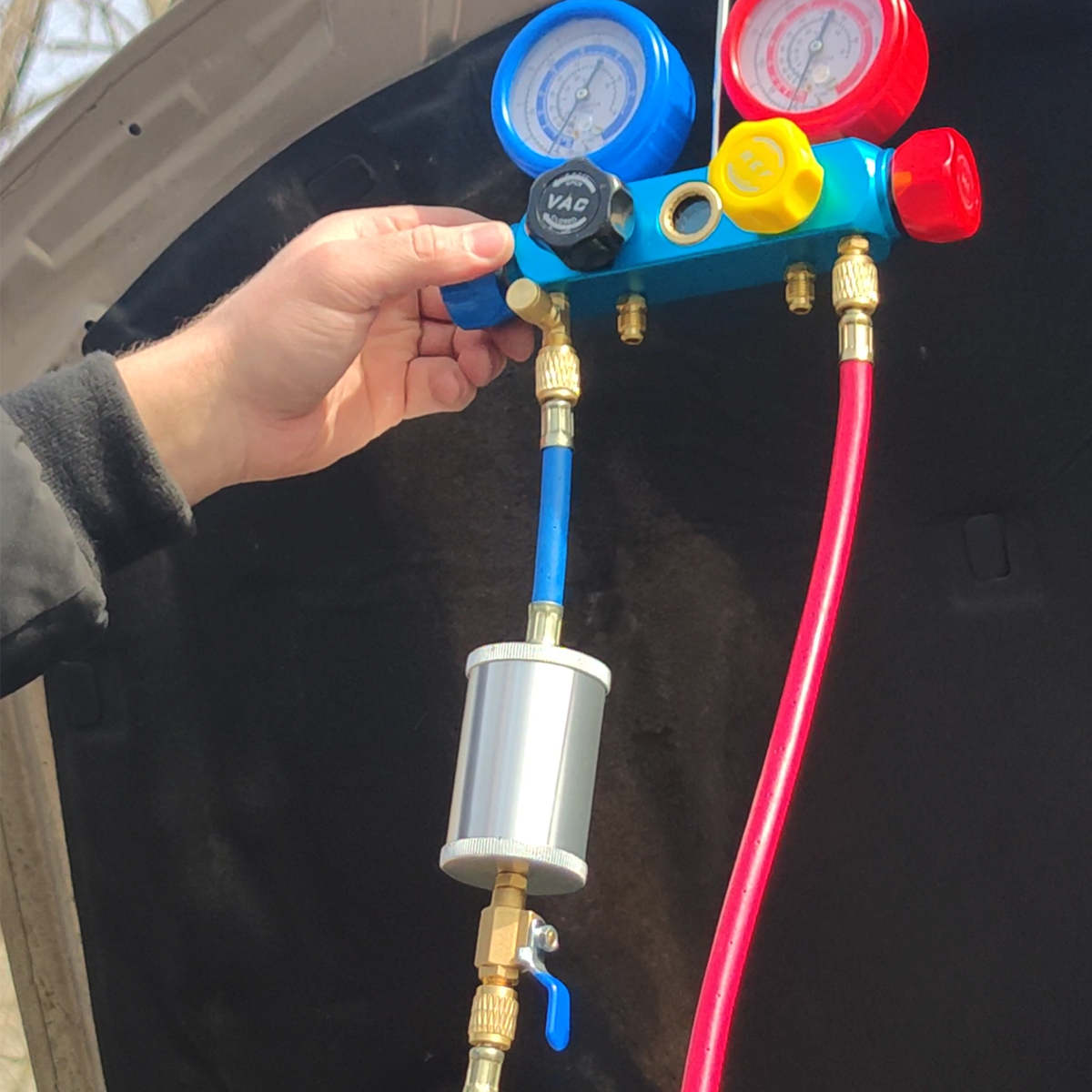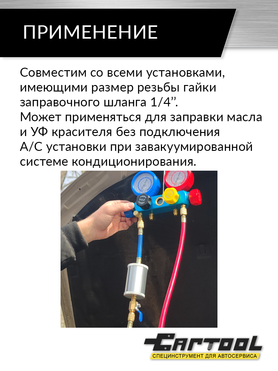 Заправочный цилиндр или инжектор для заправки масла, служит для заправки нужного количества масла или UV в систему кондиционирования. Цилиндр включается в магистраль между баллоном с фреоном и манометрическим коллектором. Необходимое количество масла заправляется с потоком хладагента. Объем цилиндра 60 мл